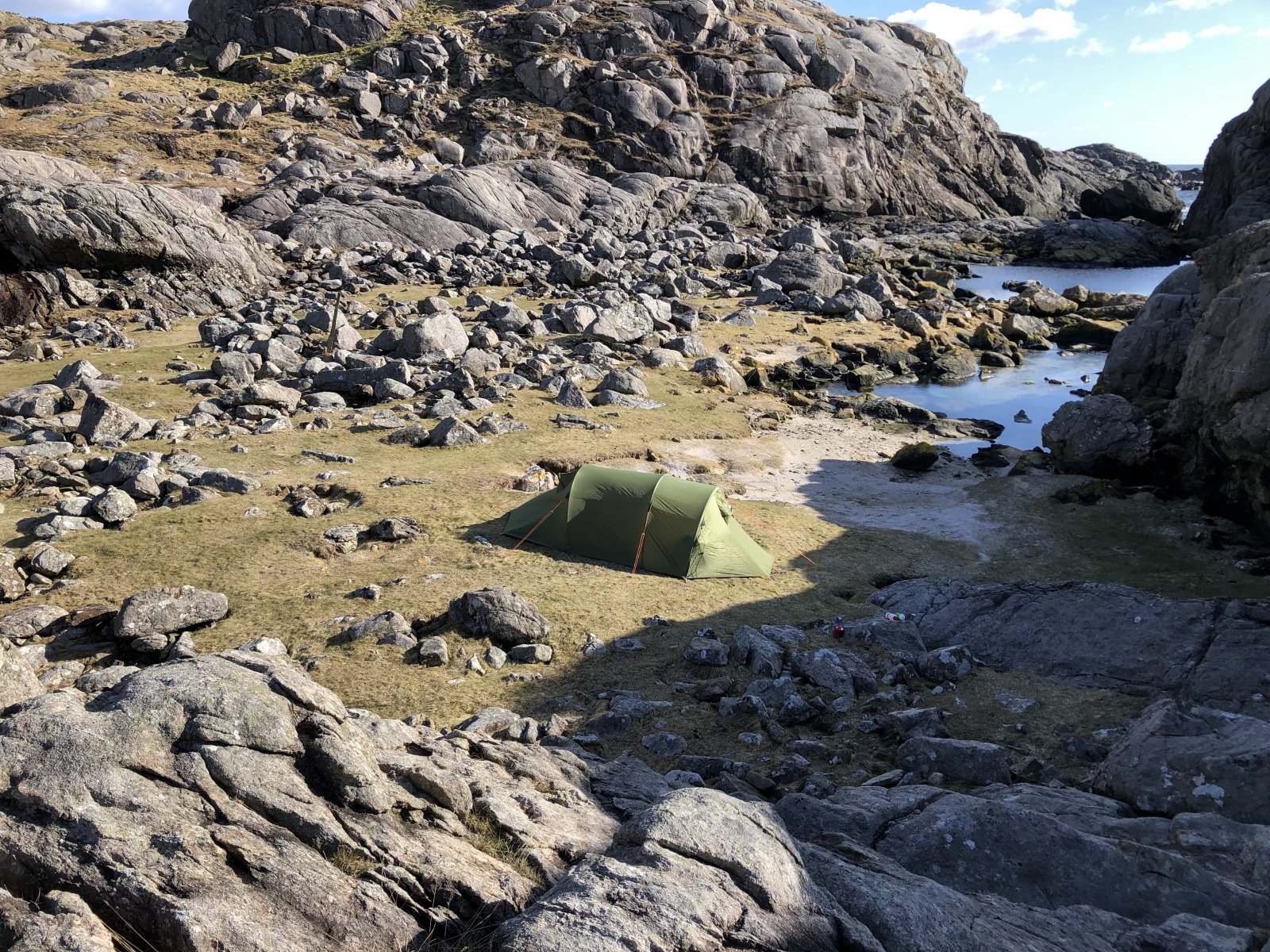 Mitt første innlegg her på forumet angående turer. Regner med det blir mange fler. Vi følte at vi måtte komme oss ut av huset litt, og planla et par dagers overnattingstur i nærområdet. Vi er jo så heldige at vi bare minutter ut av stuedøra kan finne naturperler og «vill» natur. Turen var sammen med min datter på 12år, som syntes det var storveis å være med papsen på en en liten tur. Ikke noen planer om lange vandringer, men kun nyte natur, mat, og frisk luft. (I min målestokk ble dette «Glamping») Før turen valgte jeg å legge det gamle Helsport teltet igjen, og gå til anskaffelse av et nytt telt. Valget falt på et Hilleberg Allak3. En liten pruterunde på epost til de forskjellige friluftsbutikkene, gjorde at jeg fikk en fin pris. Så mitt tips til de som er på jakt etter noe nytt, er at på tross av «tilbud» i nettbutikkene... Send en henvendelse utenom. Det er alltid noe å hente. Glampingen ble dermed med et flett nytt telt og mot alle tidligere anbefalinger lastet jeg opp teltet uten å kjenne til teltet fra før. Learing by doing. Turen gikk til Hadland. 5 minutters kjøretur ut av Egersund sentrum. Et vakkert landskap med gress sletter, og mye kupert stein. Teltplasser finnes det mange av om man ikke trenger for mye areal. Det frittstående Allak3 teltet føltes derfor som et svært godt valg. Jeg har nemlig svært god erfaring fra lengre enmannsturer i et Hilleberg Akto. Jeg har et liggende som har vært på utallige turer gjennom rundt 17 år. Det holder fremdeles god stand, og er fremdeles «som nytt» ettersom det har blitt godt ivaretatt i etterkant av hver tur. Erfaringen med Allak3 gjorde at jeg lærte meg et par ting «på ny». Å sette det opp gikk som en lek. Det var mye vind, men knusktørt under oppsett. Det jeg lærte på nytt var at man må ha i mente at når det regner sideveis, så må ikke døra åpnes helt. Det regner nemlig rett inn i teltet. Når teltet og utstyr skulle pakkes sammen gjorde vi alt klart inne i teltet, og pakket sekkene skikkelig før vi tok de med ut og plasserte de under en steinhelle i ly for været. Når jeg da tok ned teltet burde jeg selvfølgelig knipset av innerteltet og pakket det tørt før jeg tok meg av ytterteltet til slutt. Resultatet av det feiltrinnet var at alt teltmateriell... innertelt inkludert ble søkkvått. Det fikk dryppe av seg til et døgn før jeg slo det opp ute i dag i håp om at det før tørke helt. Håper det er klart til å pakkes ned i morgen. Mye tekst... sorry for det. Her er noen bilder