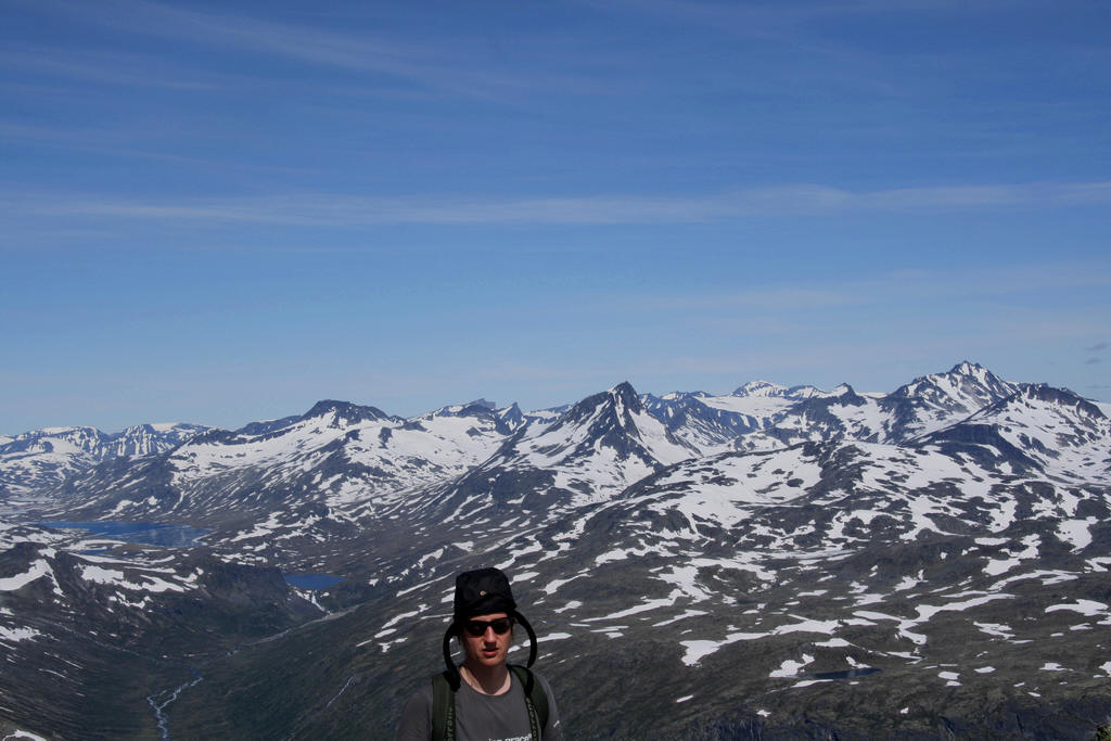 Jeg ble lagt i bilen tirsdag 8.juli for å bli kjørt til favorittområdet mitt igjen, nemlig Jotunheimen. Jeg skulle også kjøre båt denne gangen, slik at jeg fikk spart mine små ben til selve oppstigningen. Dessuten skulle jeg også møte noen av bestevennene mine på båten, to jenter på 6 og 9 år, som også skulle være med på fjellturen. På Gjendebu fikk jeg ikke være inne, og eierene min tilbøde seg også å sitte ute og spise, men det var ikke mulig å få mat ut heller. Så her måtte man improvisere litt. Jeg syntes det var veldig dårlig service at eierene mine ikke kun få mat ut, slik at de kunne spise sammen med meg! Første turdag var planen at vi skulle gå med full oppakning til høyde 1625 ved Nørdre Svartdalspiggen. Veien opp dit var tung og slitsom. Første delen var ganske greit, men over elven måtte vi krysse kratt og myrer for å komme inn i Langedalen. Planen var nemlig å gå opp på platået fra denne siden. Etter mange pauser, mest for småjentene og de voksne (jeg syntes ikke dette var så slitsomt, for jeg kan hoppe som en hare!), kom vi alle opp på platået. Eierene mine fant en fin teltplass med masse tørr og myk mose som gjorde det det behagelig å sove. Mens de voksne satte opp teltene måtte jeg passe på at området ikke ble invadert, og jaggu var det ikke en lemen som prøvde å komme inn på området vårt, men siden jeg er tøff og barsk så greide jeg å ta denne før den gjorde stor skade på teltplassen. Så var det tid for mat, jeg fikk tørrforet mitt, mens eierene mine spiste real turmat. Etter natten i teltet våknet vi til knallvær, og med utsikten fra teltet kunne ikke verden vært bedre! Frokosten ble spist ganske radig, og så var det å pakke sammen teltleieren, finne et sted å sette fra seg sekkene, og kun ta med mat og drikke til toppbestigningen. Veien opp til Nørdre Svartdalspiggen var dekket av endel snø, noen som gjorde det var ganske enkelt å gå oppover, selv om det var bratt noen steder. Snøen var stort sett hard, så det var greit å gå på. Det siste stykket opp fant vi en rute med litt klyving, her måtte eierene mine hjelpe meg et par steder, men stor sett greide jeg å finne veien selv. Med ett var vi på toppen, og for en fin utsikt det var der. Jeg tror eierene mine syntes det var utrolig fint, de tok i hvert fall mange bilder. Jeg syntes det var best å ligge å nyte utsikten samt å få masse hundegodis jeg! Etter en times tid på toppen var det på tide å komme seg nedover, vi hadde en lang tur, vi skulle helt ned til Gjendebu. Siden det var masse fin snø å ake i, akte jeg på fanget til en av eierene min ned mesteparten av snørennene. Dette var veldig gøy, og det syntes småjentene også! Etter ganske kort tid var vi nede hvor vi hadde satt sekkene med teltene. Etter en lite drikkepause, var det bare å starte nedstigningen til Svartdalen, denne var i perioder ganske bratt, men her greide jeg alt selv. Etter noen timer var vi fremme ved Gjendebu igjen, så da var det bare å slå opp teltene her igjen, og være ute, men nå var det i hvert fall fint vær. Alle var enige om at det hadde vært en drømmetur. Herbert, en liten Cairn Terrier