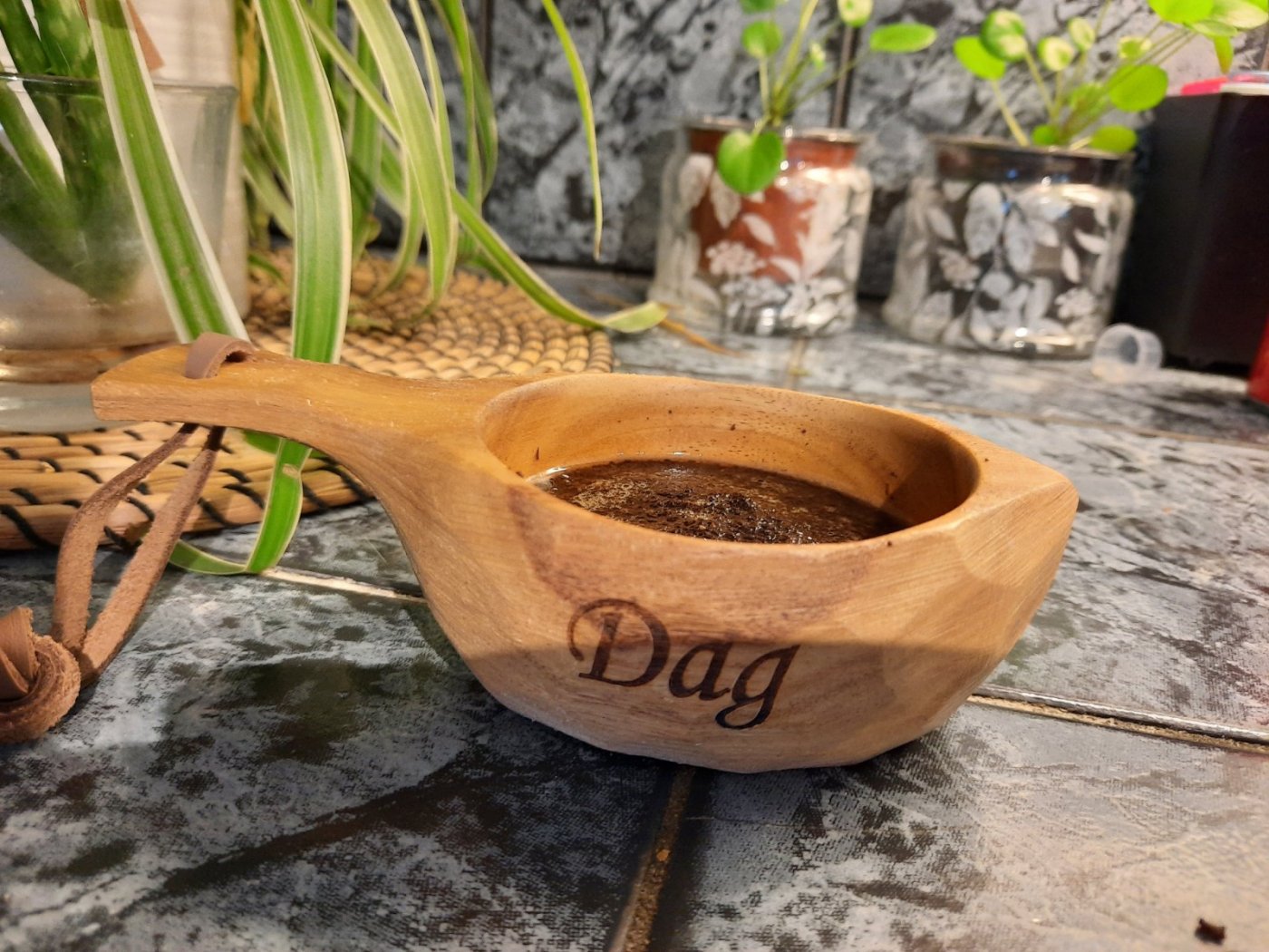 Jeg klarte til min store sorg å knekke en bit av min 12 år gamle trekopp som var god og inndrukket, og måtte derfor kjøpe ny. Valget falt på denne trekoppen, norrøn fra Eagle Products med navnet mitt på. https://www.fjelltind.no/produkt/turprodukter/eagle-produkter/trekopp-norron