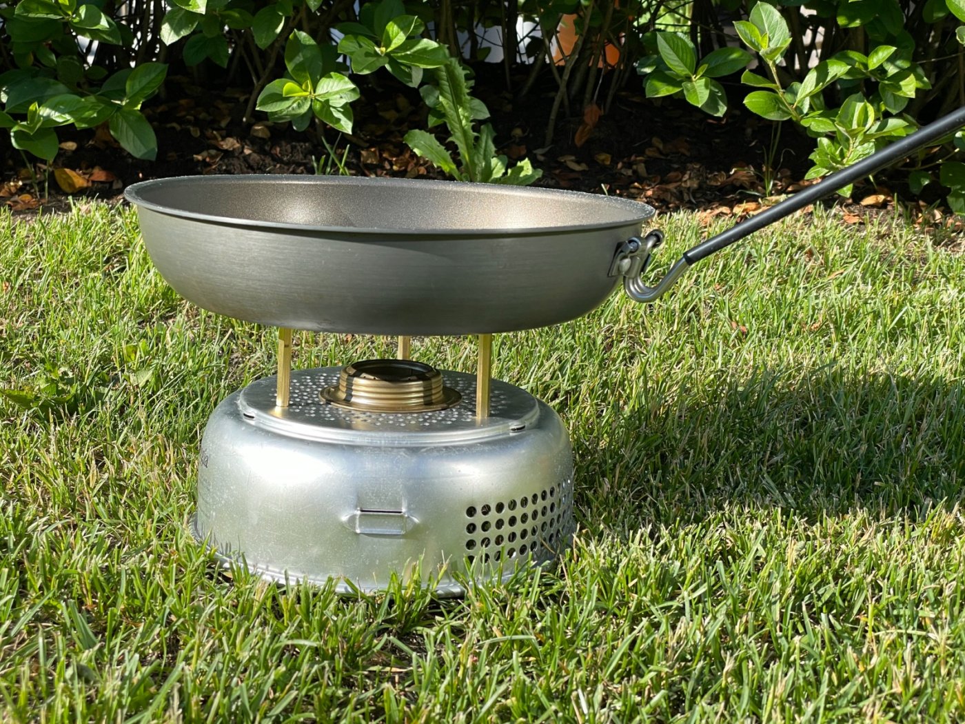 Jeg er veldig glad i mitt Trangia-kjøkken som jeg har brukt i 30 år nå. Det er imidlertid knotete hvis jeg skal bruke en litt større stekepanne eller kjele. Å sette en ekstra stor stekepanne/kjele på toppen av hele Trangia-byggverket resulterer gjerne i ustabilitet eller alt for lav temperatur pga avstanden til brenneren. Jeg tenkte derfor jeg skulle dele min egen løsning på problemet som fungerer helt utmerket. Den er enkel i bruk og tar ikke noe ekstra plass. Bildene er vel selvforklarende. «Pinnene» på bildet er 5 cm som er ypperlig til steking, men jeg har også noen på 3 cm hvis jeg vil ha bunnen nærmere flammen for å få større effekt på feks koking. Jeg bruker noen ganger 4 pinner hvis jeg vil ha ekstra stabilitet. Forøvrig bruker jeg for det meste gassbrenner, men brukte spritbrennern på disse bildene for enkelhets skyld. Du finner «pinner» og skruer på ebay: https://www.ebay.com/itm/123739424139?var=424343742938 https://www.ebay.com/itm/124721113405?var=425700253904