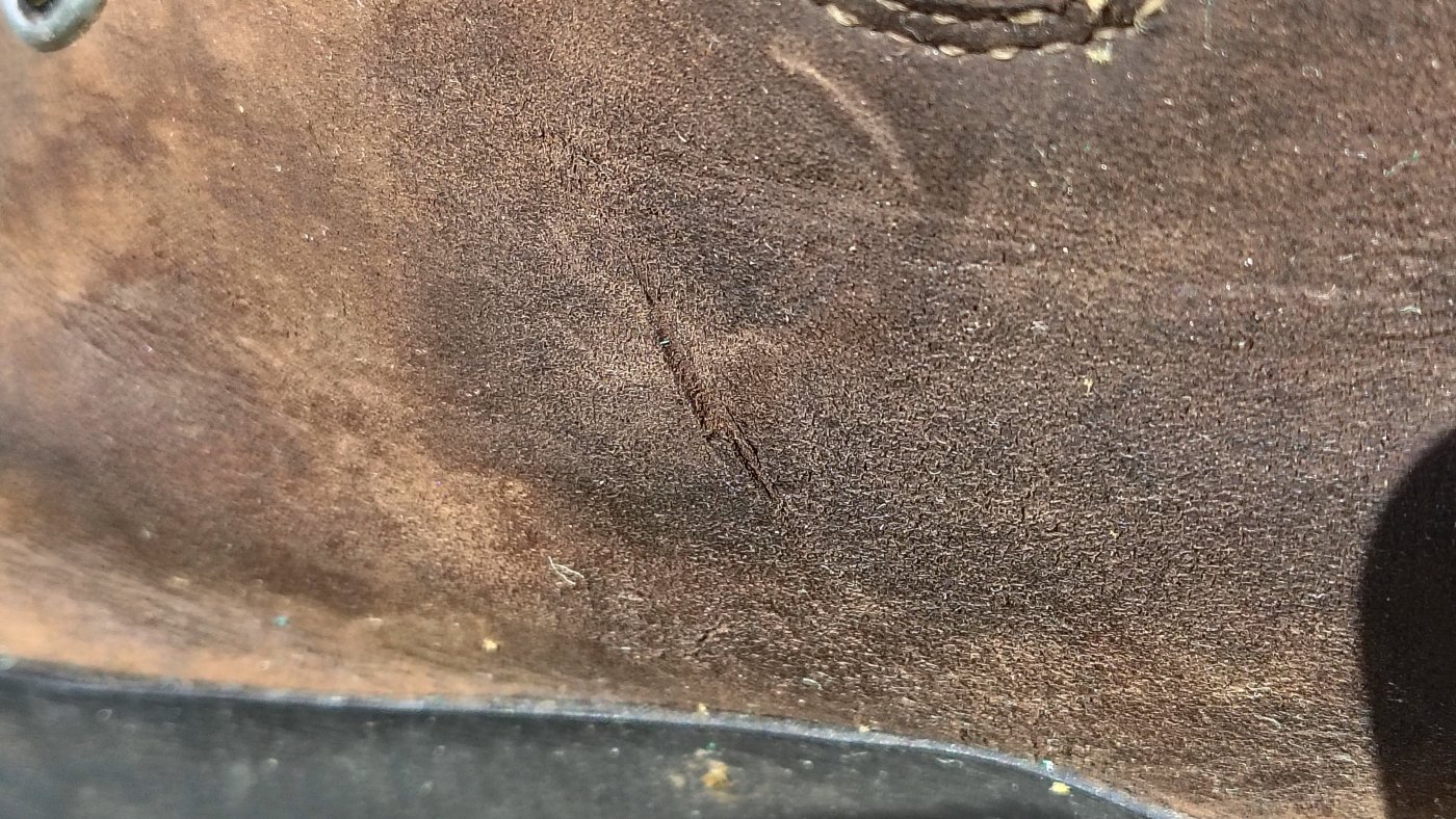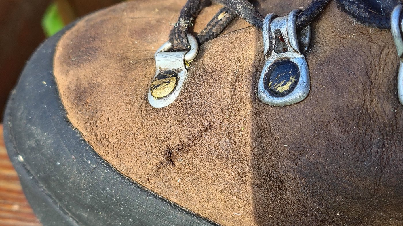 När de nya kängorna(Alfa Juvass) hade fabrikationsfel får man ta de man redan har.(det var även fel på nya regnstället och stavarna men det märktes ej vid testning före turen samt läck i ryggsäck och sk.vattentäta påsar,nya sovsäcken var dock perfekt och nya liggunderlagetok.) Garmont Dakota gtx 2.0,Sulan var 1/2 sliten började bli hal vid brant kalt berg(leta skrevor och sätt fötterna där)vid regn ena skon läcker membram fram vid tå parti där de böjs och var inte rengjorda så vaxet trängde ej in i läder och blev våta efter någon dag och nya vaxet som jag hade med höll bara några timmar. Blev en stor viktökning då blöta utanpå och fuktiga av svett inv och när man chansade och ej tog av kängor vid vad blev de lite extra våta. Men de höll och gav inga skoskav,revor av stenar gick ej igenom vilket de troligen gjort på kängor av syntet vilket jag har provat av samma märke de höll några dagar i fjällen. Trots den väl vadderade plösen var jag tvungen att snöra en känga lite löst då jag fick ont av en sena då ökar risken att snörena glider av de utv byglarna och du kan fastna i någon gren eller snubbla då de fastar i andra kängan.(Boa systemet ska vist fungera bra och då inte dessa problem men vad händer och plastlåset spricker och du ej har reservdelar med jag har alltid med extra lina till tältet vid ev storm och den går att ha till kängorna i nödfall.) Det man inte ska göra med sina kängor gjorde jag på en hytta dvs torka dem över natten utan övervakning i torkrummet. De var som sagt blöta både utanpå och invändigt och jag trodde Aldrig att de skulle torka så mkt att de krympte,sätt Inte kängorna på galler ovan stort kam element utan på golvet en bit i från eller gå och titta till dem före tex.lägg dags . De har nu krympt ca 1/2 storlek men då jag hade en tunn och en tjockare strumpa förut så får jag testa med en tunn och se om det fungerar ev får jag skavsår då och får tejpa tex häl.(vitsen med 2 strumpor är att friktionen ska ske mellan de 2 skikten och ej mot huden.) Slutsatsen har man plats och ekonomi för att ha några alternativ på lager ska de vara klara för användning dvs impregnerade,det fanns inte tid för nyköp och att testa och gå in några lika kängor som de som jag beställt. Jag gick ca 2v i Breheimen och synligt slitage på läder efter den tiden.(mellan bilden har revan efter stenkontakt gått igenom halva lädret som jag tror är 2.5 mm. Jag hade ett par Crispi Valdres men tyckte jag var för instabila då läder är betydligt tunnare och kanske revan gått in och skadat membranet om jag hade tagit dessa.(Crispi har liknande de jag använde men de köpte inte jag när jag trodde de beställda var ok) Jag har haft Mammut kängor av syntet med förstärkningar av läder men hittar ej liknande nu.