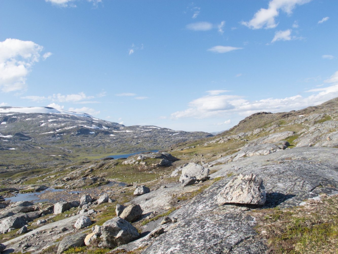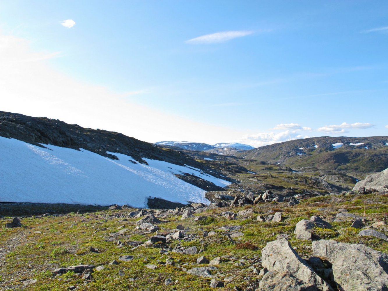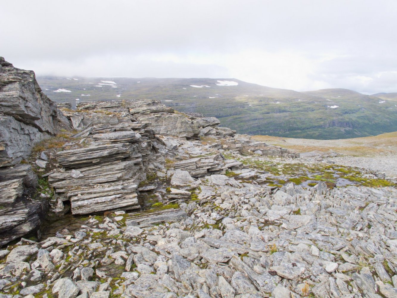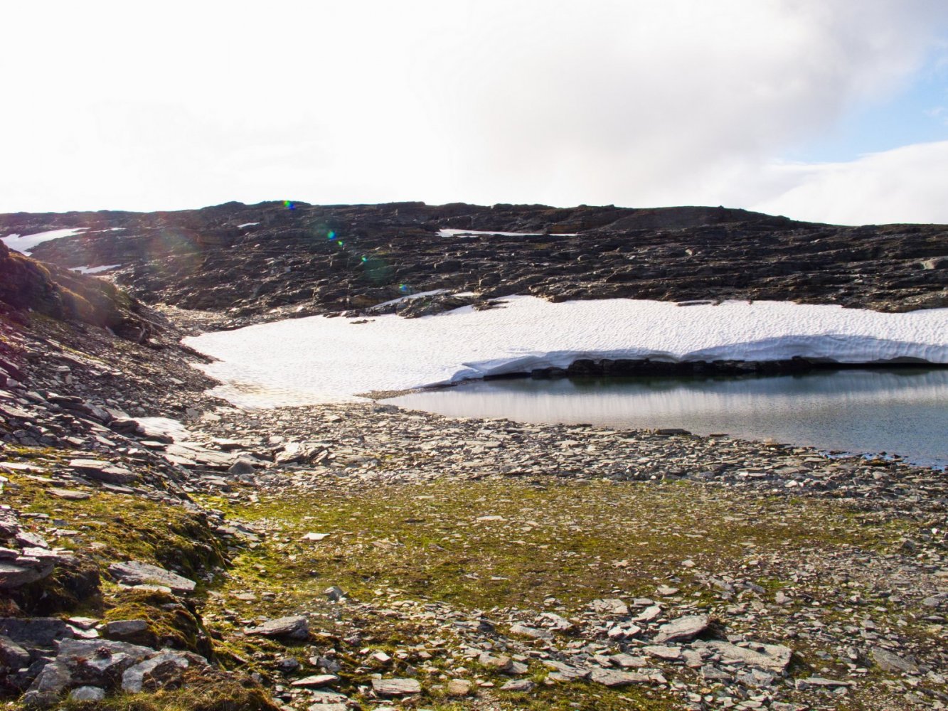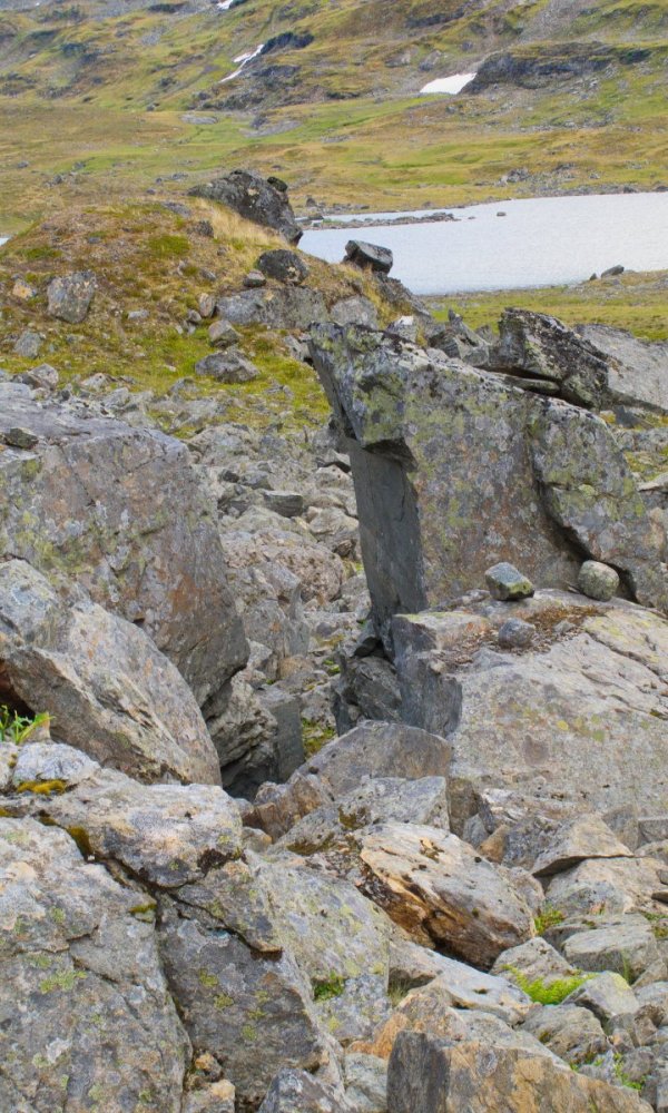 23. Letar efter en väg upp till passet med flata stenar som ligger fast går så lågt möjligt på de partier utan sten med lite växtlighet.Ett bra tips är att gå renstigarna då de gått ofta och valt den mest framkomliga dock ska man komma i håg att de ofta letar efter kvanne en stor blommig växt men de växer i mer vatten rika områden än här samt att renen har 4 ben men i stort sett väljer de en energibesparande väg speciellt i blockig terräng då detta är av stor betydelse. Stora klipp överhäng som i nödfall kan användas som nödbivack om vädret hastigt blir sämre och platsen ej lämpar sig att slå upp tält på,då kan även en vindsäck som normalt används på vintern vid raster eller vid nödsituationer här duga som ersättning för ett tält. Man kan ju när myggplågan är över använda en tarp dvs en pressänning med fästöglor för linor eller markpinnar ev kombinerat med vandringsstavar. Sten frostsprängd i stora skivor som ännu ej fallit ner än.Ganska ovanligt att det blir så flata stenar som är bra att gå på. Troligen en nästan perfekt frostsprängning nära andra sten formationer som ligger som plattor. En flock tamrenar dyker upp mitt i gattet jag planerar att gå upp i och har lagom motljus och sol på renarna. Tar lite russin och lite vatten då jag befarar att det ej blir bra rastplats på ett tag och ser på kartan efter lämplig väg mellan höjderna och följer efter höjdkurvorna istället för att korsa dessa och när det är 20m mellan så blir det fort ansträngande. Tar sikte på lämplig väg och sätter på rycksäck och drar upp huvan på jackan och knyter åt mössa och vantar ingår alltid i fjällen även på sommaren som standard utrustning men nu räcker ej en mössa i Acryl men ylle kan bli väl varmt inne i tältet(vinter huvan som jag har vid cykling vid kallt väder var tyvärr ej med) En liten fjällsjö plötsligt helt vindstilla och lite värme. Om man varit vinterbadare kunde ett dopp kanske locka men troligen + 3-5gr celsius och några kalla vad då det kyler än mer pga vatten strömarna får räcka mer än nog. Värmer sig lite i solen och lä då jag står nära berget,ser efter lämplig väg runt sjön utan att gå upp bland stora stenar. Går upp i den lilla sänkan till vänster på snöfältet och testar hur fast och hög bärighet snön har med stavarna, det börjar snabbt luta och blir lite brantare,men att gå på snön sparar mycket kraft och är lite mer avslappnande när man slipper hålla koncentrationen på topp för att ej tappa balansen och ramla vilket är lätt gjort med stor packning. Jag har gått ner från passet och turligt nog så var det samma typ av flata stenar även här som gör det mycket lättare men då jag ska ner mot Hogianvagge och går omarkerat dyker många hinder upp med branter som man ej kan gå ner i,jag letar efter vattendrag där det normalt är jämnare och säkrare att gå ner. Jag har stadiga vaderade kort kängor med värmeformande foam lika utförspjäxor som ger bra stöd för vrister och med sula som är utformad för bra grepp på is och snö som då ej blir så hal vid regn eller då man går i vattendag.(några problem med skavsår har jag aldrig haft med dessa Mamut kängor. Nackdelen med dessa kängor med Gor-Tex är att de är så täta att även fotsvett ej avdunstar så de får tas av så fort man tar en lång rast eller när man rest tältet.Och får torka inne i tältet om de ska bli helt torra. När det var dags för att leta tältplats börjar det blåsa och komma lätt hagel, då är det bra att ha ett Tält vid namn Hilleberg Unna som man reser snabbt med endast 2 långa stänger som man för in i utv stångkanaler,när detta är klart så kan man lasta in utrustningen och tältet står av sig själv och man kan sätta upp det färdigt när man vilat upp sig och vädret blivit lite bättre.Ska man använda detta på vintern bör man ha dubbla stänger eller gå upp en dimension på stängerna och ha betydligt kraftigare tältpinnar och längre ev i trä.Väven i yttertältet är tålig och klarar starkvind och snölast men det fladrar en del om ventilationshuvan men är ovärdelig vid matlagning och gör att man kan få bra ventilation och regnskydd.Största nackdelen med tältet är att man ej kommer åt den dolda Absiden från insidan utan att ta ner delar av innertältet men detta går ju att lösa med att ev byta ut hela sidan eller att sy in en dragkedja i skarvarna mellan tältdelarna,men då jag hade mycket blöta kläder en gång på turen fick jag kroka av fästena och delvis ta ner inner tältet om man ej vill gå ut och tex vända på kläderna.Jag har haft stavarna och lite annan utrustning som ej förväntas behövas i innner tältet i denna Absiden samt spännt ut den väl för att öka luftningen och därmed påskynda torkningen.En stor Bergans Trollhetta V5 95L rycksäck får plats i Absiden om man drar ihop höftbältet och sätter den på sidan för att få lite luft till yttertältet och minska kondensen som om man ej spänner ut absiderna väl och ej har öppet dragkedjan under skyddshuvan kan bli påtaglig,Jag har även haft en bit liggunderlag under säcken för att skydda mot kondens och nedsmutsning. Efter 3dl havregryn och med planerat snacks av egentillverkade energikakor som av misstag torkats lite för länge och därmed fick läggas i blöt med grynen och svälla sedan kvällen innan,samt 4-6 skivor hårt wasa frukostknäcke med smör som vissa mornar var som en gul betongklump men sedan lagrades med osten inne i innertältet då det var lite lättare att breda ut 24m lagrad präst ost smakar bra till. Självklart använder jag Trangia 25 ha med primus org brännare då slipper man oroa sig för att köket välter och tältet fattar eld och med allvarliga personskador(en mindre fickkniv bör man ändå ha i fickan om det trots stor försiktighet kan gå fel ska man snabbt kunna ta sig ut genom tältduken),ställer man ba
