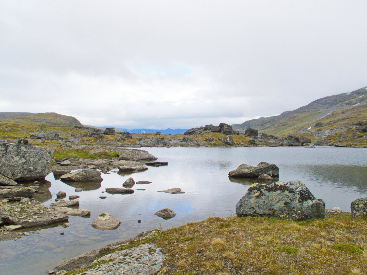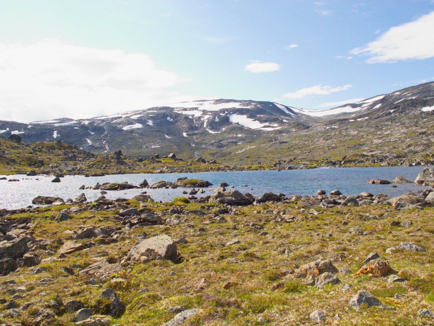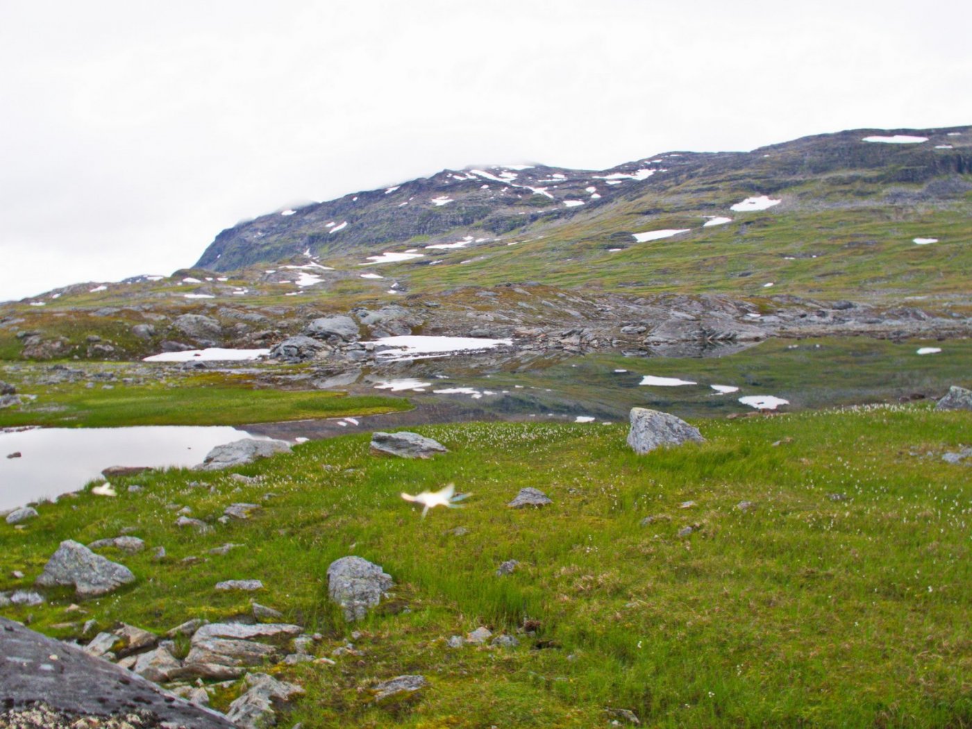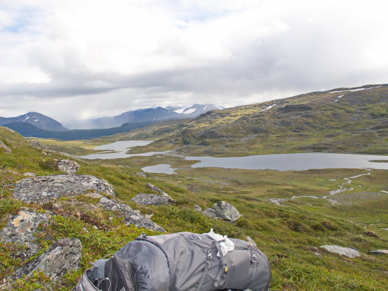 23. Letar efter en väg upp till passet med flata stenar som ligger fast går så lågt möjligt på de partier utan sten med lite växtlighet.Ett bra tips är att gå renstigarna då de gått ofta och valt den mest framkomliga dock ska man komma i håg att de ofta letar efter kvanne en stor blommig växt men de växer i mer vatten rika områden än här samt att renen har 4 ben men i stort sett väljer de en energibesparande väg speciellt i blockig terräng då detta är av stor betydelse. Stora klipp överhäng som i nödfall kan användas som nödbivack om vädret hastigt blir sämre och platsen ej lämpar sig att slå upp tält på,då kan även en vindsäck som normalt används på vintern vid raster eller vid nödsituationer här duga som ersättning för ett tält. Man kan ju när myggplågan är över använda en tarp dvs en pressänning med fästöglor för linor eller markpinnar ev kombinerat med vandringsstavar. Sten frostsprängd i stora skivor som ännu ej fallit ner än.Ganska ovanligt att det blir så flata stenar som är bra att gå på. Troligen en nästan perfekt frostsprängning nära andra sten formationer som ligger som plattor. En flock tamrenar dyker upp mitt i gattet jag planerar att gå upp i och har lagom motljus och sol på renarna. Tar lite russin och lite vatten då jag befarar att det ej blir bra rastplats på ett tag och ser på kartan efter lämplig väg mellan höjderna och följer efter höjdkurvorna istället för att korsa dessa och när det är 20m mellan så blir det fort ansträngande. Tar sikte på lämplig väg och sätter på rycksäck och drar upp huvan på jackan och knyter åt mössa och vantar ingår alltid i fjällen även på sommaren som standard utrustning men nu räcker ej en mössa i Acryl men ylle kan bli väl varmt inne i tältet(vinter huvan som jag har vid cykling vid kallt väder var tyvärr ej med) En liten fjällsjö plötsligt helt vindstilla och lite värme. Om man varit vinterbadare kunde ett dopp kanske locka men troligen + 3-5gr celsius och några kalla vad då det kyler än mer pga vatten strömarna får räcka mer än nog. Värmer sig lite i solen och lä då jag står nära berget,ser efter lämplig väg runt sjön utan att gå upp bland stora stenar. Går upp i den lilla sänkan till vänster på snöfältet och testar hur fast och hög bärighet snön har med stavarna, det börjar snabbt luta och blir lite brantare,men att gå på snön sparar mycket kraft och är lite mer avslappnande när man slipper hålla koncentrationen på topp för att ej tappa balansen och ramla vilket är lätt gjort med stor packning. Jag har gått ner från passet och turligt nog så var det samma typ av flata stenar även här som gör det mycket lättare men då jag ska ner mot Hogianvagge och går omarkerat dyker många hinder upp med branter som man ej kan gå ner i,jag letar efter vattendrag där det normalt är jämnare och säkrare att gå ner. Jag har stadiga vaderade kort kängor med värmeformande foam lika utförspjäxor som ger bra stöd för vrister och med sula som är utformad för bra grepp på is och snö som då ej blir så hal vid regn eller då man går i vattendag.(några problem med skavsår har jag aldrig haft med dessa Mamut kängor. Nackdelen med dessa kängor med Gor-Tex är att de är så täta att även fotsvett ej avdunstar så de får tas av så fort man tar en lång rast eller när man rest tältet.Och får torka inne i tältet om de ska bli helt torra. När det var dags för att leta tältplats börjar det blåsa och komma lätt hagel, då är det bra att ha ett Tält vid namn Hilleberg Unna som man reser snabbt med endast 2 långa stänger som man för in i utv stångkanaler,när detta är klart så kan man lasta in utrustningen och tältet står av sig själv och man kan sätta upp det färdigt när man vilat upp sig och vädret blivit lite bättre.Ska man använda detta på vintern bör man ha dubbla stänger eller gå upp en dimension på stängerna och ha betydligt kraftigare tältpinnar och längre ev i trä.Väven i yttertältet är tålig och klarar starkvind och snölast men det fladrar en del om ventilationshuvan men är ovärdelig vid matlagning och gör att man kan få bra ventilation och regnskydd.Största nackdelen med tältet är att man ej kommer åt den dolda Absiden från insidan utan att ta ner delar av innertältet men detta går ju att lösa med att ev byta ut hela sidan eller att sy in en dragkedja i skarvarna mellan tältdelarna,men då jag hade mycket blöta kläder en gång på turen fick jag kroka av fästena och delvis ta ner inner tältet om man ej vill gå ut och tex vända på kläderna.Jag har haft stavarna och lite annan utrustning som ej förväntas behövas i innner tältet i denna Absiden samt spännt ut den väl för att öka luftningen och därmed påskynda torkningen.En stor Bergans Trollhetta V5 95L rycksäck får plats i Absiden om man drar ihop höftbältet och sätter den på sidan för att få lite luft till yttertältet och minska kondensen som om man ej spänner ut absiderna väl och ej har öppet dragkedjan under skyddshuvan kan bli påtaglig,Jag har även haft en bit liggunderlag under säcken för att skydda mot kondens och nedsmutsning. Efter 3dl havregryn och med planerat snacks av egentillverkade energikakor som av misstag torkats lite för länge och därmed fick läggas i blöt med grynen och svälla sedan kvällen innan,samt 4-6 skivor hårt wasa frukostknäcke med smör som vissa mornar var som en gul betongklump men sedan lagrades med osten inne i innertältet då det var lite lättare att breda ut 24m lagrad präst ost smakar bra till. Självklart använder jag Trangia 25 ha med primus org brännare då slipper man oroa sig för att köket välter och tältet fattar eld och med allvarliga personskador(en mindre fickkniv bör man ändå ha i fickan om det trots stor försiktighet kan gå fel ska man snabbt kunna ta sig ut genom tältduken),ställer man ba