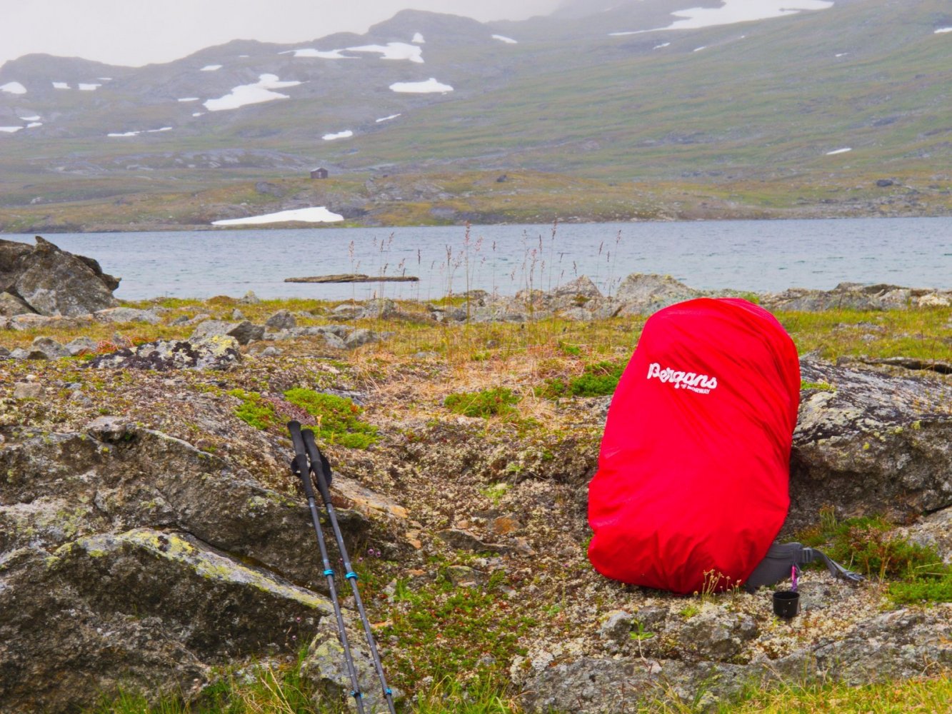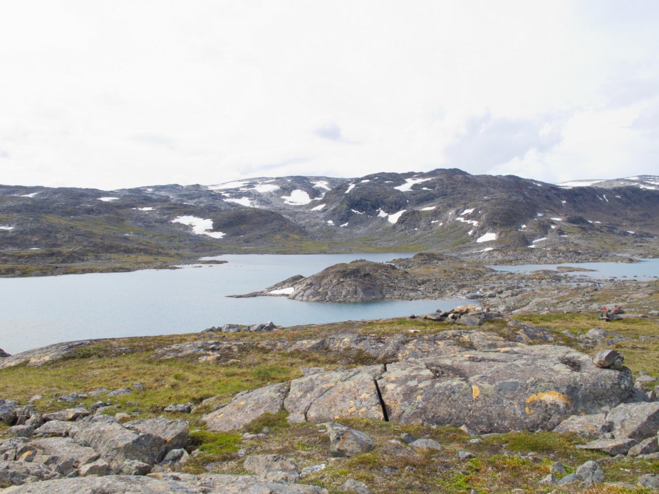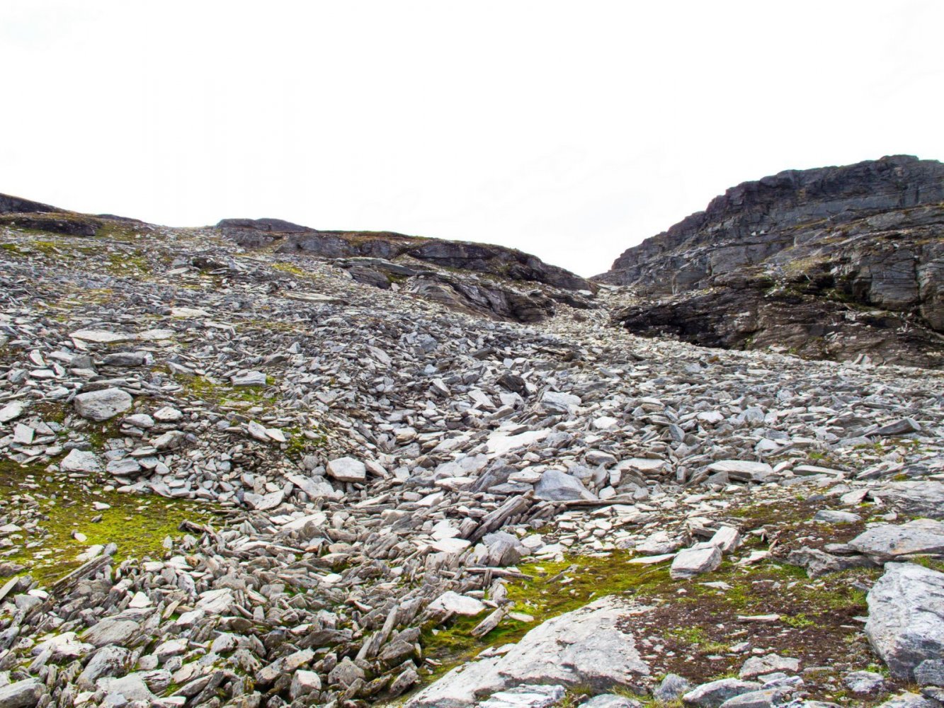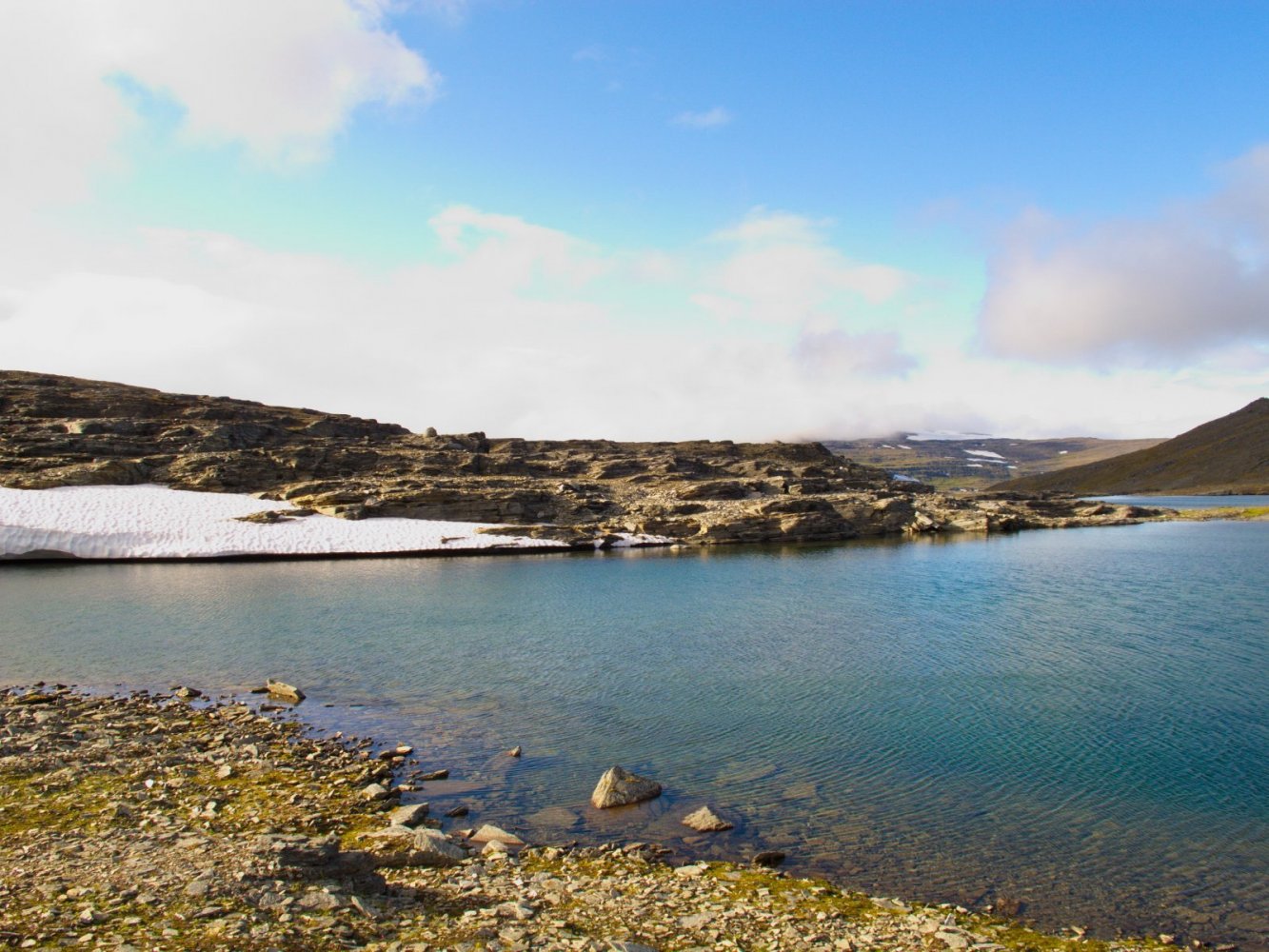 23. Letar efter en väg upp till passet med flata stenar som ligger fast går så lågt möjligt på de partier utan sten med lite växtlighet.Ett bra tips är att gå renstigarna då de gått ofta och valt den mest framkomliga dock ska man komma i håg att de ofta letar efter kvanne en stor blommig växt men de växer i mer vatten rika områden än här samt att renen har 4 ben men i stort sett väljer de en energibesparande väg speciellt i blockig terräng då detta är av stor betydelse. Stora klipp överhäng som i nödfall kan användas som nödbivack om vädret hastigt blir sämre och platsen ej lämpar sig att slå upp tält på,då kan även en vindsäck som normalt används på vintern vid raster eller vid nödsituationer här duga som ersättning för ett tält. Man kan ju när myggplågan är över använda en tarp dvs en pressänning med fästöglor för linor eller markpinnar ev kombinerat med vandringsstavar. Sten frostsprängd i stora skivor som ännu ej fallit ner än.Ganska ovanligt att det blir så flata stenar som är bra att gå på. Troligen en nästan perfekt frostsprängning nära andra sten formationer som ligger som plattor. En flock tamrenar dyker upp mitt i gattet jag planerar att gå upp i och har lagom motljus och sol på renarna. Tar lite russin och lite vatten då jag befarar att det ej blir bra rastplats på ett tag och ser på kartan efter lämplig väg mellan höjderna och följer efter höjdkurvorna istället för att korsa dessa och när det är 20m mellan så blir det fort ansträngande. Tar sikte på lämplig väg och sätter på rycksäck och drar upp huvan på jackan och knyter åt mössa och vantar ingår alltid i fjällen även på sommaren som standard utrustning men nu räcker ej en mössa i Acryl men ylle kan bli väl varmt inne i tältet(vinter huvan som jag har vid cykling vid kallt väder var tyvärr ej med) En liten fjällsjö plötsligt helt vindstilla och lite värme. Om man varit vinterbadare kunde ett dopp kanske locka men troligen + 3-5gr celsius och några kalla vad då det kyler än mer pga vatten strömarna får räcka mer än nog. Värmer sig lite i solen och lä då jag står nära berget,ser efter lämplig väg runt sjön utan att gå upp bland stora stenar. Går upp i den lilla sänkan till vänster på snöfältet och testar hur fast och hög bärighet snön har med stavarna, det börjar snabbt luta och blir lite brantare,men att gå på snön sparar mycket kraft och är lite mer avslappnande när man slipper hålla koncentrationen på topp för att ej tappa balansen och ramla vilket är lätt gjort med stor packning. Jag har gått ner från passet och turligt nog så var det samma typ av flata stenar även här som gör det mycket lättare men då jag ska ner mot Hogianvagge och går omarkerat dyker många hinder upp med branter som man ej kan gå ner i,jag letar efter vattendrag där det normalt är jämnare och säkrare att gå ner. Jag har stadiga vaderade kort kängor med värmeformande foam lika utförspjäxor som ger bra stöd för vrister och med sula som är utformad för bra grepp på is och snö som då ej blir så hal vid regn eller då man går i vattendag.(några problem med skavsår har jag aldrig haft med dessa Mamut kängor. Nackdelen med dessa kängor med Gor-Tex är att de är så täta att även fotsvett ej avdunstar så de får tas av så fort man tar en lång rast eller när man rest tältet.Och får torka inne i tältet om de ska bli helt torra. När det var dags för att leta tältplats börjar det blåsa och komma lätt hagel, då är det bra att ha ett Tält vid namn Hilleberg Unna som man reser snabbt med endast 2 långa stänger som man för in i utv stångkanaler,när detta är klart så kan man lasta in utrustningen och tältet står av sig själv och man kan sätta upp det färdigt när man vilat upp sig och vädret blivit lite bättre.Ska man använda detta på vintern bör man ha dubbla stänger eller gå upp en dimension på stängerna och ha betydligt kraftigare tältpinnar och längre ev i trä.Väven i yttertältet är tålig och klarar starkvind och snölast men det fladrar en del om ventilationshuvan men är ovärdelig vid matlagning och gör att man kan få bra ventilation och regnskydd.Största nackdelen med tältet är att man ej kommer åt den dolda Absiden från insidan utan att ta ner delar av innertältet men detta går ju att lösa med att ev byta ut hela sidan eller att sy in en dragkedja i skarvarna mellan tältdelarna,men då jag hade mycket blöta kläder en gång på turen fick jag kroka av fästena och delvis ta ner inner tältet om man ej vill gå ut och tex vända på kläderna.Jag har haft stavarna och lite annan utrustning som ej förväntas behövas i innner tältet i denna Absiden samt spännt ut den väl för att öka luftningen och därmed påskynda torkningen.En stor Bergans Trollhetta V5 95L rycksäck får plats i Absiden om man drar ihop höftbältet och sätter den på sidan för att få lite luft till yttertältet och minska kondensen som om man ej spänner ut absiderna väl och ej har öppet dragkedjan under skyddshuvan kan bli påtaglig,Jag har även haft en bit liggunderlag under säcken för att skydda mot kondens och nedsmutsning. Efter 3dl havregryn och med planerat snacks av egentillverkade energikakor som av misstag torkats lite för länge och därmed fick läggas i blöt med grynen och svälla sedan kvällen innan,samt 4-6 skivor hårt wasa frukostknäcke med smör som vissa mornar var som en gul betongklump men sedan lagrades med osten inne i innertältet då det var lite lättare att breda ut 24m lagrad präst ost smakar bra till. Självklart använder jag Trangia 25 ha med primus org brännare då slipper man oroa sig för att köket välter och tältet fattar eld och med allvarliga personskador(en mindre fickkniv bör man ändå ha i fickan om det trots stor försiktighet kan gå fel ska man snabbt kunna ta sig ut genom tältduken),ställer man ba