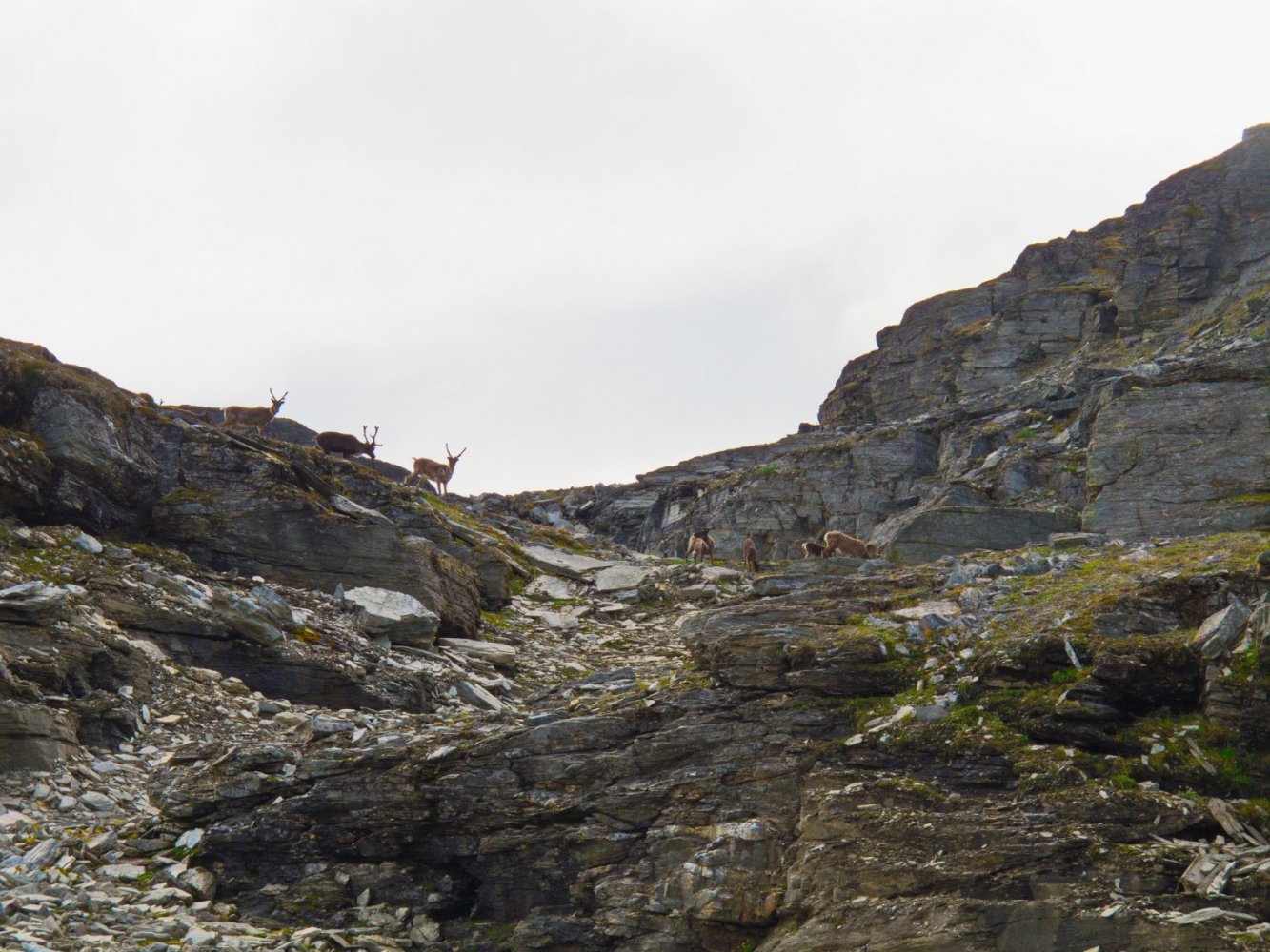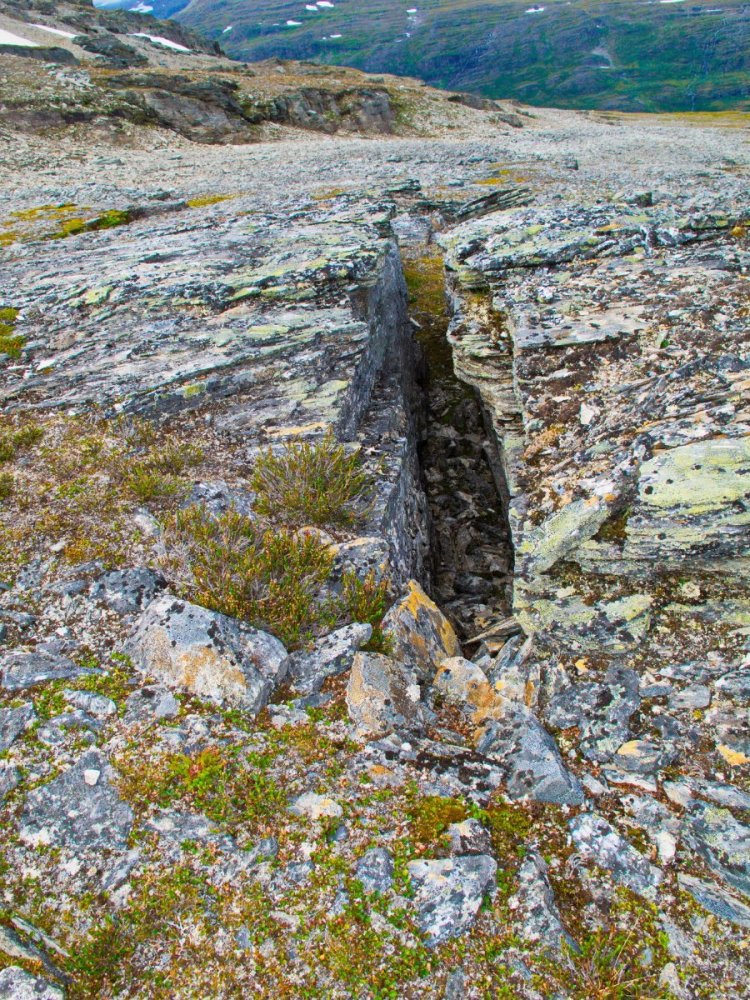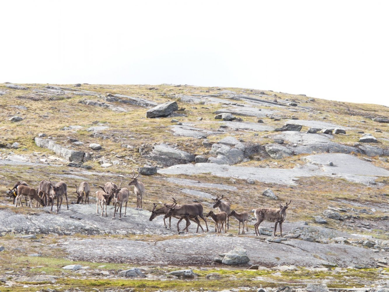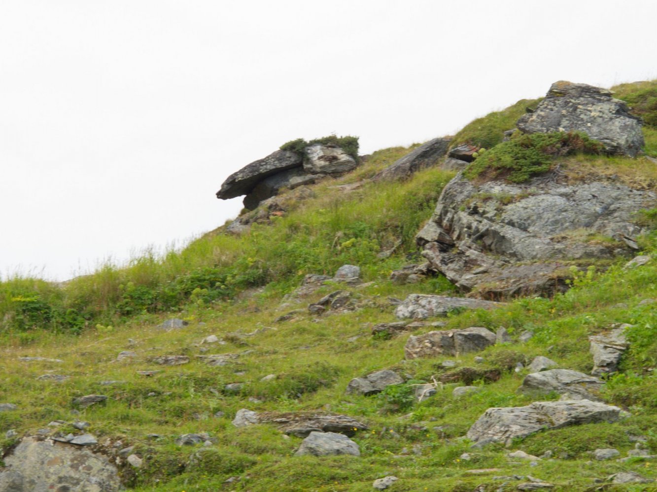 23. Letar efter en väg upp till passet med flata stenar som ligger fast går så lågt möjligt på de partier utan sten med lite växtlighet.Ett bra tips är att gå renstigarna då de gått ofta och valt den mest framkomliga dock ska man komma i håg att de ofta letar efter kvanne en stor blommig växt men de växer i mer vatten rika områden än här samt att renen har 4 ben men i stort sett väljer de en energibesparande väg speciellt i blockig terräng då detta är av stor betydelse. Stora klipp överhäng som i nödfall kan användas som nödbivack om vädret hastigt blir sämre och platsen ej lämpar sig att slå upp tält på,då kan även en vindsäck som normalt används på vintern vid raster eller vid nödsituationer här duga som ersättning för ett tält. Man kan ju när myggplågan är över använda en tarp dvs en pressänning med fästöglor för linor eller markpinnar ev kombinerat med vandringsstavar. Sten frostsprängd i stora skivor som ännu ej fallit ner än.Ganska ovanligt att det blir så flata stenar som är bra att gå på. Troligen en nästan perfekt frostsprängning nära andra sten formationer som ligger som plattor. En flock tamrenar dyker upp mitt i gattet jag planerar att gå upp i och har lagom motljus och sol på renarna. Tar lite russin och lite vatten då jag befarar att det ej blir bra rastplats på ett tag och ser på kartan efter lämplig väg mellan höjderna och följer efter höjdkurvorna istället för att korsa dessa och när det är 20m mellan så blir det fort ansträngande. Tar sikte på lämplig väg och sätter på rycksäck och drar upp huvan på jackan och knyter åt mössa och vantar ingår alltid i fjällen även på sommaren som standard utrustning men nu räcker ej en mössa i Acryl men ylle kan bli väl varmt inne i tältet(vinter huvan som jag har vid cykling vid kallt väder var tyvärr ej med) En liten fjällsjö plötsligt helt vindstilla och lite värme. Om man varit vinterbadare kunde ett dopp kanske locka men troligen + 3-5gr celsius och några kalla vad då det kyler än mer pga vatten strömarna får räcka mer än nog. Värmer sig lite i solen och lä då jag står nära berget,ser efter lämplig väg runt sjön utan att gå upp bland stora stenar. Går upp i den lilla sänkan till vänster på snöfältet och testar hur fast och hög bärighet snön har med stavarna, det börjar snabbt luta och blir lite brantare,men att gå på snön sparar mycket kraft och är lite mer avslappnande när man slipper hålla koncentrationen på topp för att ej tappa balansen och ramla vilket är lätt gjort med stor packning. Jag har gått ner från passet och turligt nog så var det samma typ av flata stenar även här som gör det mycket lättare men då jag ska ner mot Hogianvagge och går omarkerat dyker många hinder upp med branter som man ej kan gå ner i,jag letar efter vattendrag där det normalt är jämnare och säkrare att gå ner. Jag har stadiga vaderade kort kängor med värmeformande foam lika utförspjäxor som ger bra stöd för vrister och med sula som är utformad för bra grepp på is och snö som då ej blir så hal vid regn eller då man går i vattendag.(några problem med skavsår har jag aldrig haft med dessa Mamut kängor. Nackdelen med dessa kängor med Gor-Tex är att de är så täta att även fotsvett ej avdunstar så de får tas av så fort man tar en lång rast eller när man rest tältet.Och får torka inne i tältet om de ska bli helt torra. När det var dags för att leta tältplats börjar det blåsa och komma lätt hagel, då är det bra att ha ett Tält vid namn Hilleberg Unna som man reser snabbt med endast 2 långa stänger som man för in i utv stångkanaler,när detta är klart så kan man lasta in utrustningen och tältet står av sig själv och man kan sätta upp det färdigt när man vilat upp sig och vädret blivit lite bättre.Ska man använda detta på vintern bör man ha dubbla stänger eller gå upp en dimension på stängerna och ha betydligt kraftigare tältpinnar och längre ev i trä.Väven i yttertältet är tålig och klarar starkvind och snölast men det fladrar en del om ventilationshuvan men är ovärdelig vid matlagning och gör att man kan få bra ventilation och regnskydd.Största nackdelen med tältet är att man ej kommer åt den dolda Absiden från insidan utan att ta ner delar av innertältet men detta går ju att lösa med att ev byta ut hela sidan eller att sy in en dragkedja i skarvarna mellan tältdelarna,men då jag hade mycket blöta kläder en gång på turen fick jag kroka av fästena och delvis ta ner inner tältet om man ej vill gå ut och tex vända på kläderna.Jag har haft stavarna och lite annan utrustning som ej förväntas behövas i innner tältet i denna Absiden samt spännt ut den väl för att öka luftningen och därmed påskynda torkningen.En stor Bergans Trollhetta V5 95L rycksäck får plats i Absiden om man drar ihop höftbältet och sätter den på sidan för att få lite luft till yttertältet och minska kondensen som om man ej spänner ut absiderna väl och ej har öppet dragkedjan under skyddshuvan kan bli påtaglig,Jag har även haft en bit liggunderlag under säcken för att skydda mot kondens och nedsmutsning. Efter 3dl havregryn och med planerat snacks av egentillverkade energikakor som av misstag torkats lite för länge och därmed fick läggas i blöt med grynen och svälla sedan kvällen innan,samt 4-6 skivor hårt wasa frukostknäcke med smör som vissa mornar var som en gul betongklump men sedan lagrades med osten inne i innertältet då det var lite lättare att breda ut 24m lagrad präst ost smakar bra till. Självklart använder jag Trangia 25 ha med primus org brännare då slipper man oroa sig för att köket välter och tältet fattar eld och med allvarliga personskador(en mindre fickkniv bör man ändå ha i fickan om det trots stor försiktighet kan gå fel ska man snabbt kunna ta sig ut genom tältduken),ställer man ba