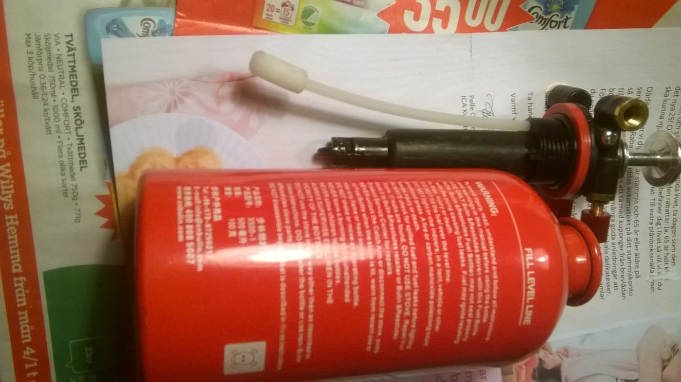 1. Hade problem med att öppna barn/säkerhets kork/lock på 5l dunk med akrylatbensin 4-takt, tog lite 2-takt akrylat det fungerade men lite mer sot och gul låga. Parafin/fotogen köp den renaste som luktar minst och anv ej tändvätska mer än om fotogen är slut. Tändvätska är ej någon klassad produkt och kan/får innehålla mycket man får fram från krackning av råolja. Fotogen har betydligt högre energiinnehåll. Använder man allt möjligt som brinner i köket ev med fel munstycke ska man ej ha detta i tält eller i små lokaler då man får mer CO och sot och andra förbrännings produkter. Jag rekommenderar Akrylatbensin och munstycke för bensin vissa kök har ett munstycke till allt kolla då vilket bränsle som rekommenderas av andra användare och de som testat CO på denna kombination av munstycke och bränsle. Jag anv bara parafin på mitt Kap-Artic och andra brännare som 111 med största munstycket och som ger helt blå låga utan gula inslag och därmed minst CO och stabil låga utan störningar då CO ökar dramatiskt. Vid byte av bränsle och första körning av kök till bra förbränning gör detta ute vid övergång från fotogen till bensin ha kvar munstycket till parafin till all parafin brunnit upp alt om du är hemma och ej behöver värma mat eller vatten kan man ju pumpa ut bränsle till en flaska och anv detta till rengöring eller tända ved vid regn. Vid köp av bränsle köp märkesvara med tillverkaren etikett och innehållsförteckning om du ej är på resa och måste köpa vad som brinner.