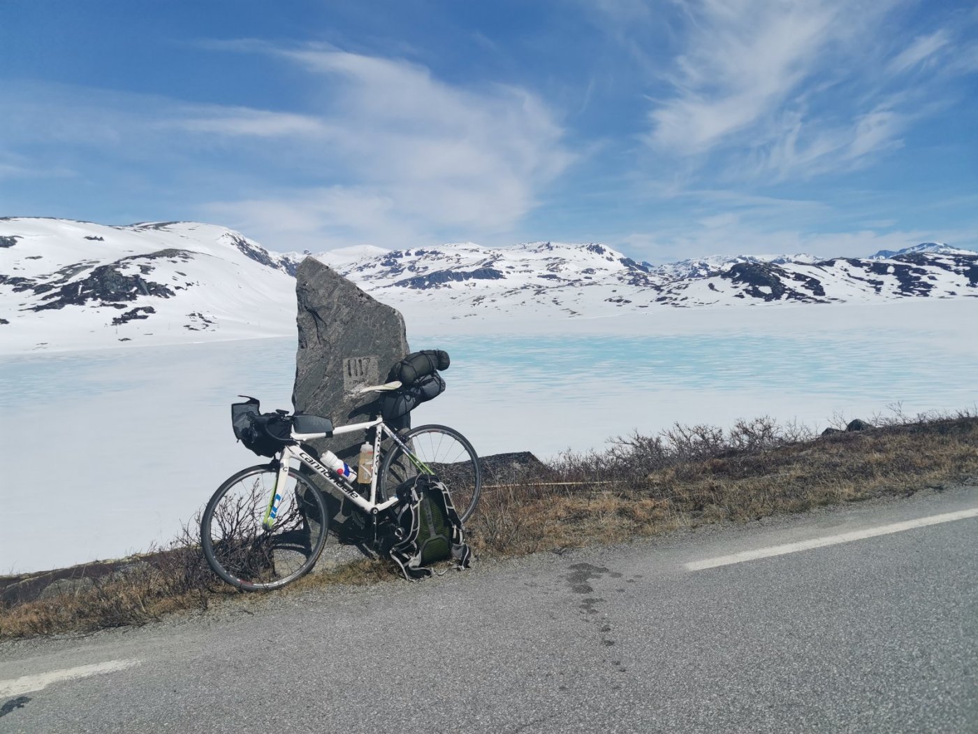 Deretter har jeg jevnt lært mye. Alle ture har siden vært på vanlig landevei sykkel, primært på våren rett etter veiene over fjellet åpner (har endt i snøstorm på Valdresflya og syklet til juvasshytta på is siste 5 km opp). Når jeg har syklet med sekk på ryggen, har jeg syklet fra hytte til hytte på diverse camping plasser og spist hvor jeg kunne finne mat. Dvs har bare hatt vinterklær, ekstra klær og sko i sekken. Det har blitt en del ture slikt rundt Jotunheimen, Hardangervidda, Åndalsnes - Oslo mm. Fungerer fint, men er litt stress å sykle med sekk (Osprey Talon 22L eller 33L).