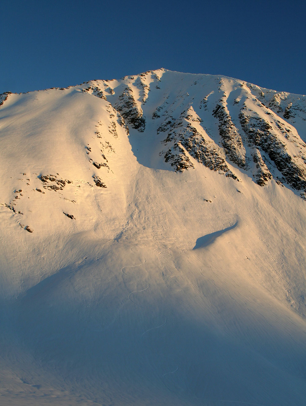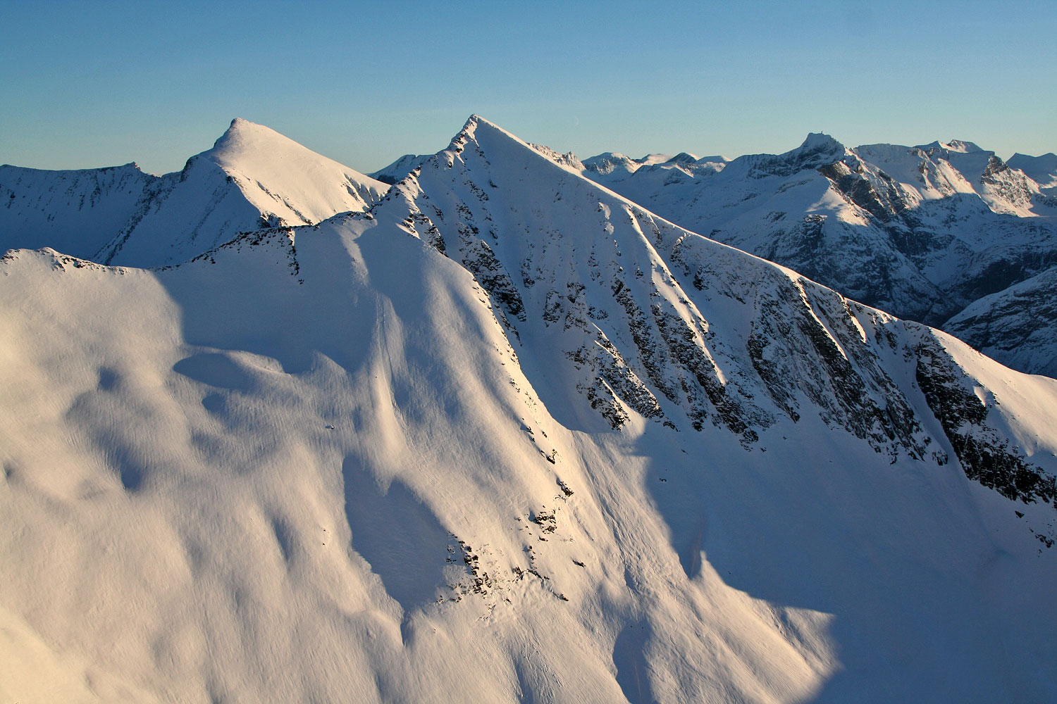 Toppturer på ski når sola er på sitt laveste gir et spesielt og flott lys. Me and gi dro to Isfjorden this fantastisk day (bad englisj, så jeg slutter her..), egentlig var det Øspetinden i Måndalen vi hadde planer om å toppe. Men ei ferge over Romsdalsfjorden hadde startvansker, så gi kom seg ikke dit som planlagt. Isfjorden ble derfor plan B, og det kan vel neppe sies å være et dårlig alternativ. Flere bilder og kart Plan B var Søre Klauva (1356) og videre til Klauva (1512) med nedkjøring ned den sørvendte Hestebotn. Vi ender opp med plan B-variant, Søre Klauva og nedkjøring østflanken til Hestebotn. Det var ca 10 dager siden sist snøfall. Med litt vind og korte perioder med plussgrader langt til fjells var vi noget spente på skiføret. Fantes løs-/tørrsnø? Frostskorpe? Vindpakket? Vi passerer Loftskarsætra og aner bra føre når det ligger ca 5cm perlekrystallisert snø oppå et fast underlag. På 7-800moh oppunder Skarven (1142), rett sørvendt, er det frostskorpe så snart det blir litt brattere.. Vi følger sørvestryggen opp mot Søre Klauva (1356), her er avblåst og en del skare/is. Mine feller biter for dårlig så jeg tar på stegjern i stedet opp der det er hardest. I øvre del er det på igjen med skiene, og her er det igjen bra skiføre - også sørvendt men på rygg og såpass høyt at sola ikke har fått påvirke. Splended views.. spesielt mot Kirketaket. Og i vestrenna på Kirketaket ser vi skispor... Klokka går fort, og sollyset varer ikke evig på denne tiden av året. Det gjenstår en nedstigning på stegjern + 300 høydemeter opp igjen på Klauva. gi har vært der før men mangler nedkjøring av østflanken. Beina mine har mest lyst til å bruke de siste kreftene på nedkjøring i stedet for en ekstra topp. Vi spiller derfor litt piano og tar livet med ro, men går nordegga et stykke for å se på forholdene før vi returnerer og gjør oss klar for nedkjøringen. Det har begynt å legge seg skygger ned i Hestebotn, sola havner bak Vengetinden. Men få minutter senere lyser sola igjen opp Hestebotn og vi tar fatt på oppturen (dvs nedoverturen). Østflanken er en markert rygg som er sørvendt lengst oppe men svinger fint ned i østsida. På et kort parti smalner ryggen inn men den er vel aldri smalere enn 20-30m. Det er spor etter en 4-5 andre ned her fra før, så akkurat i dette partier er det lite løssnø å spore (partiet er kort, 30-40 høydemeter). Ellers har vi hatt veldig bra føre hit ned med ca 5cm styresnø. Resten kjører vi rett øst eller sørøstvendt, men det merkes raskt når vi kommer for langt mot sør. Da er det en isete og vanskelig skorpe som knaser godt når den brytes, men mer østvendt er det vesentlig bedre tatt i betraktning at snøen er ca 10 dager gammel. Her skjærer vi oss opp til 15-20cm ned i underlaget. Østflanken er ei veldig fin nedkjøring som aldri blir brattere enn 30 grader. Hadde vi gått for Klauva (1512) også tror jeg vi var enige om at føret ned igjen hadde vært dårligere, iom rett sørvendt dalføre hvor solen nok hadde gjort sitt.