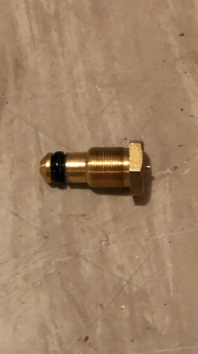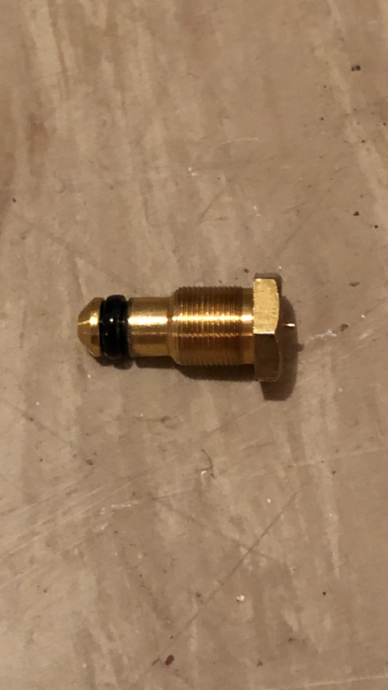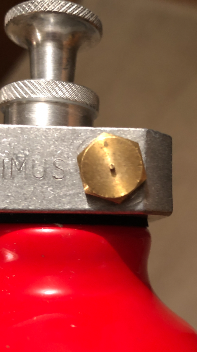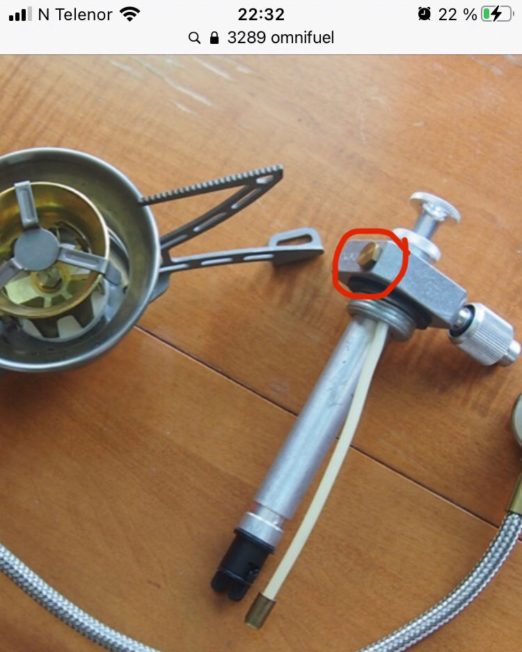 2. Hei! Kjøpte akkurat en eldre lite brukt Primus Omnifuel 3289. På pumpen er det en messingskrue (se bilde).. Midt i skruhodet stikker det ut en liten tapp e.l. på halvannen mm, og jeg er ikke sikker på om tappen stakk ut før jeg testa brenneren. Får ikke tappen inn igjen.. Noen som vet hva denne skruen er til, og hva greia med tappen er? Sikkerhetsventil for høyt trykk?