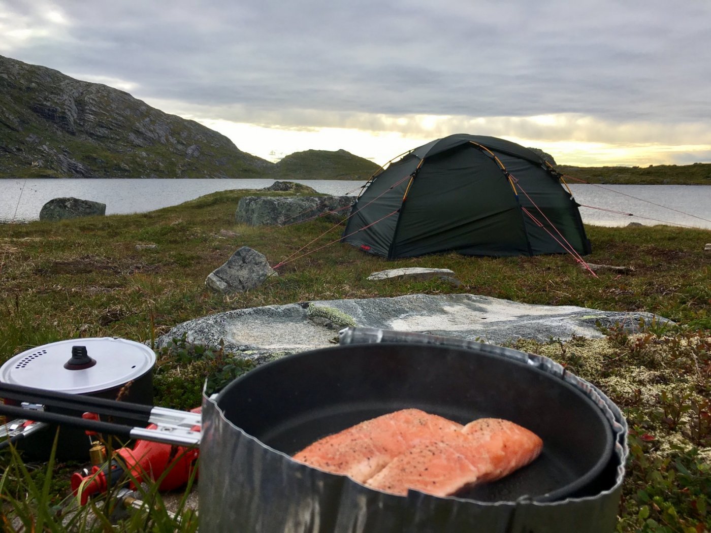 Er akkurat kommet hjem fra en kjapp telttur. Fikk klemt inn en natt på fjellet mellom forpliktelser og regnbyger også ble det to fine ørreter med vekt mellom 500 og 600 gram. Dessverre fikk jeg fiskene sent på kvelden, så det ble medbrakt laks til middag Samtidig ble det en ypperlig mulighet for å prøve mitt nye Hilleberg Soulo kom hjem i tide før regnet skulle sette inn i dag.
