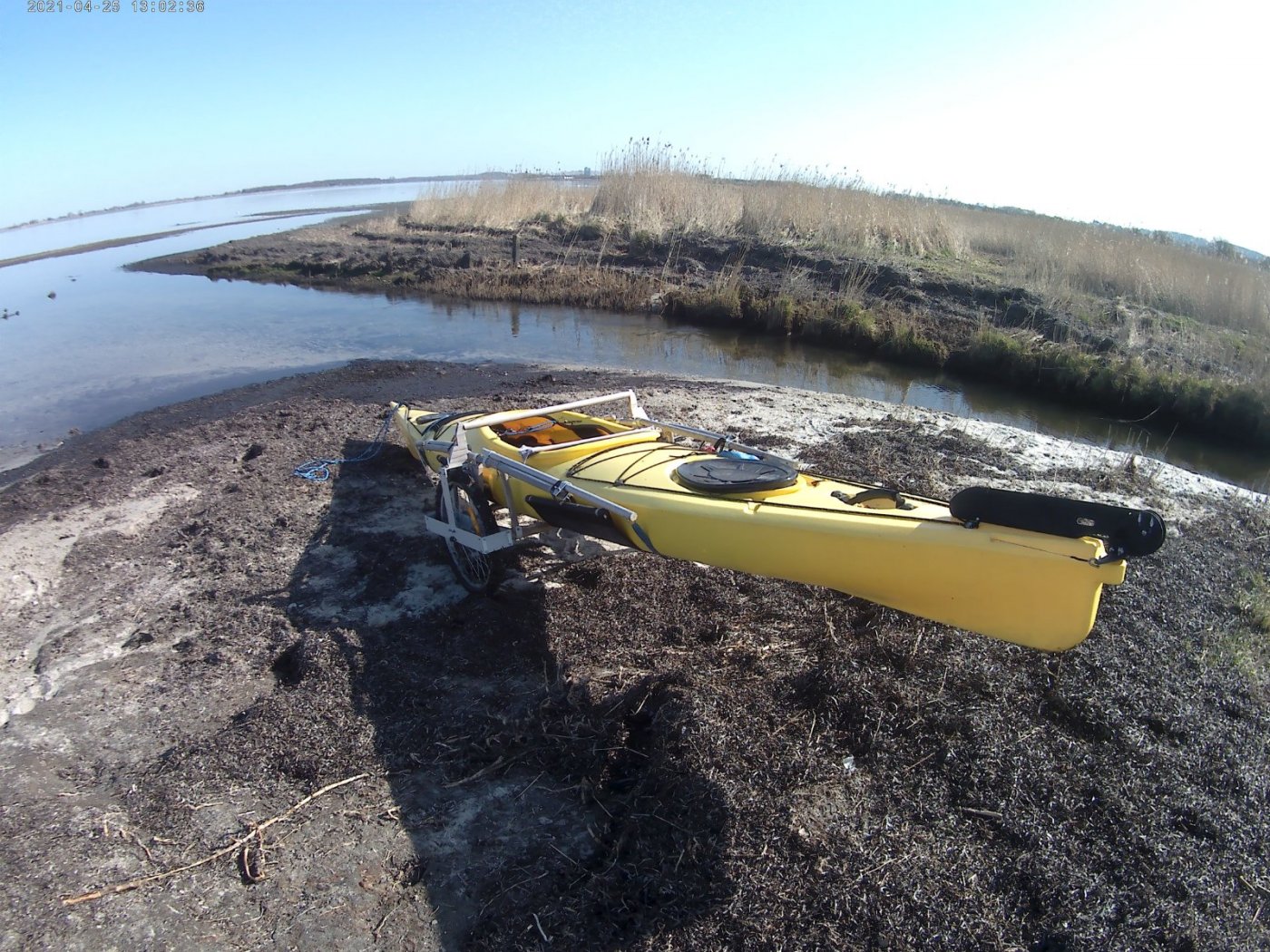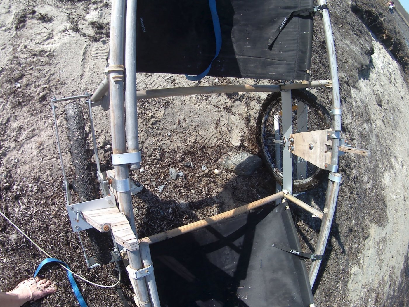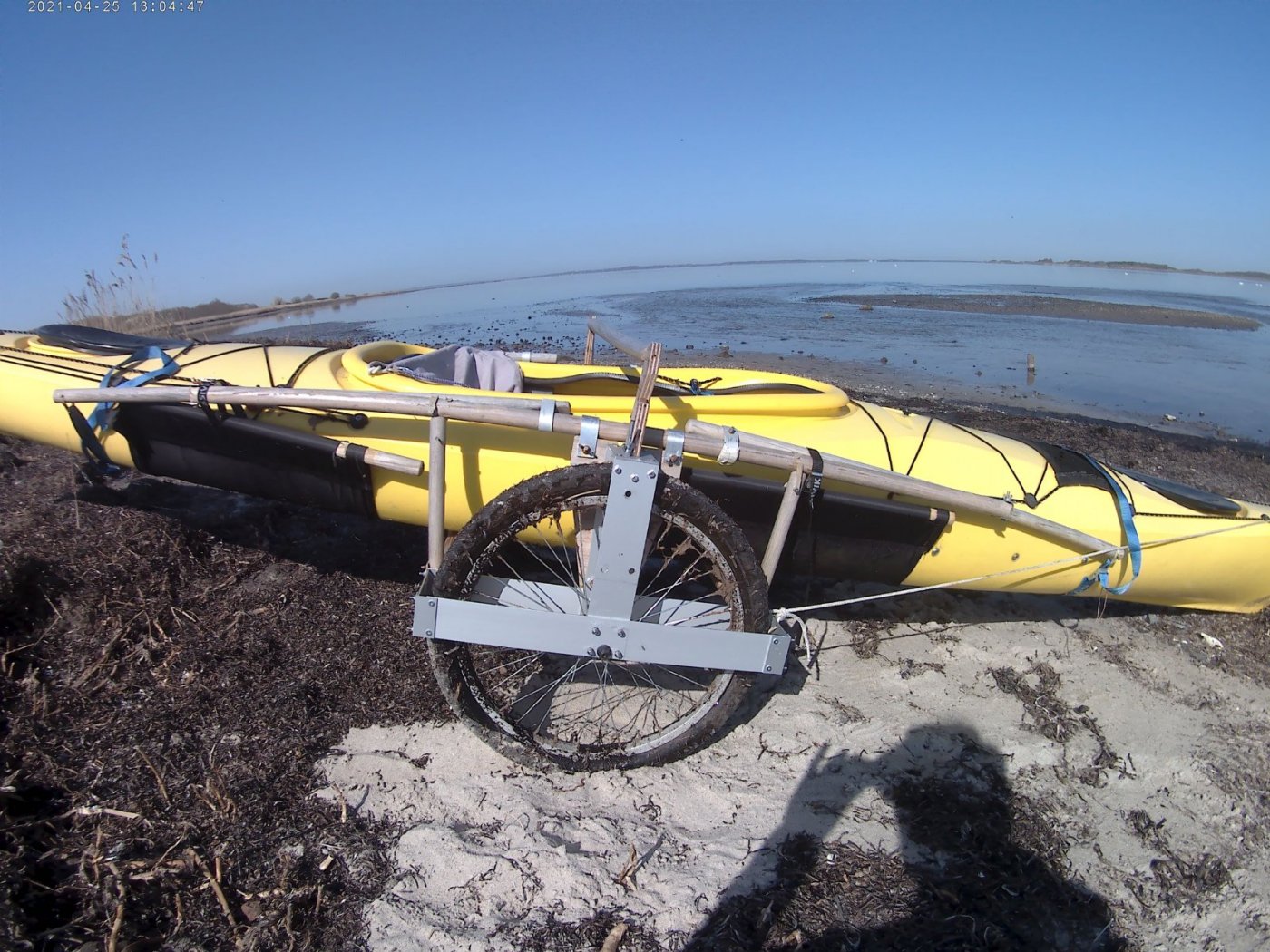 Jeg har fået taget nogle billeder af min kajak-vogn. Som udgangspunkt ville jeg gerne have brugt den til at tage med på tur, og det har præget nogle valg, fx. at der er kun få skruer der skal håndteres, og resten af samlingerne er løst fæste. En lang og kraftigere rundstok fra skot til skot (for at understøtte kajakken hvor den selv kan bære) ville have været åbenbart for en fastligger-vogn, men denne bæring er delt i tre rundstokke, og en ret indviklet konstruktion er kommet ud af det. Hjulenes størrelse bliver værst at få med på tur, så det er ikke en særlig rejse-venlig sag. Den er til gengæld stabil nok til at kajakken altid ligger i den når den ikke er på vandet. Jeg trækker den gennem blævrede mark-veje uden problemer, men den må være håbløs på stier. Hvert hjul har en kraftig alu-ramme midt på og spændt på navet. De støtter to rundstokke som binder hjulene sammen. Til rammen er osse hæftet en bred spåndplade som rejser sig op over kajakken. Heroppe binder den tredie rundstok på tværs af kajakken hjulene sammen. Den rækker over kajakken og skal tages af for at kajakken kan tages af vognen. Uden denne stok vil kajakkens vægt få hjulene til at gå i spagat - jeg er sikker på, at den har en god stabiliserende funktion. Der er en tap i hver ende af stokken, og et hul i støtterne, og, fordi støtterne klemmer mod hinanden under kajakkens vægt sidder stokke i spænd unde skruer eller andet. Var det ikke fordi jeg gerne vil have den bedste understøttelse af kajakken (for ikke at deformere skroget over tid), så kunne det såvidt være sluttet her. I må nøjes med at se på billederne, hvordan jeg slipper afsted med at lave noget som kan skilles ad uden værktøj, ikke er for langt eller tungt og som åbenbart kan bære kajakken ok. Kajakkens vægt vrider stokkene rundt på en måde jeg ikke havde forudset. Det eneste der mangler er et lille hjul bagtil .. når jeg trækker fremad gør den lave arbejds-højde osse et træk opad, så bagenden bliver trykket mod jorden. Men, det er et lille problem. Med et træk-reb fæstnet til forkanten af hjul-rammerne kan jeg trække kraftigt. Hæftet på kajakken hiver jeg den konsekvent ud af balance og af vognen. Den ser ikke ud til at kunne blive gammel, så jeg nyder hver vellykket tur.