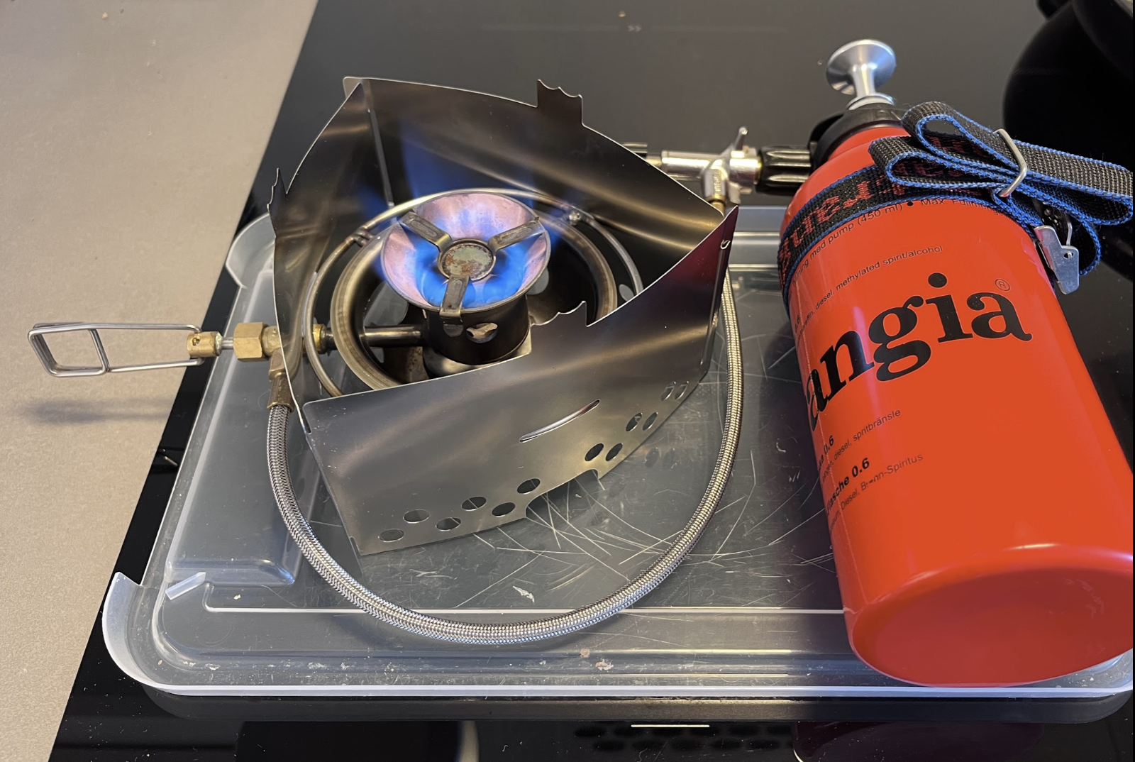 Fornøyd med hvordan dette ble! En del mer kompakt enn Trangia 27-oppsettet mitt, men det er i realiteten kun vekt jeg sparer og ikke noe volum, siden kjelen som har hatt Trangia 27-en i seg uansett må bli med med dette oppsettet. Brennerplaten under er et lokk som jeg uansett har i pulken på en plastboks til utstyr. Gjenstår egentlig bare å feste Traingle'n til denne på noe lurt vis.