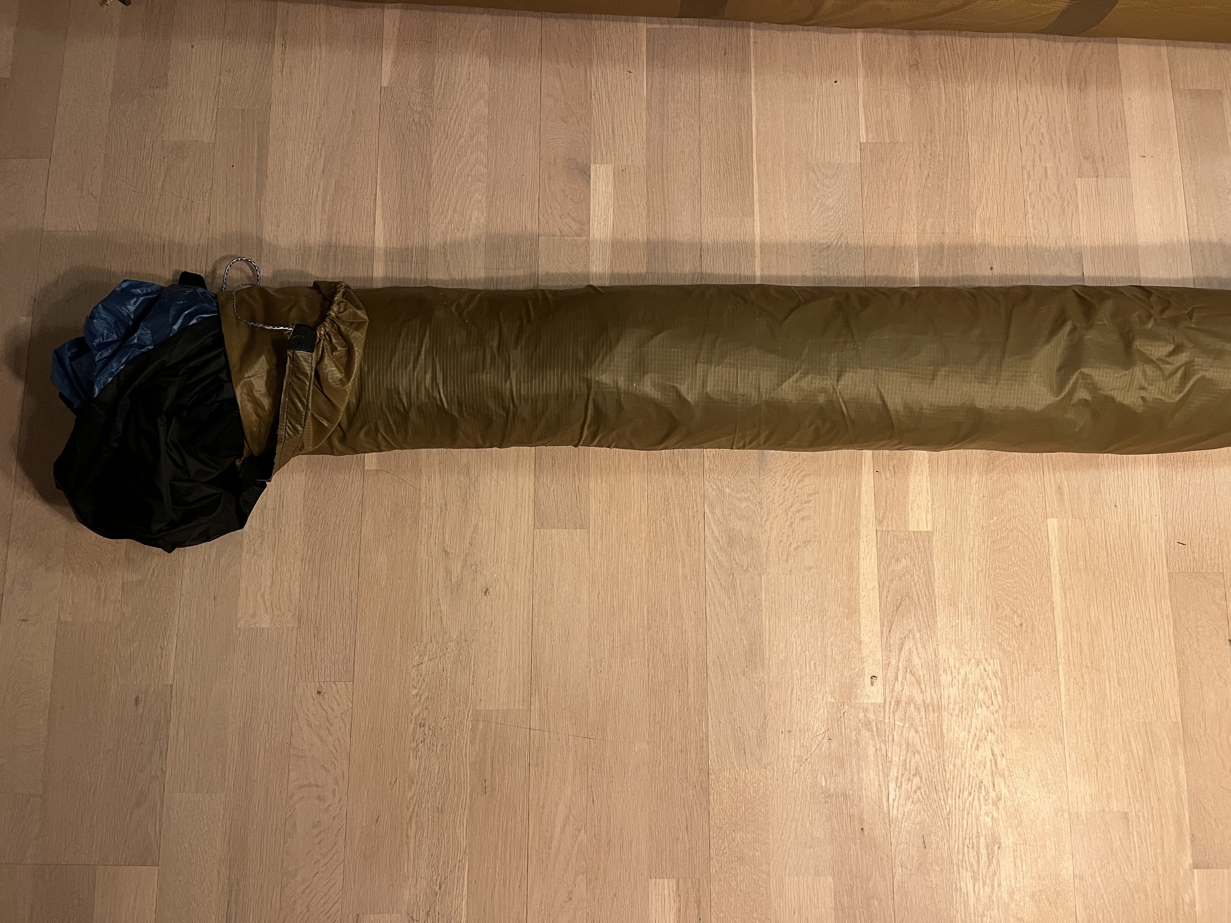 Løsningen på dette ble å sy et større trekk til hele rullen. Her brukte jeg også 40D SilNylon og veldig enkel snørelukking i begge ender. Hvorfor begge ender? Mest fordi det ble en enklere syjobb, men det har vist seg å være en lur løsning, for der jeg i fronten tar inn og ut teltposen kan jeg i bakdelen stappe en dunshorts, dunvest e.l. som jeg ønsker å ha lett tilgjengelig, men samtidig beskyttet fra elementene.