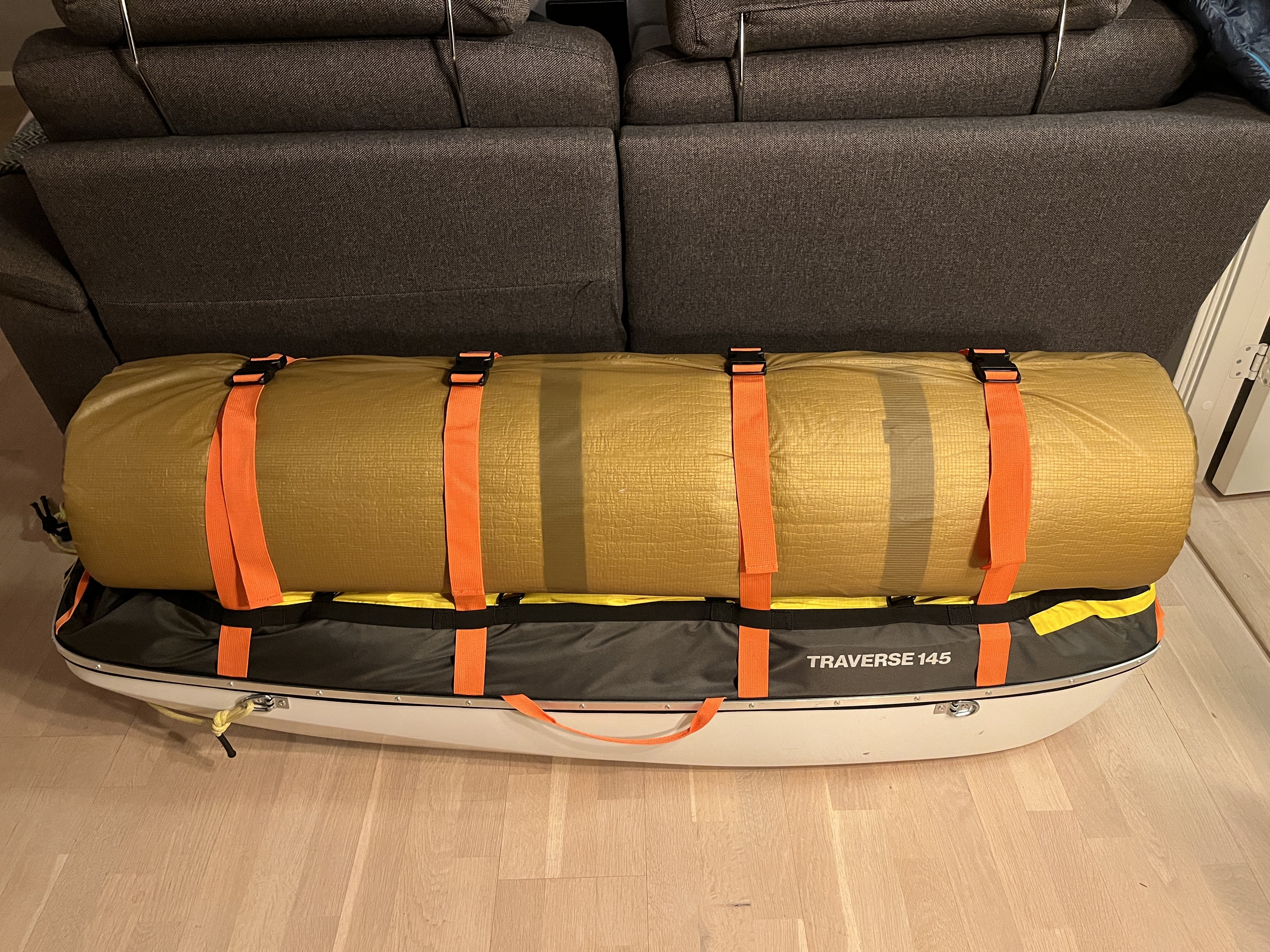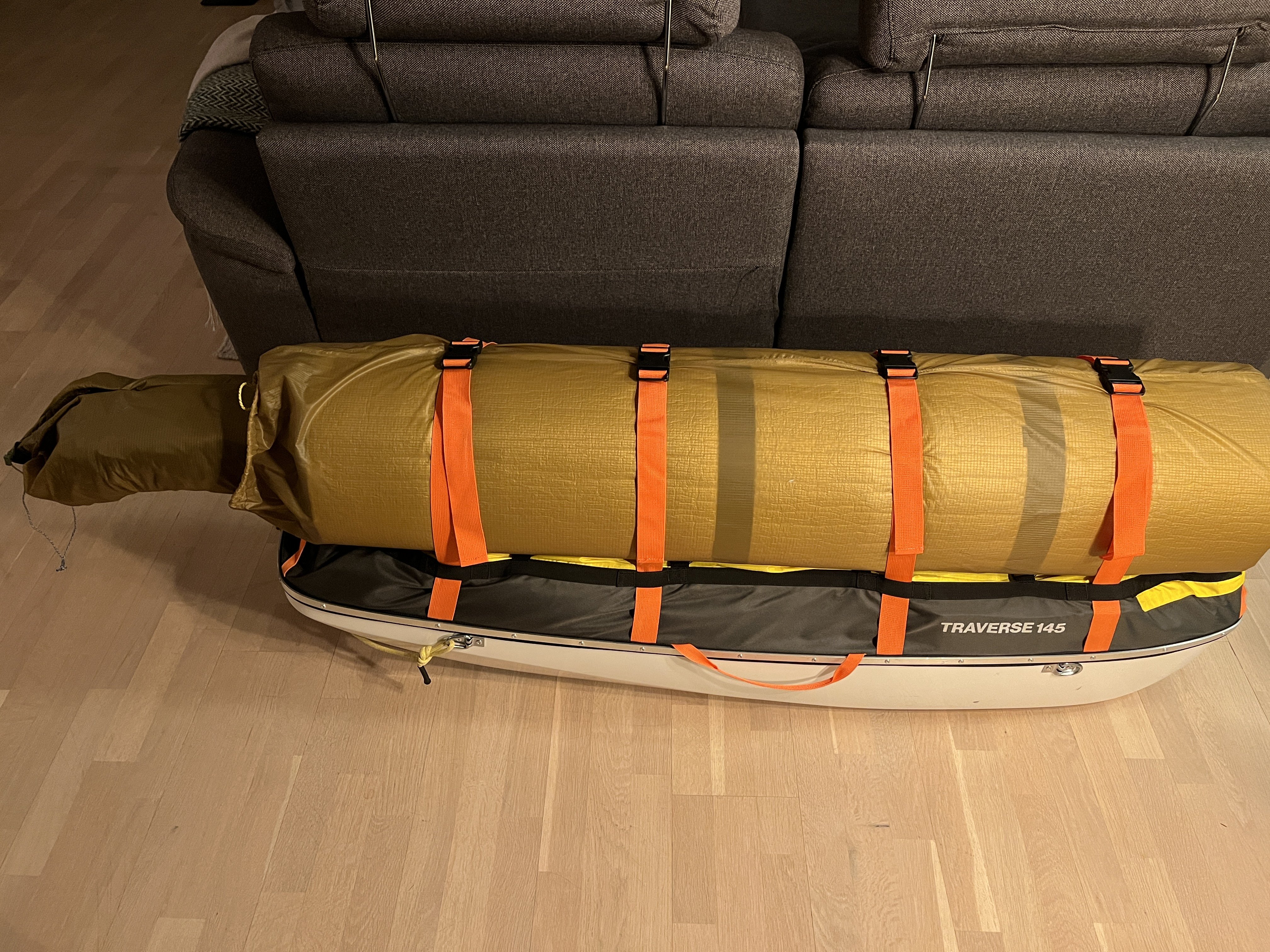 Denne teltgulv-rullen er ikke blitt brukt så mye fordi det ble litt upraktisk å pakke den med oppsettet jeg kjørte på pulken tidligere. Rullen er semi-stiv, så den ruller seg ikke så tight sammen om man bare lar den ligge i teltet ved nedpakking heller. Men med dette nye pulkrull-systemet har det sin plass og det knapt uten å legge til noe merkbart volum på pakkingen. Jeg tilpasset bredden på gulvet til å passe rullen på ~145-150 cm, så den vil ikke dekke hele innertelt-gulvet, men store nok deler til at det blir lunere. Gulvet er også blitt noe kortere fra første iterasjon etter å ha blitt delvis ofret til andre DIY-prosjekter tidligere