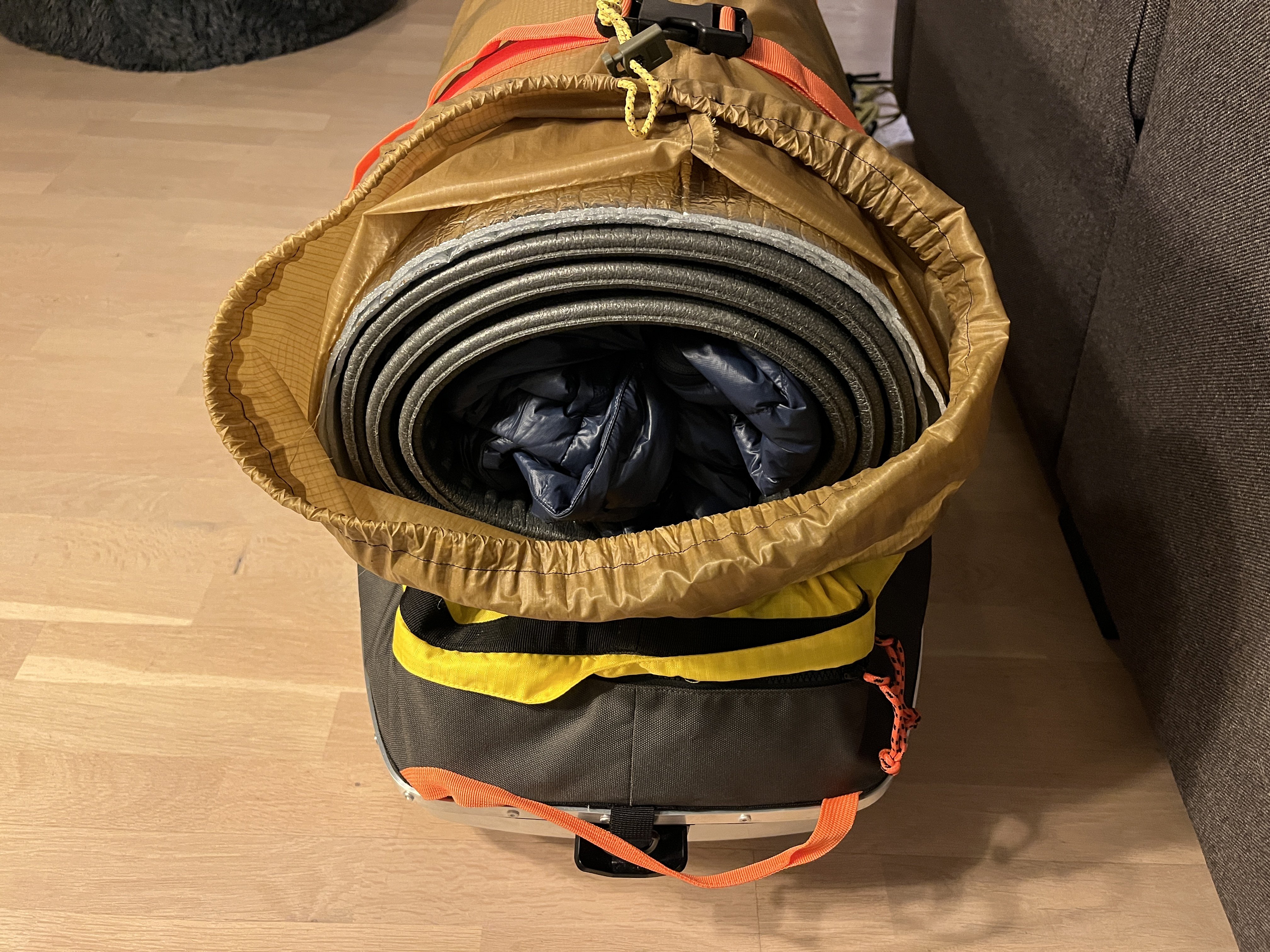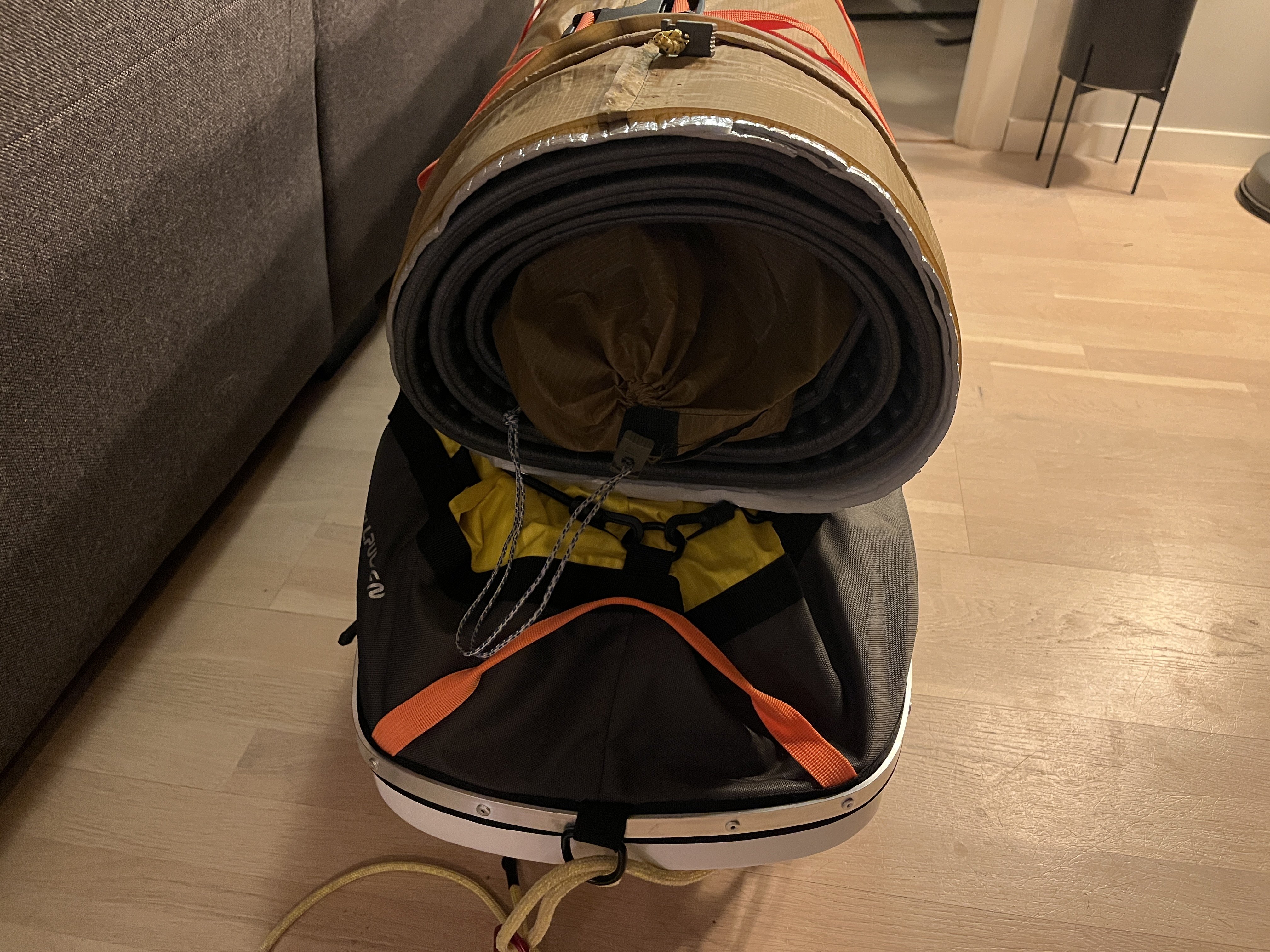 Det åpenbare minuset med to sånne matter er volum. Det er ikke snakk om å få dette inni pulken uten å kaste bort all plass til kun mattene. Å rulle to matter rundt hverandre blir også veldig stort og høyt. Her kom jeg frem til at den mest plass-effektive måten å pakke disse på må være som et rør rundt teltposen som jeg uansett vil ha oppå pulken lett tilgjengelig.