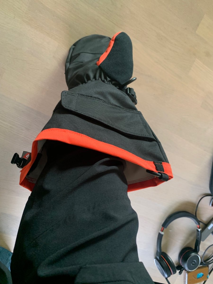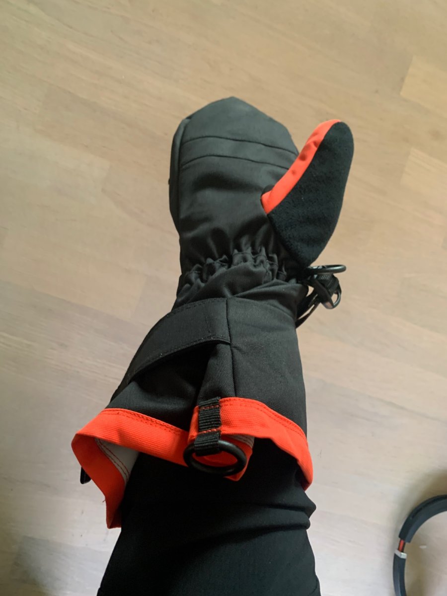 Som @BackO skriver så nærmer vinteren seg. Tenkte derfor jeg kunne skrive et førsteinntrykk av vottene som jeg ende med å kjøpe. Ingen felt test altså, men noen betraktninger før vinteren kommer. Første jeg reagert på er størrelse valget. Innervotten til M/L var ganske tight til meg. Neste størrelse er XL/XXL som var gigantiske. I tillegg til å være litt trang, er den også veldig kort og vil gi lite varme rund håndledd og pulsåre. Selv liker jeg ikke bruke håndleddvarmere fra ulltrøye inne i votter. Mulig jeg må øve litt på å bli vandt til dette. Disse kommer jeg nok til å bytte ut med mor sine tovede ullvotter. De er også mer riktig størrelse for meg, samtidig som det fortsatt er god plass til disse inne i skallvotten. Skallvotten virket som god kvalitet, men jeg ble litt overrasket over strammingen på overarmen. Den tradisjonelle snøringen er byttet med en borrelås flapp. Når jeg skal stramme disse ender jeg bare med å dra votten rundt armen og det er umulig å få den tett. Kanskje det ikke er behov for å ha det helt tet her og det er en fordel med lufting den veien. Jeg er uansett ikke overbevist før jeg får teste dette skikkelig. Funksjon for stramming vist under: God åpning om man vil ha de trukket over boblejakke: Dette er det maksimale jeg klarer å få til med stramming over min skalljakke: Merk også at votten kommer uten stropp til å feste rundt håndleddet. Dette må eventuelt kjøpe i tillegg.