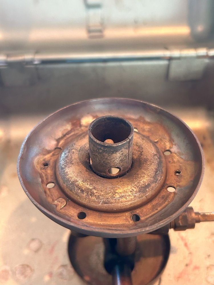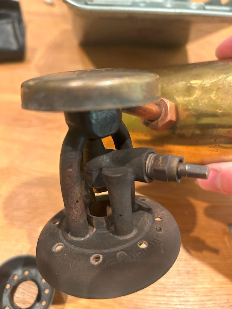Men burde det ikke da kommet gass eller parafin ut av det hullet når jeg åpner ventilen? Eller kommer det parafingass ut under klokka, annet enn det som skal komme ut av dysa? -