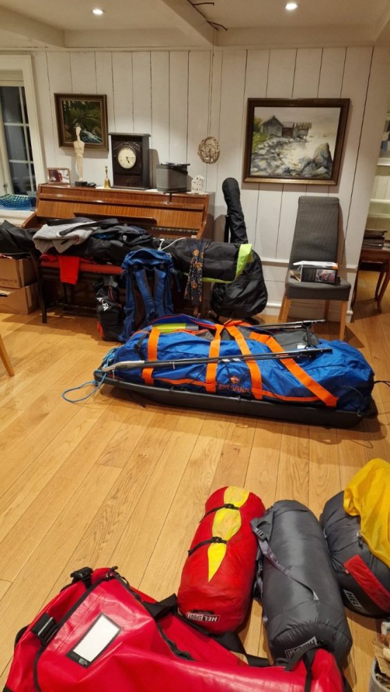 Hei igjen og takk for fantastisk mange gode tips og tilbakemeldinger Planlegger intill 9 dager på tur, muligens 8 (se hvor lang tid jeg bruker på Finse). Vil ha rom for å ta et par dager uten forflyttning / kunne sitte litt værfast. Først og fremst så må jeg si at 56kg var resultatet når jeg hadde pakket ønskelista mi, var nok litt naiv men lov å prøve ;). For de som evt. har fulgt litt med påpakklista så har den endret seg betraktelig, men fortsatt er nok sum litt for høyt. 1L om dagen var vel det høyeste jeg fant i ett turopplegg som var organisert, og Randulf sa jo heller mer enn mindre på første lange vinterturen for et par uker siden. pt. har jeg redusert til 0,6 og muligens til 0,5 (men da må jeg begynne å tappe av blåkanna). Har halvert real middager og erstattet med real suppe for lunsj, det gjorde jo litt. har 2 flasker istedenfor 3, jeg synes det er tryggt å greit å ha 2 flasker så jeg slipper å begynne å fylle midt i snøsmeltinga eller ut av teltet. har også 2 pumper, så om en feiler så prøver vi den andre før vi begynner å skru opp. (hadde 3 flasker med 3 pumper, det var nok litt overkill) 1 brenner veier ikke så mye, ca halvparten av 2. på Hardangervidda finnes det flust av hytter så det kan være en ryker, men tanken var å gå "unsupported :-D", så sikkerheten var litt i bildet når jeg kjøpte en reservebrenner. Neste slag står om power, Har nå 2 andersons 20k mha banker (400gr hver), samt ett solcellepanel. dette skal drive gps, inreach, gopro og telefon. (liker ikke oppladbare lykter på tur derfor batterier). 1 bank + solcelle, 2 banker ingen solcelle eller kun en bank. her vet jeg ikke hva som er beste fasit, heller litt mot 1 bank og solcelle men været fremover kan muligens indikere motsatt Jervenduken og bamse var lenge en avveining, jerven hunter er 1500g mens bamse mye lettere, Bamse røyk og foreløpig er jerven med videre (sikkerhet, gulv i teltet), chairkit røyk hvist også, får spa meg en stol Ryggsekken er kanskje en kandidat til å ryke, den ble med for å kunne ta noen småturer hvis jeg tok en dag uten forflyttning, kunne laste opp litt i oppoverbakker for å få bedre press på skiene osv. Begynner å få dårlig tid her nå, og har planlagt dette i ganske lang tid, merkelig det der. Utfra svarende så hadde jeg vært happy med 40kg helt til @Marius Engelsen meldte seg på chat'en