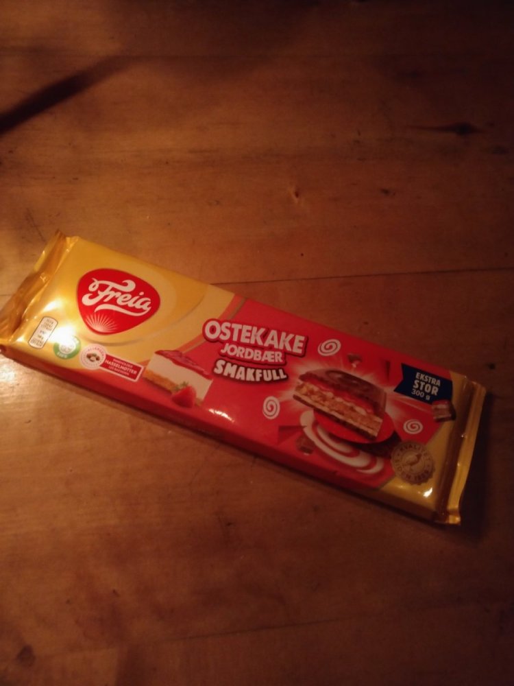 Delfiakake går an, men ikke store forskjellen, om man ser bort i fra noe høyere fettinnhold på den hjemmelagde(oppskrift kan jo variere dette) Tall pr 100g. Freia Ostekake; Energi KJ 225 Energi kcal 528 Fett 29 Mettet fett 17 Karbohydrater 59 Sukkerarter 49 Kostfiber 1.1 Protein 5.4 Salt 0.49 Hjemmelaget Delfiakake; Kalorier 523,54 Protein 5,37 Karbohydrat 32,93 Kostfiber 2,47 Fett 40,60 Mettet fett 31,45 Salt 0,12