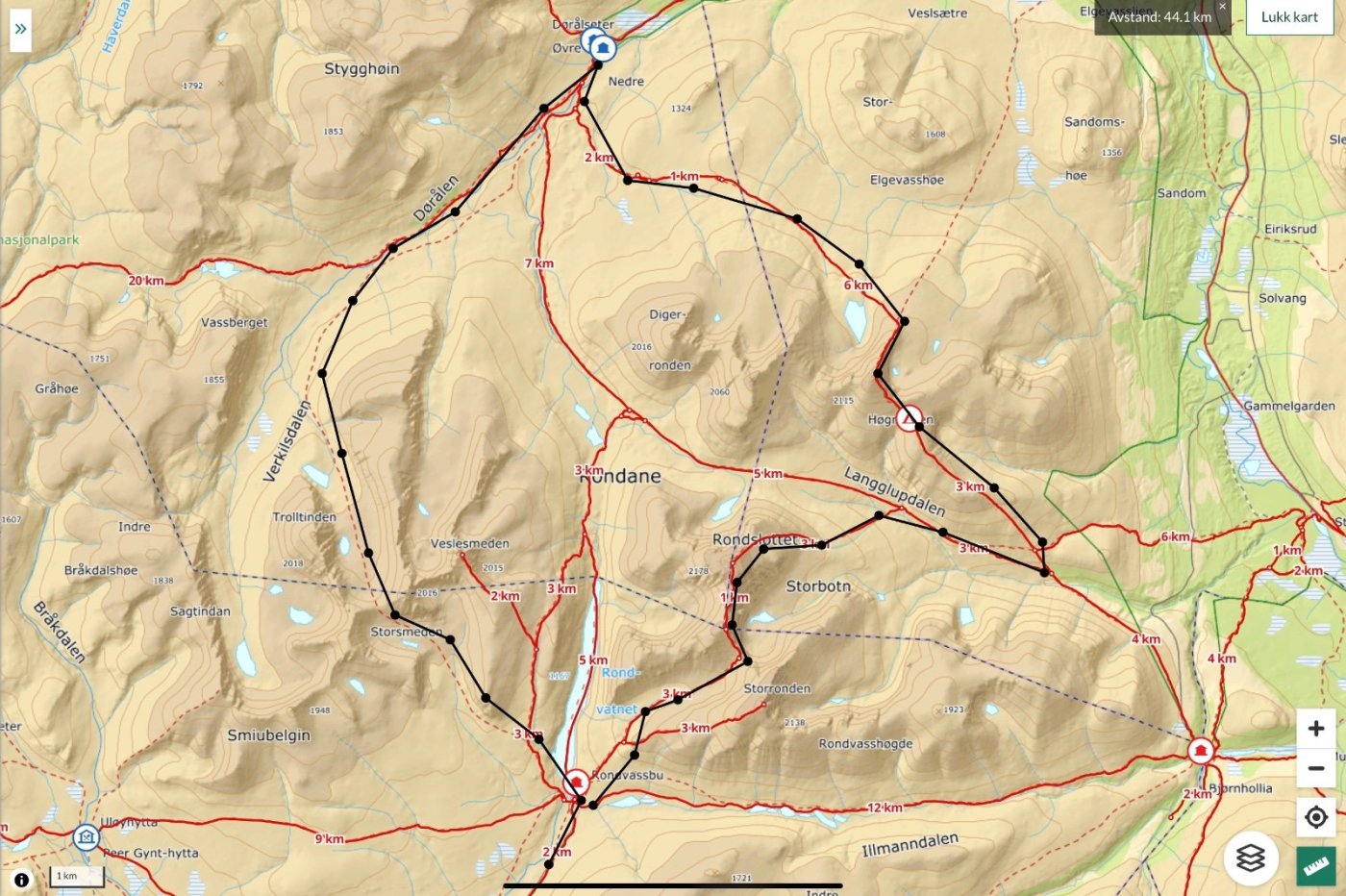 Rondane er tilgjengelig og supert. Hvis dere vil opp på noen topper så er det litt å velge i. Legger med et forslag her, men med såpass med topper er det greit å kikke på værmeldinga før avreise. Parkering på Spranget 6 km fra Rondvassbu. Sett på ruta med klokka trenger dere ikke innom der først. Alternativ til passeringen av Rondeslottet er å heller gå ned om Bjørnhollia og Illmannadalen tilbake til Rondvassbu. Ettersom dere går fordi de betjente hyttene kan dere spare litt vekt i proviant og få dere en skikkelig middag og en øl samtidig. Fin tur som greit gjøres på 5 dager.