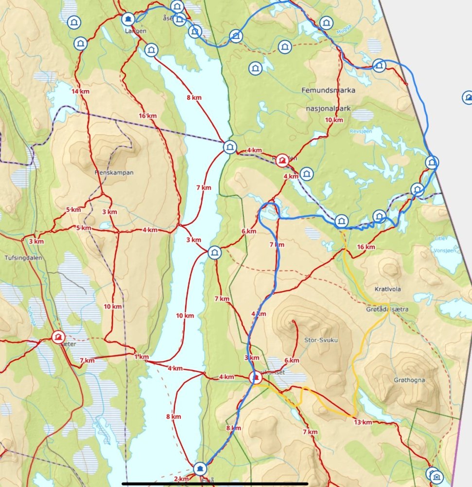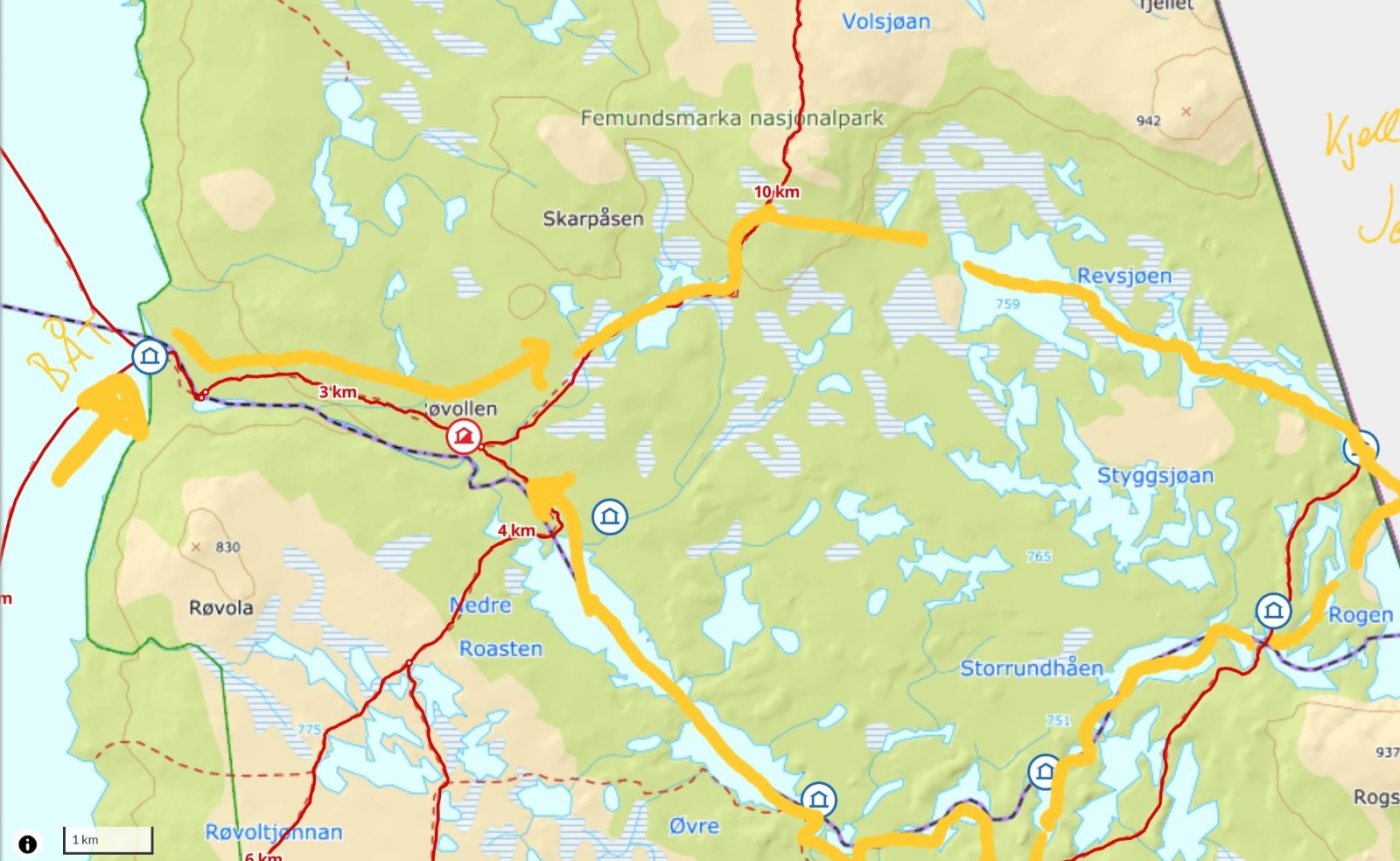 Forslag (bifall) til rute, fra Langen, evt. Nordvika hvis dere tar båt. Forsåvidt samme som du skisserte selv, men tror dere peser mer enn dere koser dere med den ruta på 7 dager. Blå strek: Fra Nordvika ta nordligste sti til Muggsjøene, derfra ta av stien og opp skedbrofjellet og ned igjen mot Revsjøen og Rogen. Følg stien til Storfisktjønna i sør og ned langs Røa forbi Grislehåen til Roasten. Opp igjen til Røvoltjønna og rundt, mot Svukuriset innom Oasen og ned til Elgå. Alternativ rute - Gul strek - opp Grøådalen langs elva til Grøtådalsseter, opp i skaret innom vannene og rundt Svukuriset - evt rett over. Litt mer fiske siste dagen da. Og litt kortere enn ruta du skisserte selv. Anbefaler absolutt å gå ned langs Røa forbi Grislehåen. Skog, men grådig fint. Begge rutene mine går ned der, og unngår DNT stien fra Storfisktjønna mot Krokhåtåen. Den biten med sti syntes jeg var lite givende i forhold til resten (som jeg så på min tur) Mesteparten går langs DNT-sti og er lettgått slik at kilometerne går litt fortere. Ca 3 km i timen er vel innafor hvis dere er greit trent med tung sekk. Jeg bruker gjerne 2km timen som målestokk da det blir litt stopp, og mer hvis det fiskes. Dvs dere går jo fortere i fjellterreng enn skogsterreng, med mindre dere baller dere inn i Krattland.- 14 svar