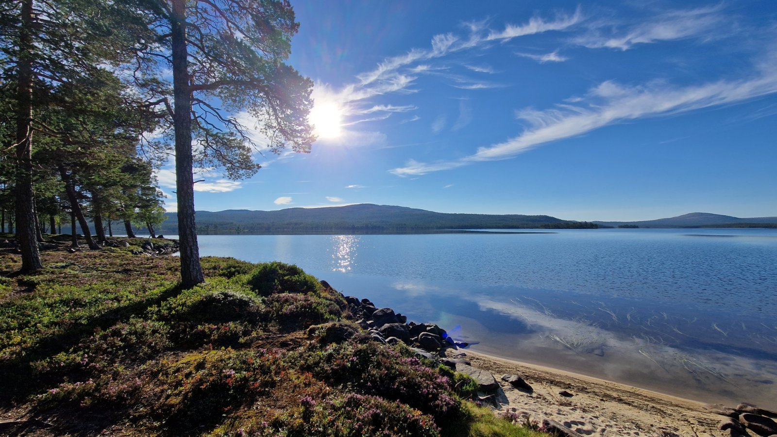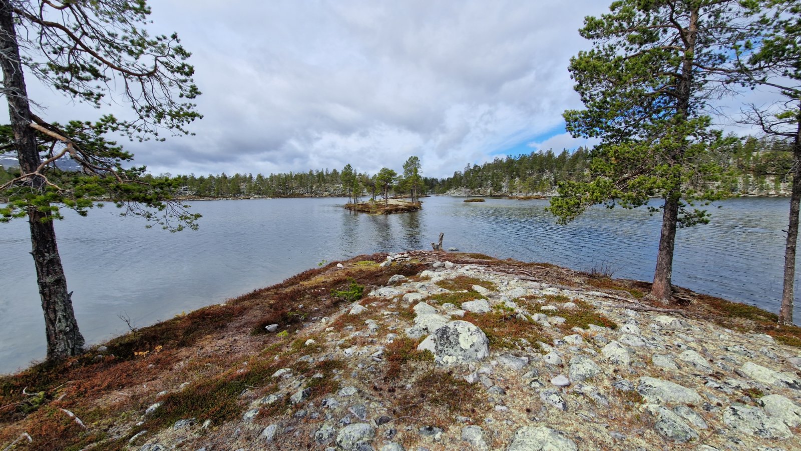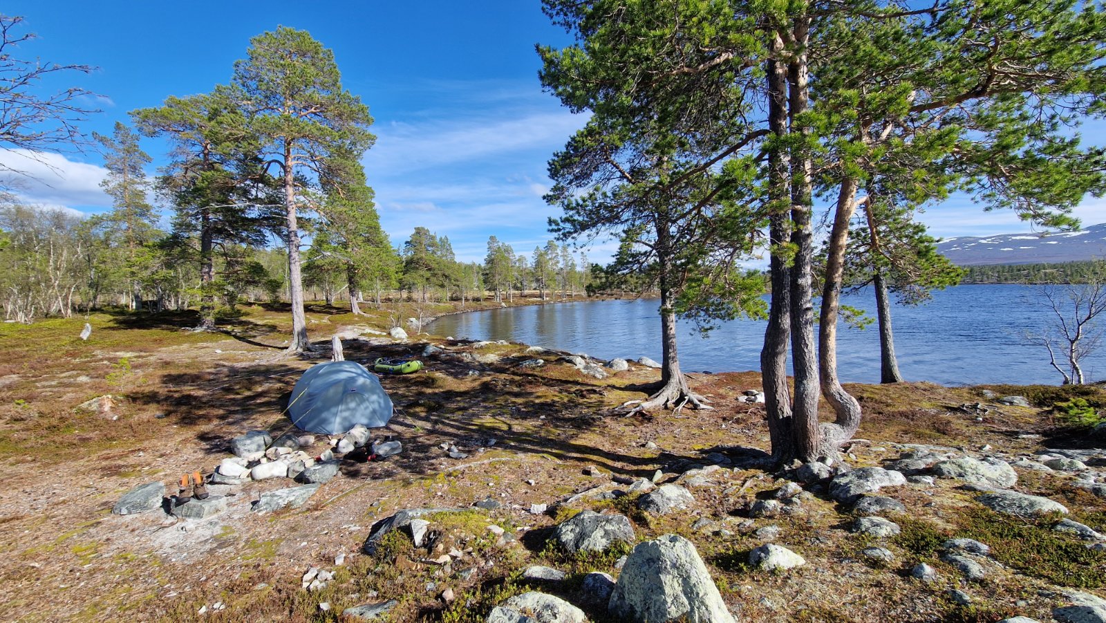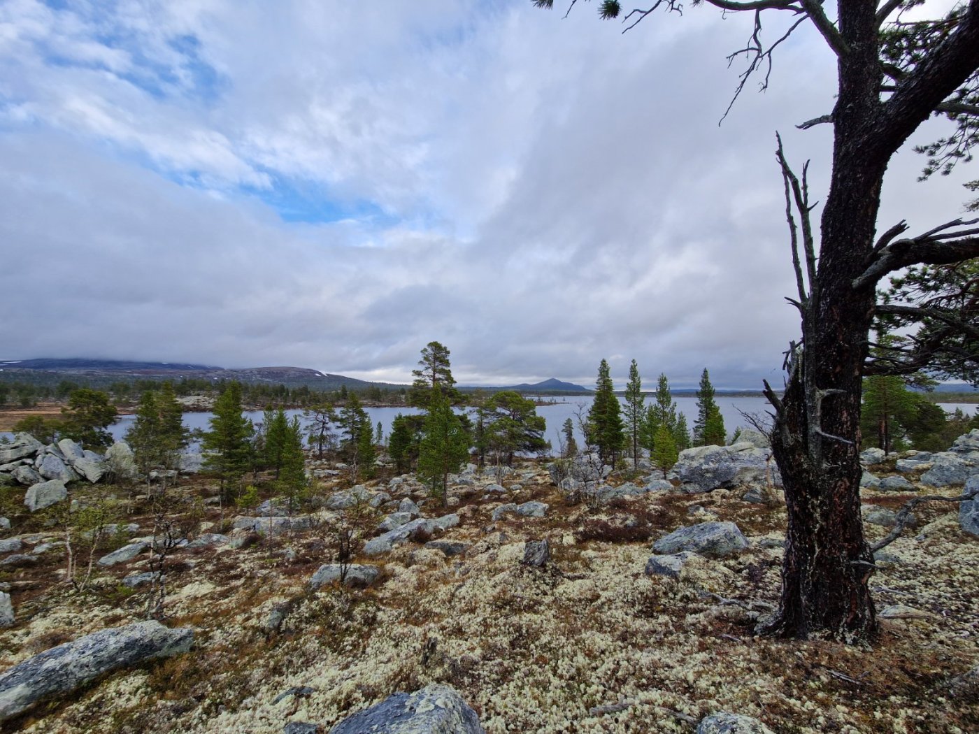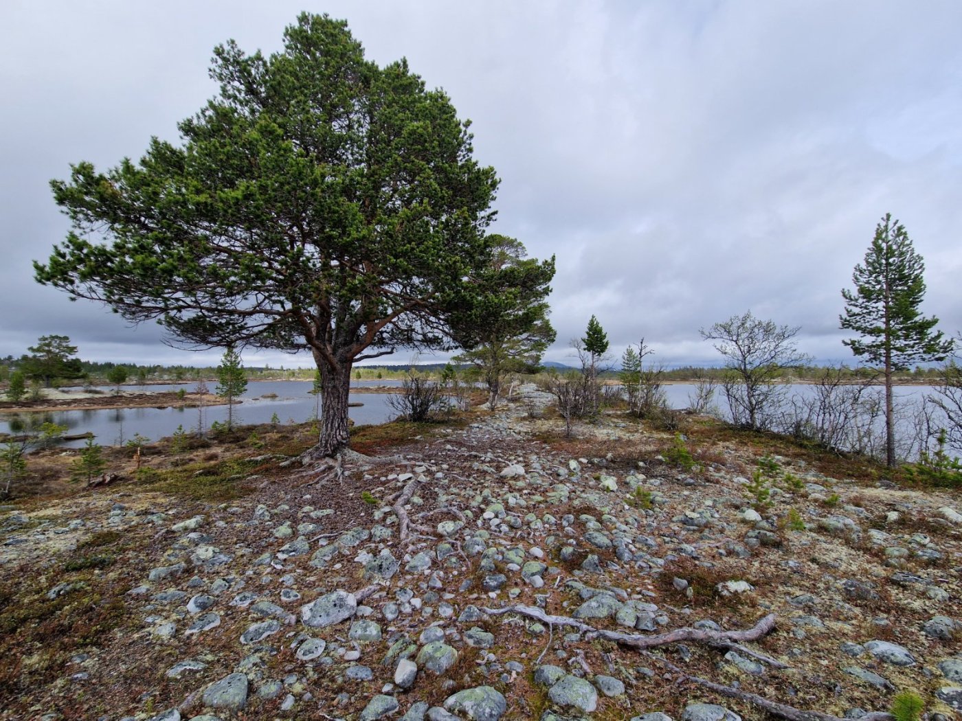 Morran etter ble ganske treg når været viste seg fra denne siden. Riktignok var det meldt litt nordavind utover dagen, så jeg valgte å ikke padle nordover men heller krysse før det begynte. Da ble det også tid til fisking midtfjords og rett og slett bare ligge å duppe litt på vannet. Padlet sørover og inn i Balvika der jeg gikk i land på ei sandstrand. Tuslet gjennom skogen og opp på Bjørnåberget. Der var utsikten fortreffelig og kaffen smakte ekstra godt på toppen. I sommer var det rimelig tørt, noe som merktes. Til og med gjennom myrene ble det knapt fuktmerker på skoa... Rart det går så bra som det gjør. Vel nede igjen på vannet hadde vinden tatt tak og det ble en strabasiøs ferd over vannet igjen. Heldigvis var det noen flere på vannet den dagen. Vel tilbake på vestsiden tok jeg meg en tidlig middag på nok en idyllisk sandstrand. Der ble det også tid til litt fisking, dog resultatløst. God og mett padlet jeg videre tilbake inn "tarmen" som går helt inn igjen til Kopparleden. den var også ganske morsom. Så var det bare den kjedelig delen med å pakke alt inn igjen i bilen og vende snuta hjem. Jeg skulle gjerne ha gjort dette til en mye lenger tur enn to dager, men bare det å få det her er en helt fantastisk opplevelse! Dette er tilgjengelig og gir skikkelig valuta for penga (tiden)! Det ligger ei ensom stor furu i terrenget.- 1 svar