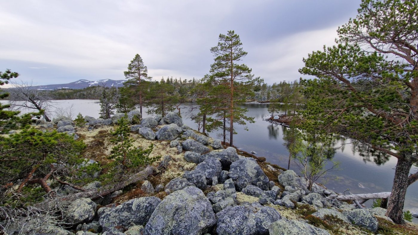 Videre fra Midtrøsttjønna fulgte jeg stien noen hundre meter oppover før jeg tok av inn i skogen. Ikke hver dag jeg navigerer på kart og kompass uten å se særlig av horisonten. Jeg visste det var ca 2 km i luftlinje og at det var et par myrer jeg tenkte å unngå. Med 30 kg på ryggen og alene i skogen er risikoviljen lav. Det ble sikre traseer og sikkert en del sikksakk, for det tok sin tid før jeg kom over kulen og så Revsjøen. Desto bedre var synet! Dette hadde jeg drømt om ei stund. Nede ved vannet pakket jeg ut packraften og var på vannet i løpet av minutter. Dette var det eneste stedet jeg traff plagsom mygg, på hele turen. Padleturen var rimelig kort bort til sandstranda ( der alle andre på tur ligger også hehe) Alene var jeg og omgivelsene som jeg hadde drømt om. Teltet satt opp og bålet tent, så var det bare å nyte kvelden. For øvrig tok det meg 7 timer fra Røvollen og til stranda. Det er vel et tegn på alderen... det ble enda mer bilder av mose og furu denne turen. Denne mosen er vel fredet(?), og ganske fin! Her bikket jeg akkurat over kulen og så Revsjøen. Fra leirplassen ved Revsjøen Litt pjuskevær var det første kvelden, men 3. juni her innbyr ikke til lange badestunder uansett...- 10 svar