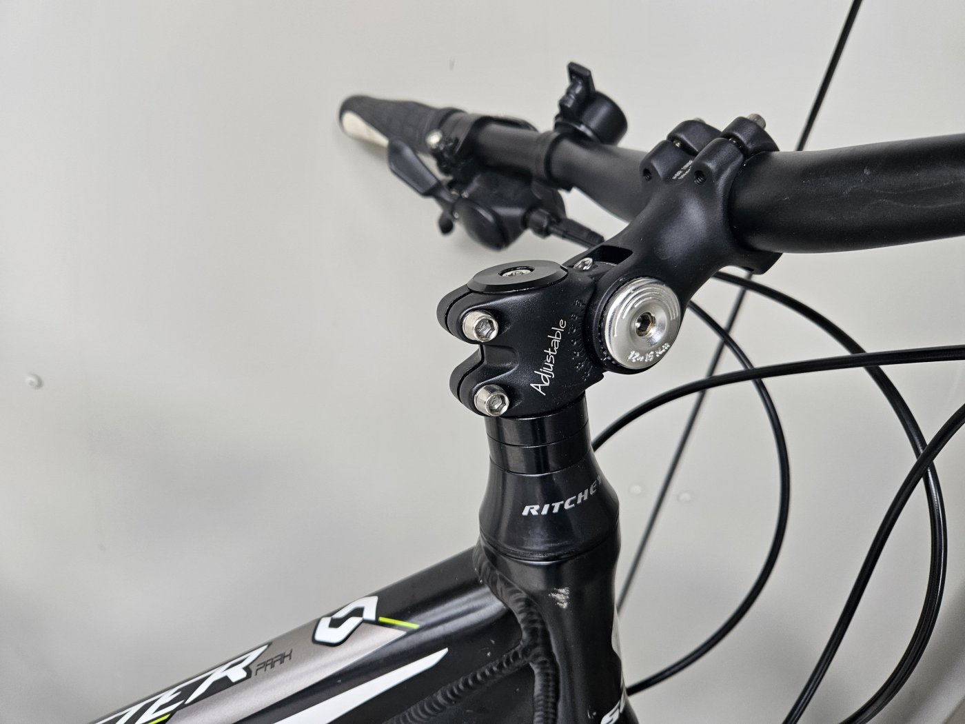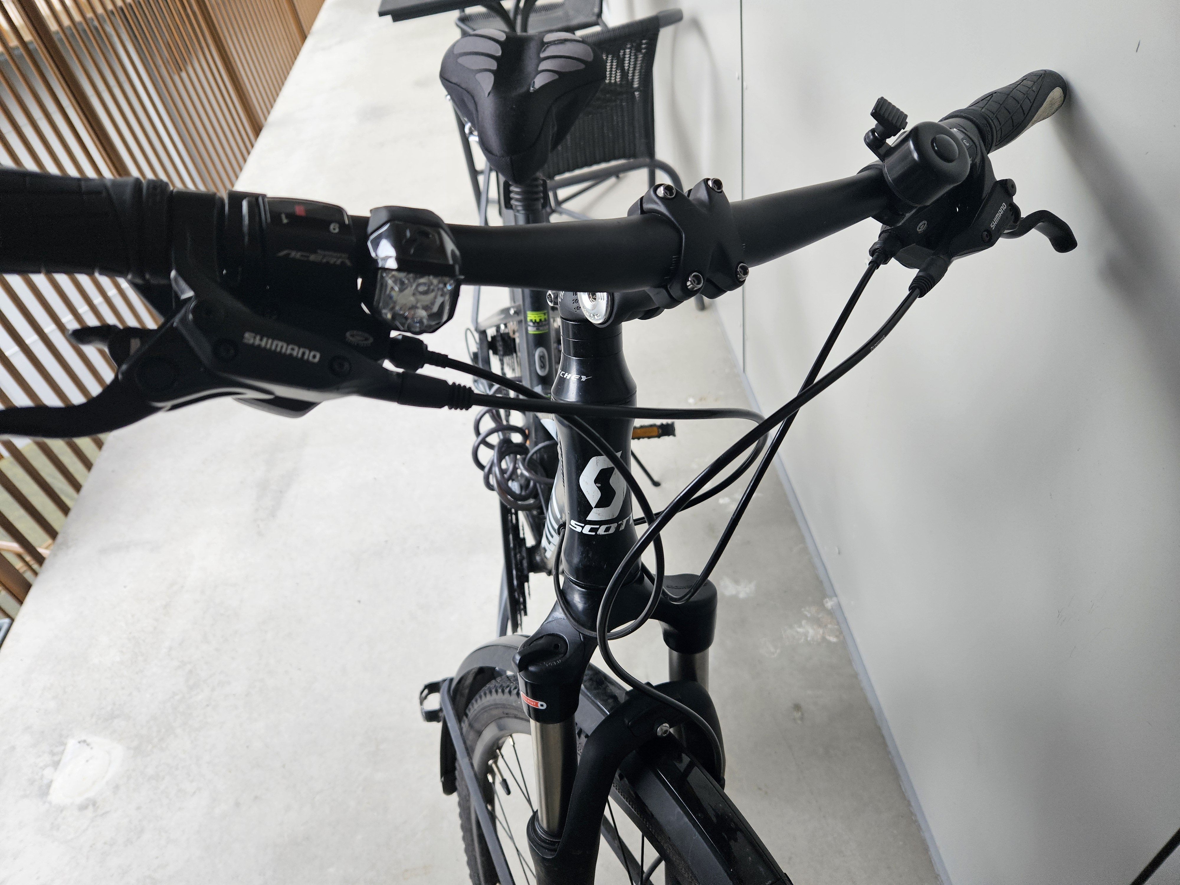 Se bilder. En Scott damesykkel. Kjøpt flere typer kurver, men sliter med å få montert dem. Mulighet 1 - styrefeste alene Her er styret med en rar form, gradvis tykkere mot midten. Festet fra biltema ser ut til bare å passe helt enkle "tynne rør" Mulighet 2 - bøyle fra hjulet + festepinne fra styret Meningen å skru av styret og tre på et festepunkt, skru på igjen styret over dette. Så feste kurven til denne, støttet opp av bøylen fra hjulet. Denne festepinnen er veldig kort, ca 11 cm. Får en kjøpt slike lengre?