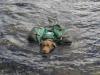 Det første jeg gjorde var og ta ned fiskestangen som var festet til sekken som en antenne, så satt jeg kursen hurtig ned skråningen mot Kallungsjåen, men det tok sin tid. Vell nede ved vannet fant jeg ly under en stor stein som tydligvis var brukt til husly tidligere for det var stablet noen steiner ved inngangen. Her var vi trygge. Buddy og jeg lå der til det værste var over.(ca tre timer)