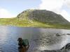 Dag fem våknet vi utrolig nok til nok en strålende dag. Vannet lå speilblankt og fjella rundt speilte seg i vannflaten. Jeg koste meg med en god lang frokost bestående av risengrynsgrøt og kaffe mens jeg nøt livet. Ikke vanskelig i slike omgivelser.