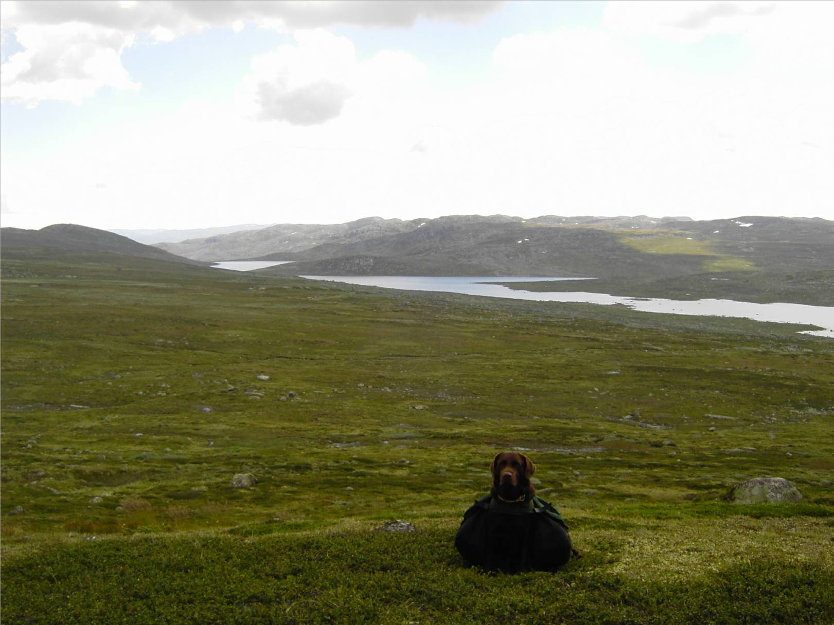 Dag fire var intet unntak fra de tre foregående værmessig. Nydelig vær og varmt. Litt i overkant varmt for Buddy, men han holdt tappert ut. Han bærer kløv med teltet og leir-tøyet mitt i, allt pakket i vanntette pakkposer.