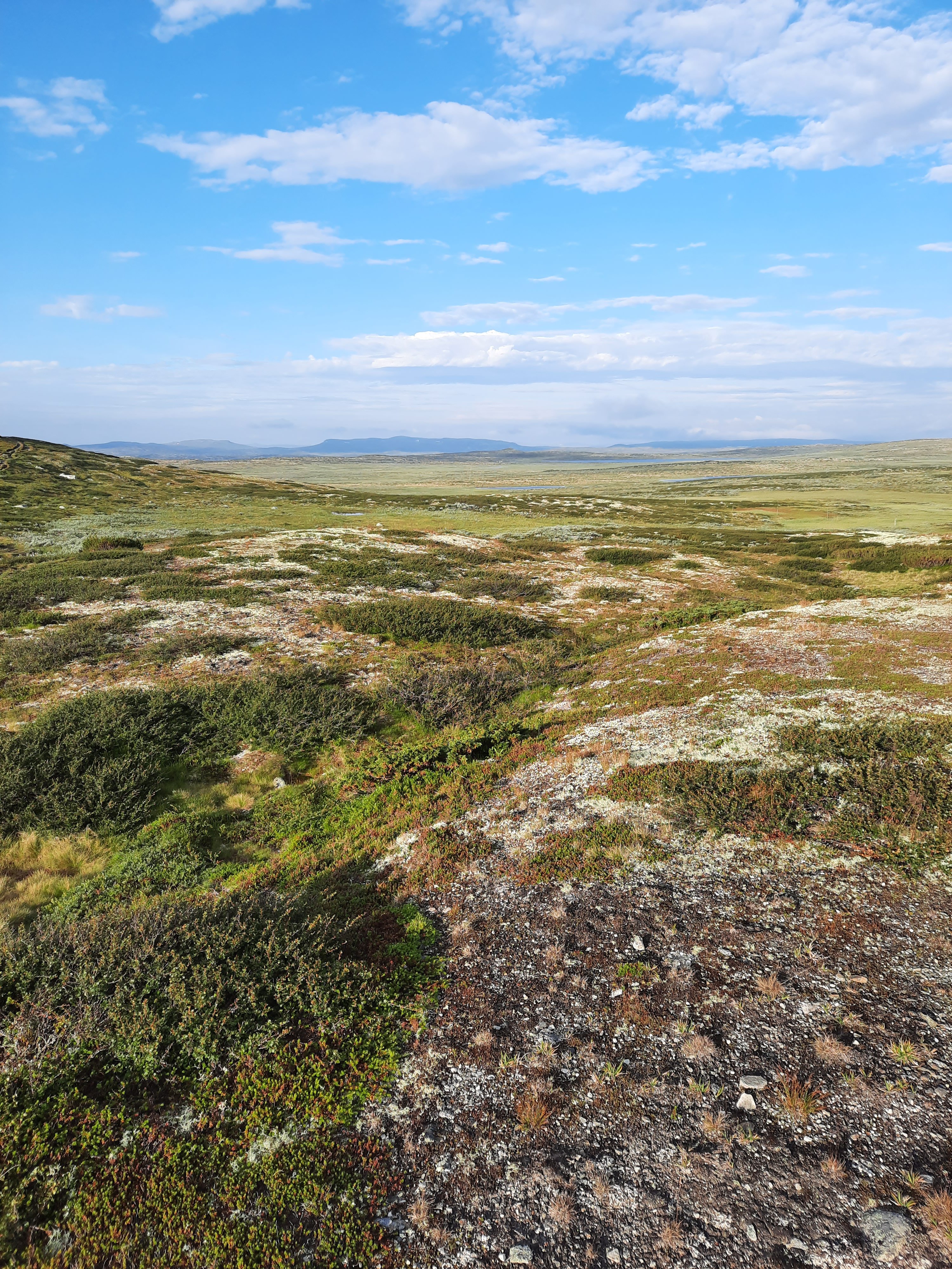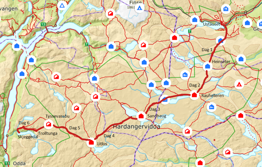 23. I fjor så gikk jeg over Hardangervidda fra sør til nord, fra Rjukan til Haugastøl. I år så har jeg gått fra øst til vest, fra Ustaoset til Skjeggedal ved Tyssedal. Jeg brukte 6 dager på turen. Dag 1: Fra Ustaoset til Heinseter Jeg tok nattoget fra Oslo til Ustaoset tirsdag den 30. juli 2024. Ved ankomst kl. 03.18 så var det mørkt. Jeg ventet til kl. 6 for at det skulle bli lyst. I starten så var det noe stigning, men når jeg kom opp på platået så ble det forholdsvis flatt. Underveis så besøkte jeg Tuva som er ei hyggelig hytte før jeg fortsatte videre til Heinseter. Denne dagen så gikk jeg ca. 20 km. Dag 2: Fra Heinseter til Rauhelleren Dette var korteste distanse, ca. 14 km. Forholdsvis lettgått terreng. Rauhelleren har et utmerket kjøkken, vi fikk servert veldig godt sosekjøtt. Det var mange folk her den dagen. Dag 3: Fra Rauhelleren til Sandhaug Dette er nest lengste distanse, ca. 25 km. Men terrenget er veldig flatt. Derfor er det lett å gå mellom disse to hyttene. På Sandhaug disket de også opp med god mat, salt fårekjøtt, hjemmelagd vossakorv med komle. Det var mye folk på Sandhaug, her var mange fisketurister. Det var bare såvidt at jeg fikk plass. Dag 4: Fra Sandhaug til Litlos Dette er lengste distanse, ca. 26 km. Terrenget er ikke like flatt som det dagen før. Men det var fint å gå der. Dag 5: Fra Litlos til Tyssevassbu Lengden er på ca. 20 km. Dette var den mest kuperte delen av turen og det var ikke helt enkelt å følge stien på slutten. Den siste delen av turen burde vært merket bedre. Tyssevassbu er den eneste ubemannede hytta på denne turen. Dag 6: Tyssevassbu til Skjeggedal via Trolltunga Turen ned til Trolltunga var kronglete, kupert og dårlig merket, ca. 7 km. Etter det så fulgte jeg ruta til Skjeggedal, ca 15 km, den er lett å følge. Så her gikk jeg litt over 20 km. Været var bra under hele turen, det kom ikke noe regn. Delvis overskyet deler av turen og perioder med sol. Temperaturen var enkelte dager såpass bra at jeg droppa t-shirts. Denne turen passer for folk som er i alminnelig god form og som liker å gå lange dagsetapper. Total lengde er ca. 127 km. På tur til Heinseter: Her fra Tuva som jeg passerte. De liker tydligvis ikke termoser. Ytterst få personer kan få gratis påfyll: Endelig på Heinseter: Uendelig med vidde: Sandhaug: Kveldsstemning på Sandhaug: Litlos i morgendis: Fremme ved Tyssevassbu: Fra Trolltunga. Personen helt ytterst satt med føttene utenfor kanten. Unødvendig risikosport spør du meg. "Because death is so permanent". Her er ei lenke til turen som jeg gikk i fjor: