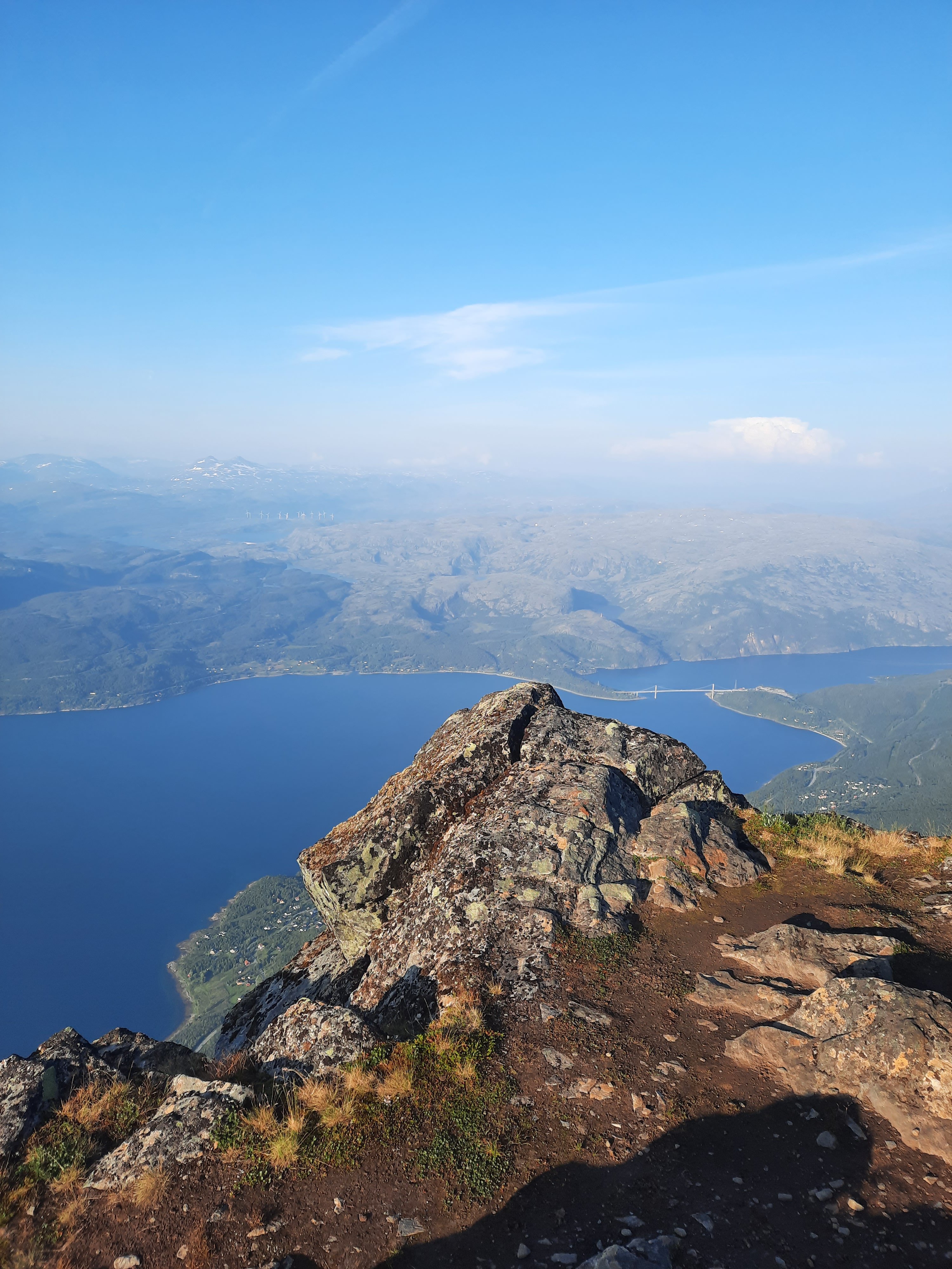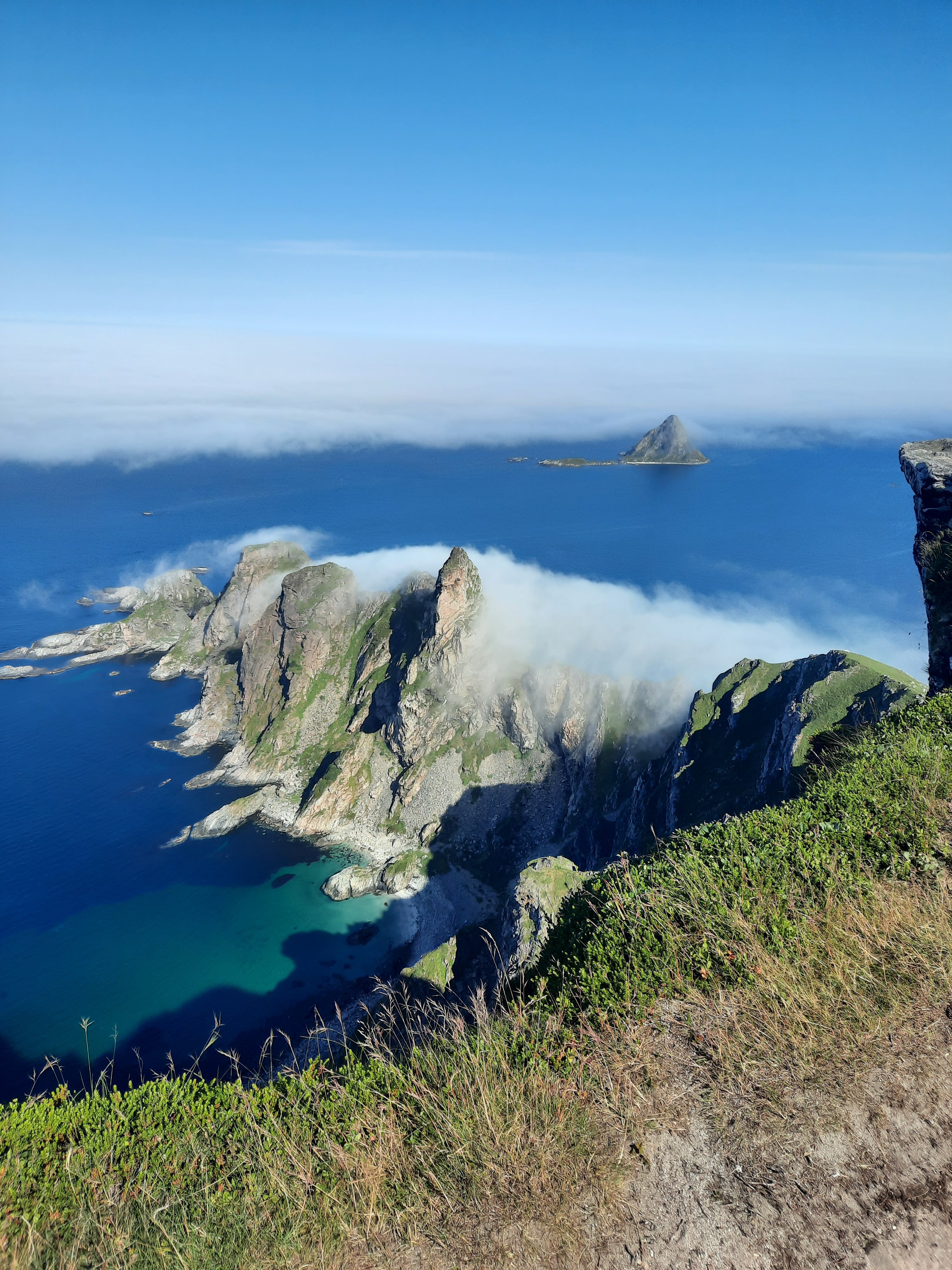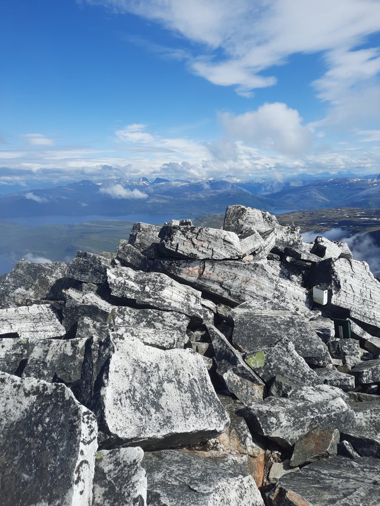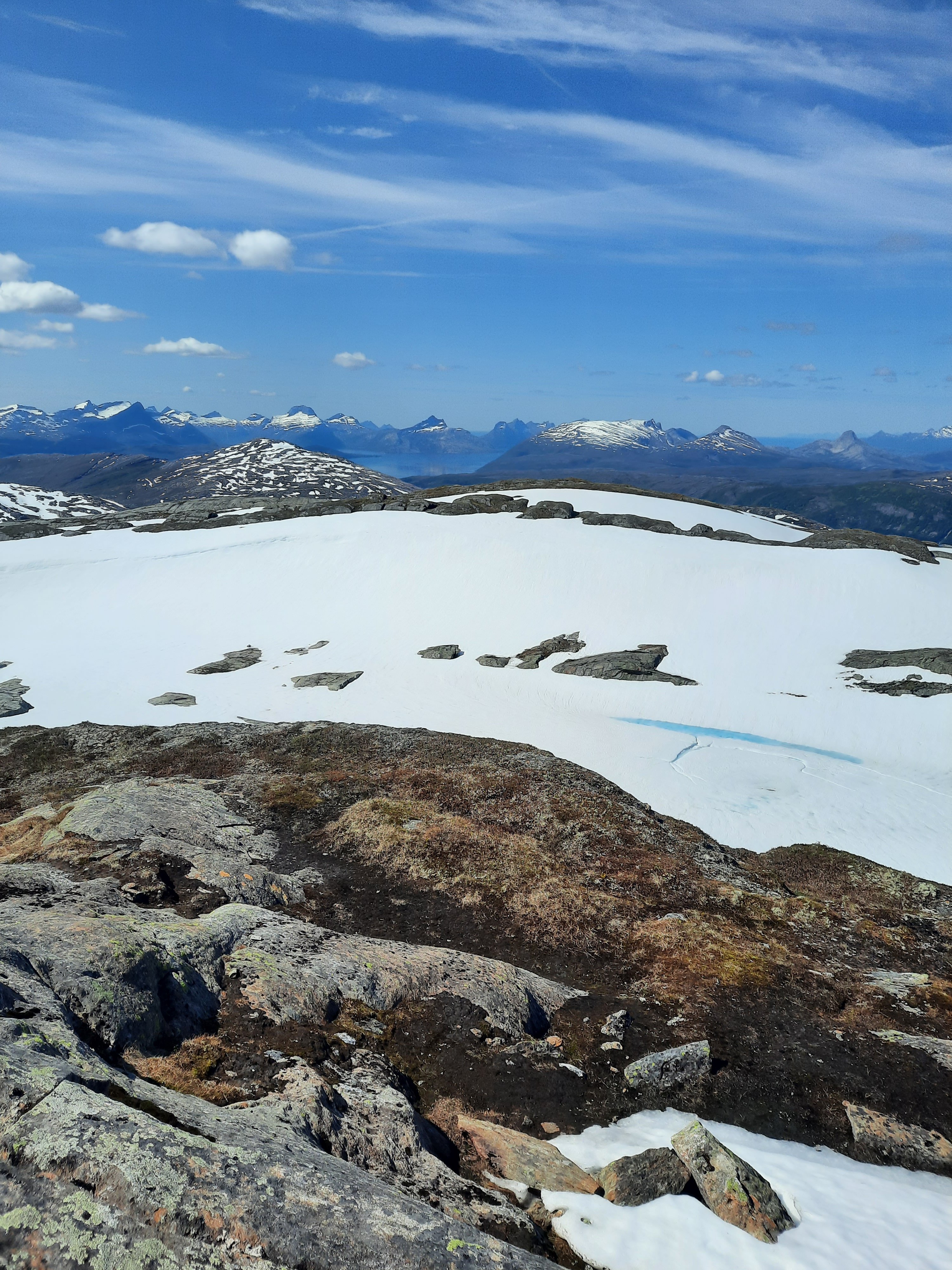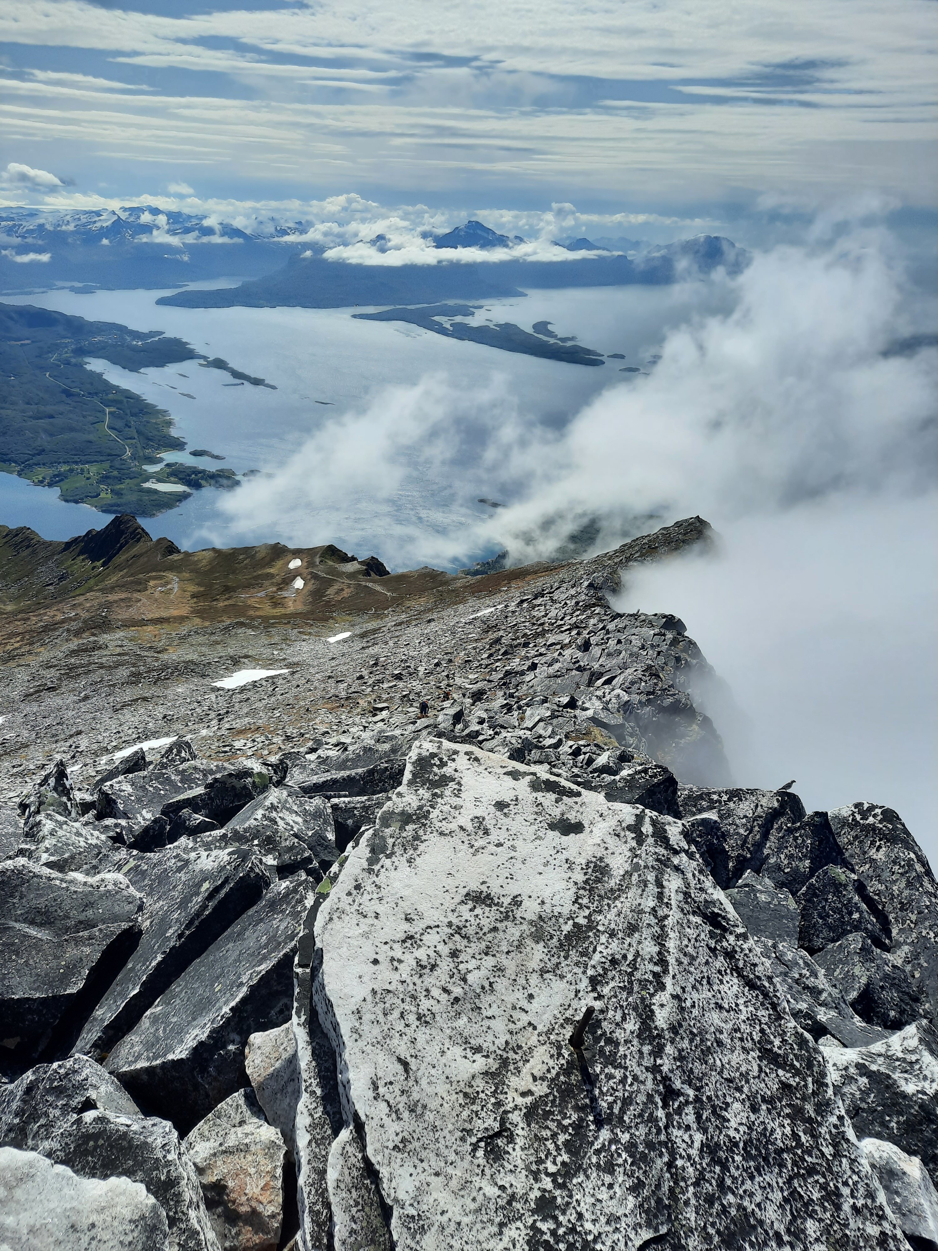 15. I dag så ble det tur til Sandhorntinden 993 moh. i Gildeskål kommune. Oppstart ved havnivå, lengde t/r ca. 10,2 km, tok nesten 5 timer. Utsikt fra toppen, havtåka kommer lurende: