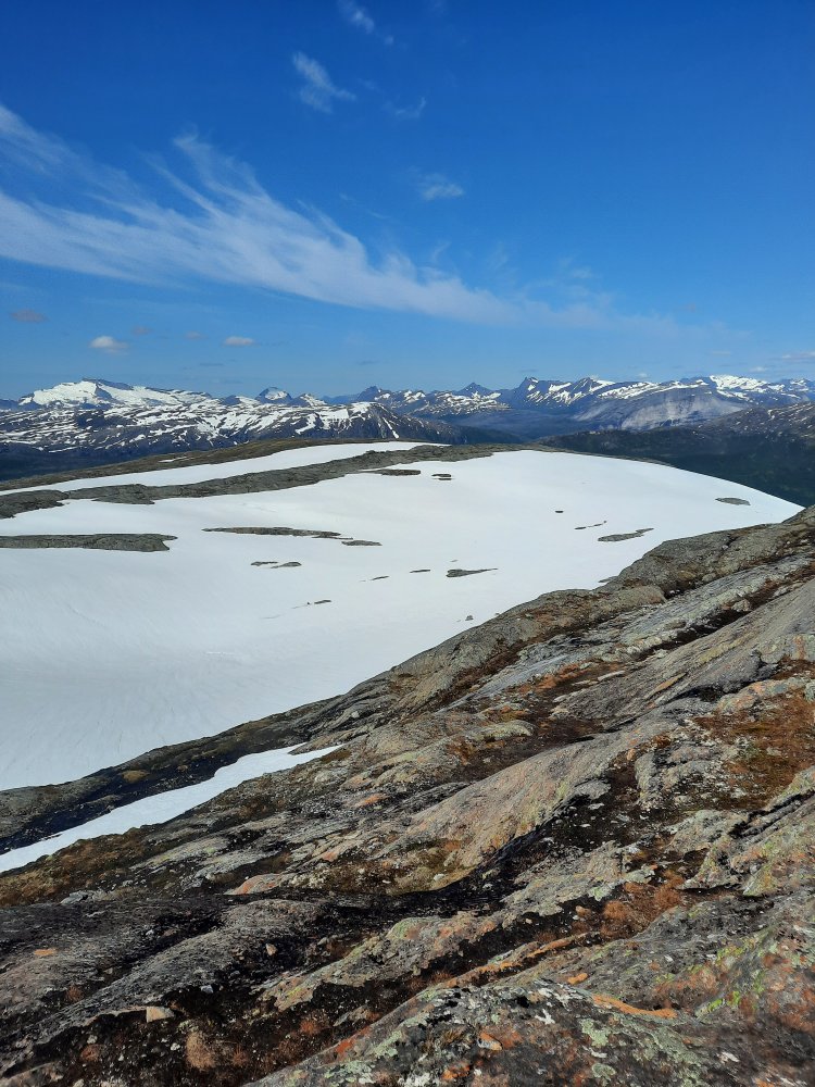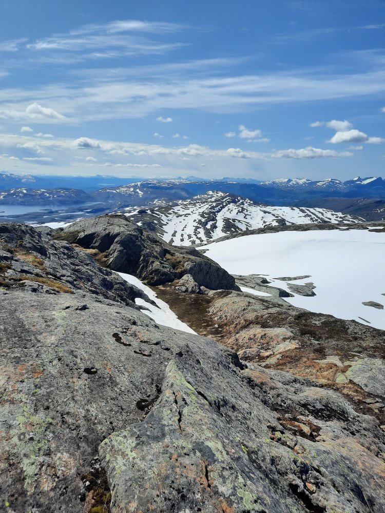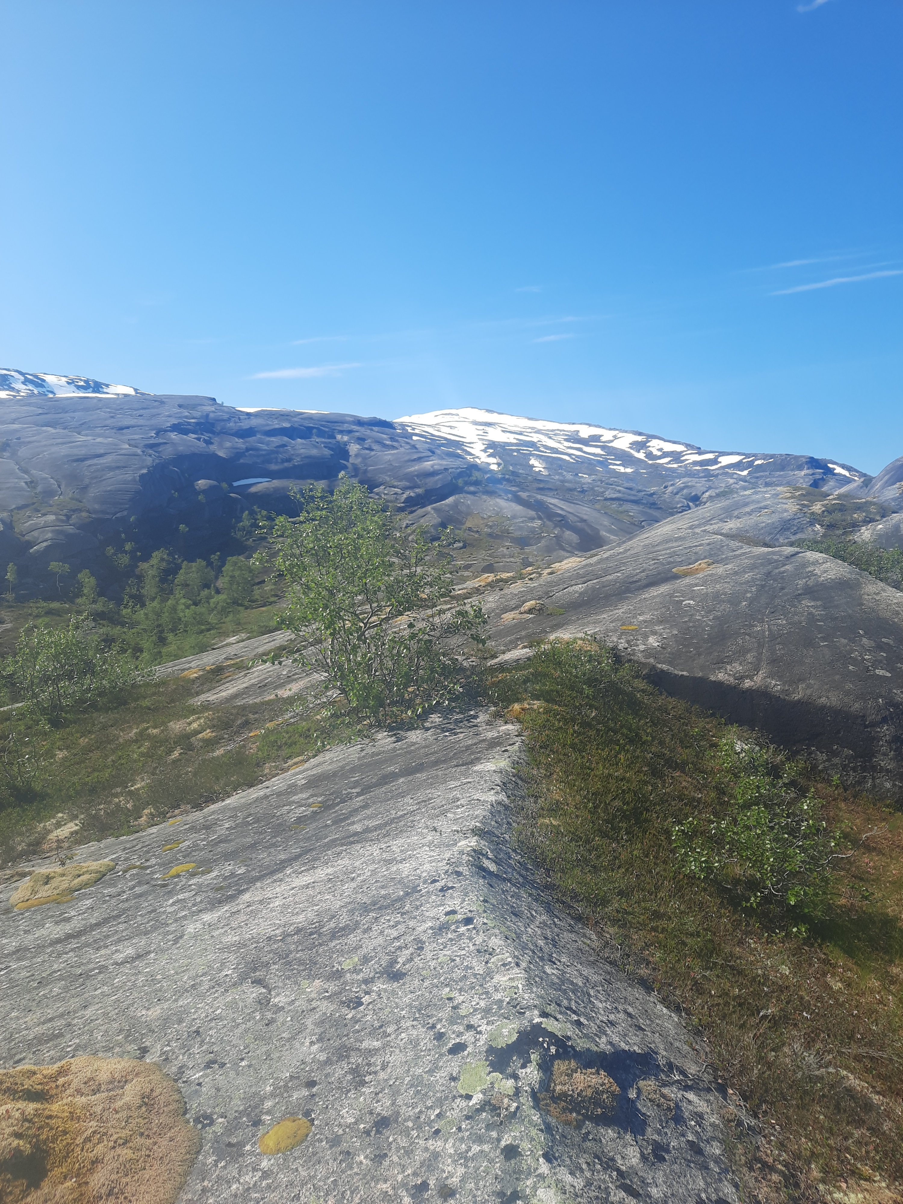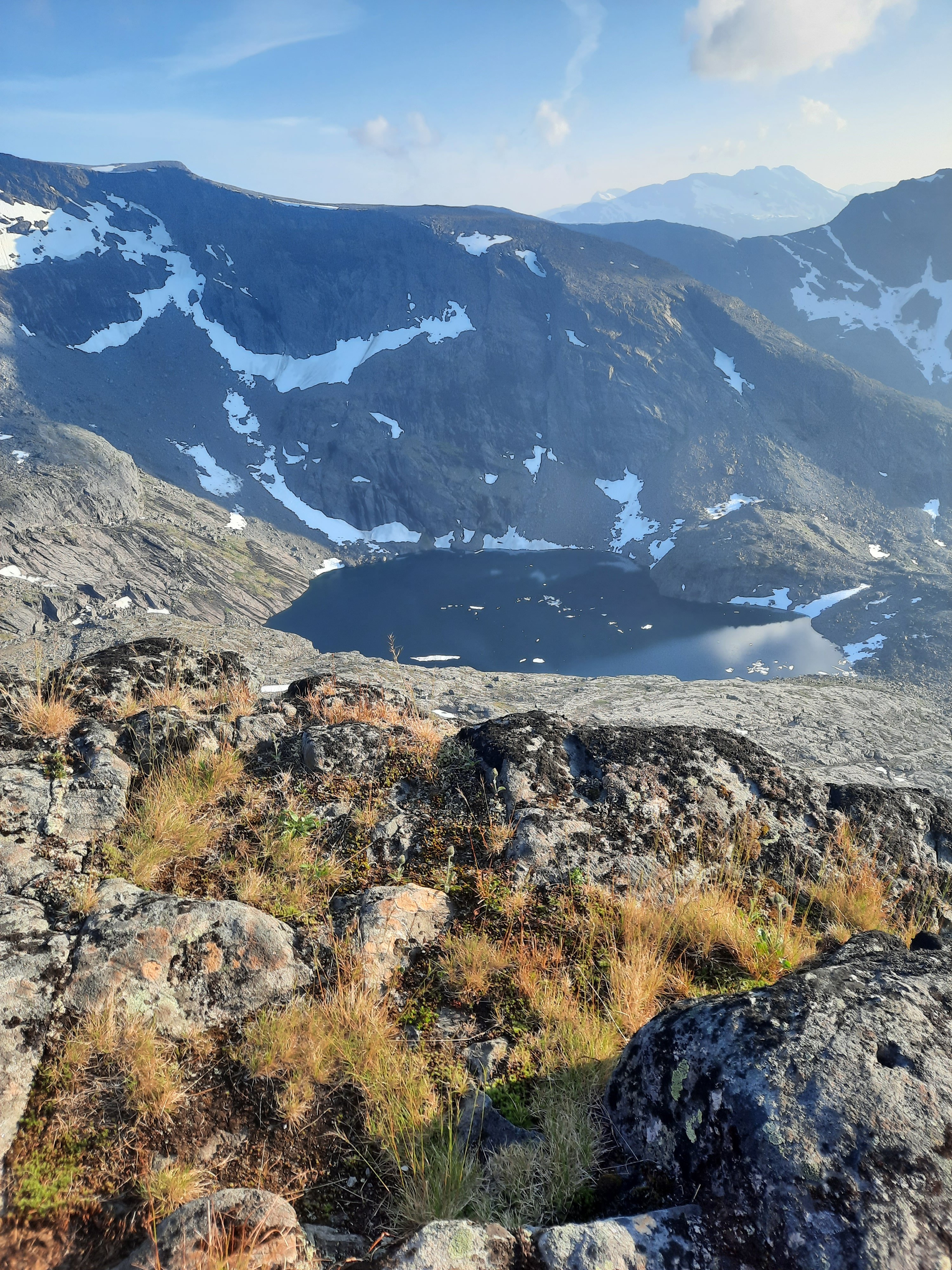 18. I dag så var jeg på Litltinden i Bodø, 717 m.o.h. Turen tok 3 timer i pent vær, lengde 7 km t/r i lett terreng. Dagens turmål med kort anmasj fra veg: God utsikt og langt ned utenfor kanten: Retning øst: Mot nordøst under. Bak til venstre er Strandåtinden, litt til høyre for midten er den hvite toppen Sjunkhatten. Begge to er kjent i klatremiljøet.