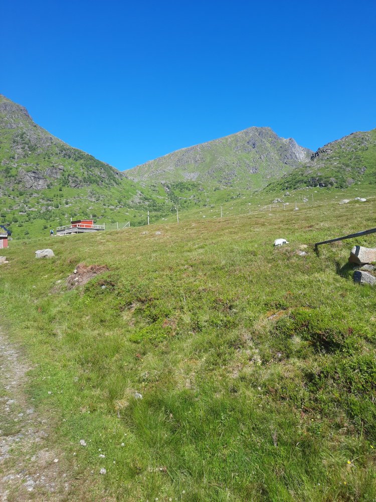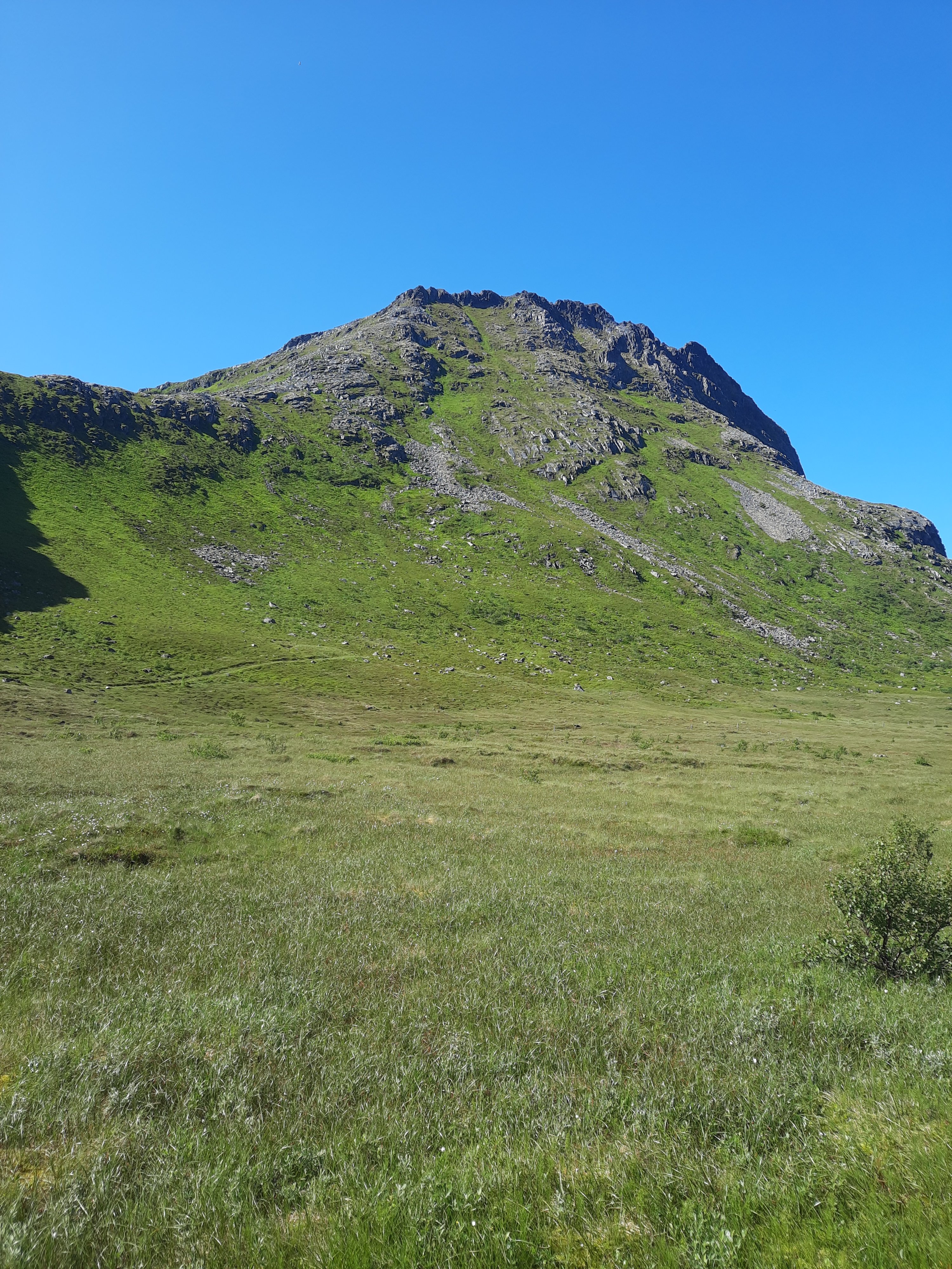 13. Volandstinden ble dagens turmål. Det er en liten topp på 457 moh. i Flakstad kommune i Lofoten. Lengde ca. 5 km t/r, tok 3 timer. En enkel tur i pent vær ble det. Volandstinden: Retning sør: Mot nord, tettstedet Ramberg: Retning øst: