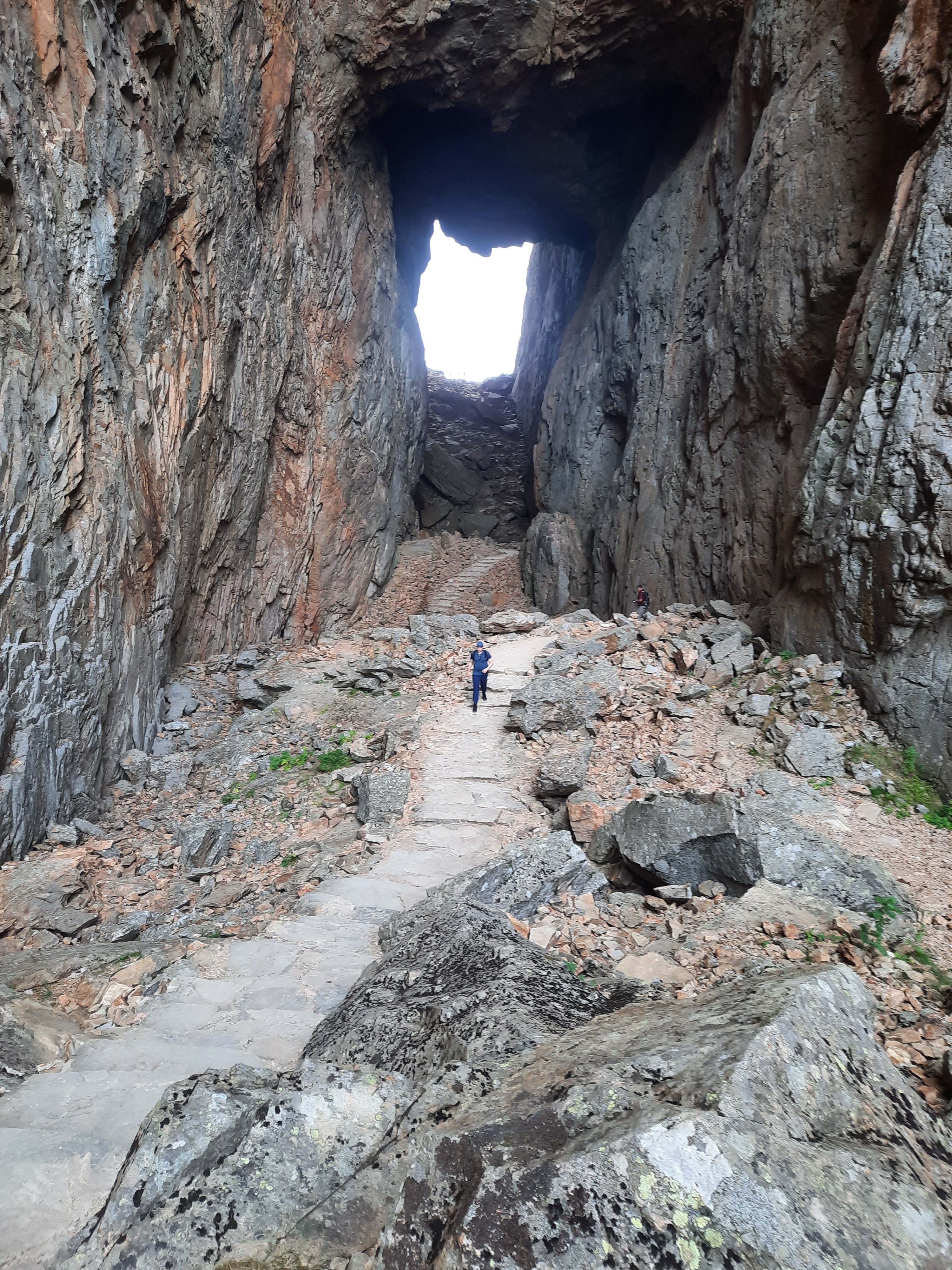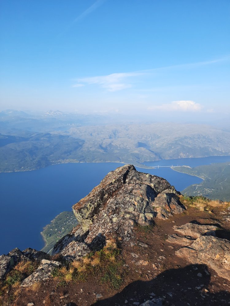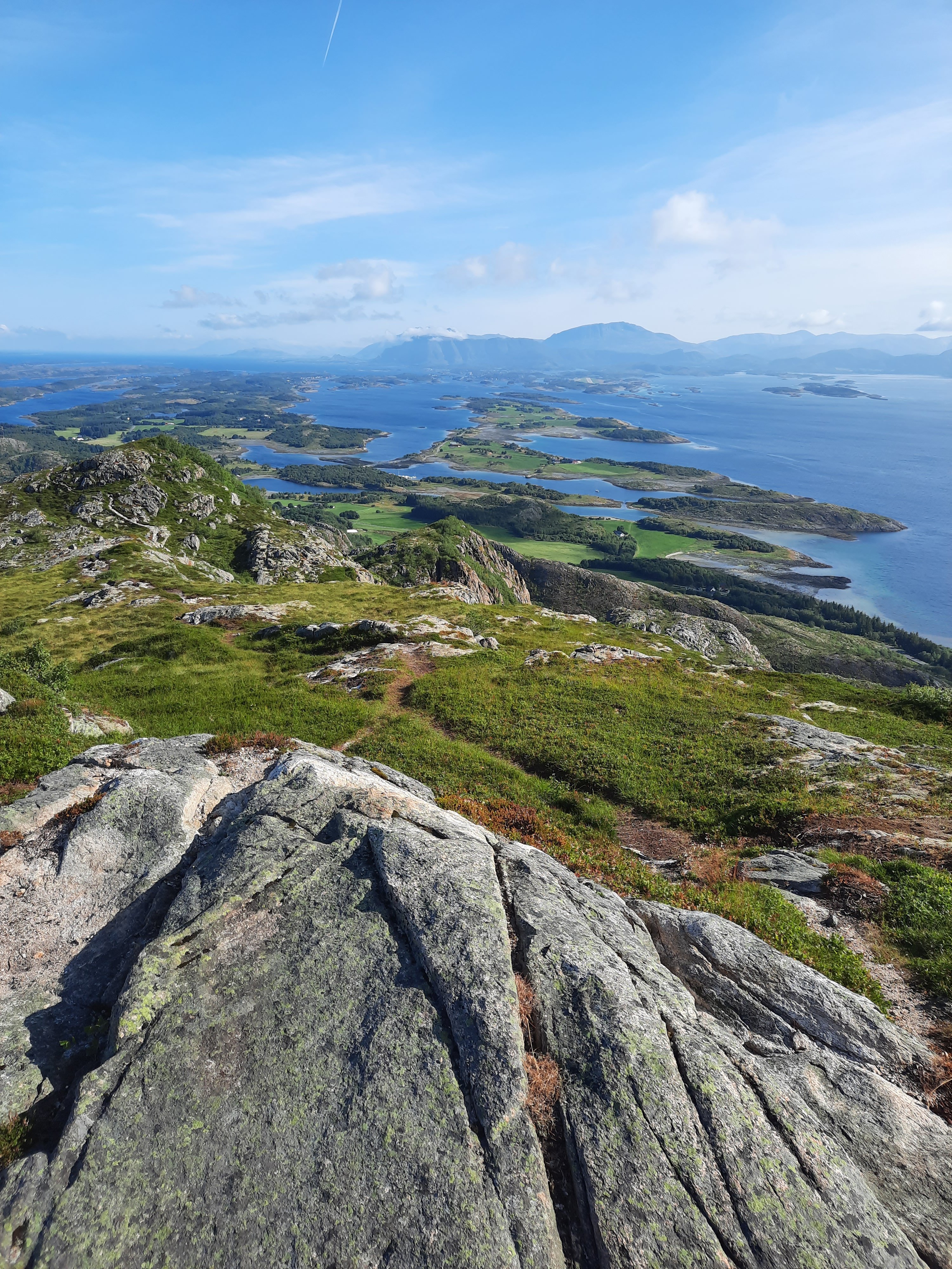 9. I dag så gikk jeg opp på toppen av Torghatten. Etterpå så gikk jeg gjennom hullet. Her kommer noen bilder: På tur opp mot hullet: Store dimensjoner: Fra toppen retning Brønnøysund:
