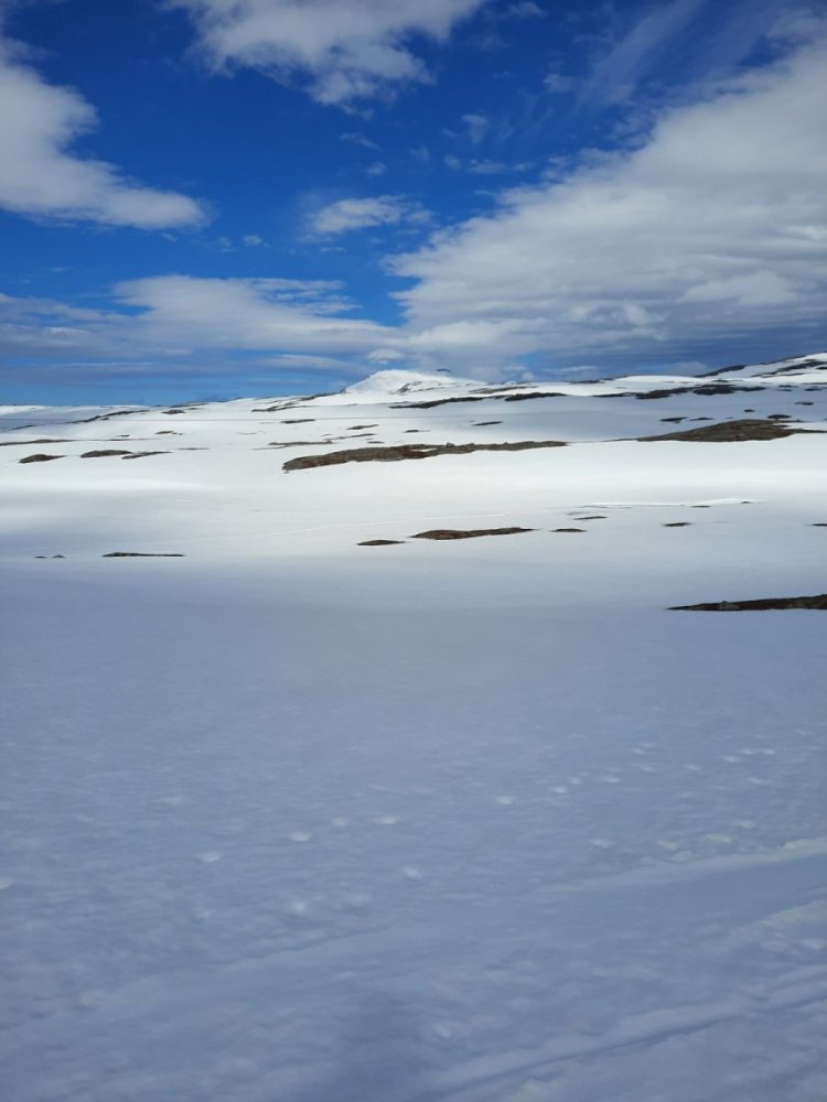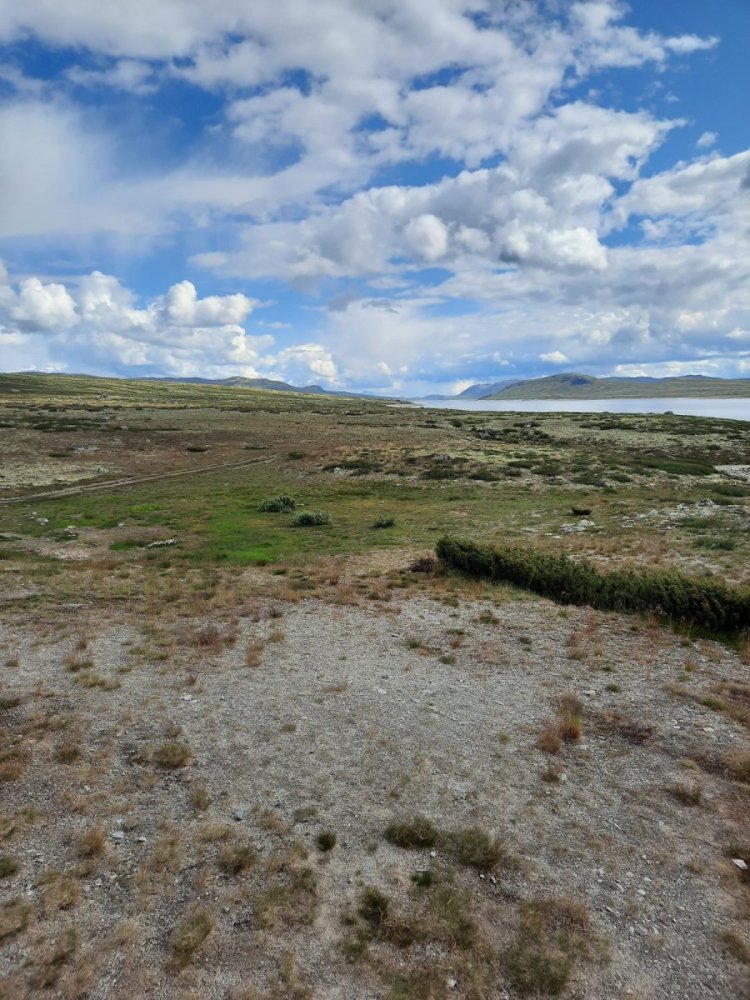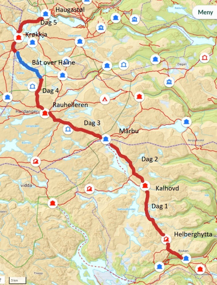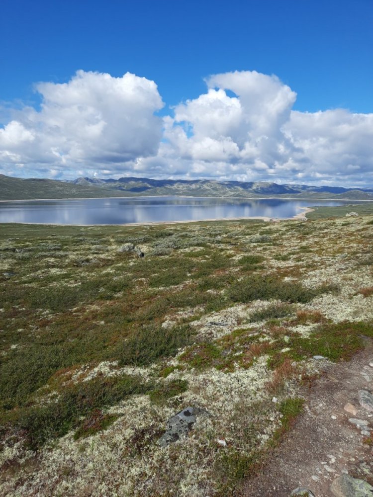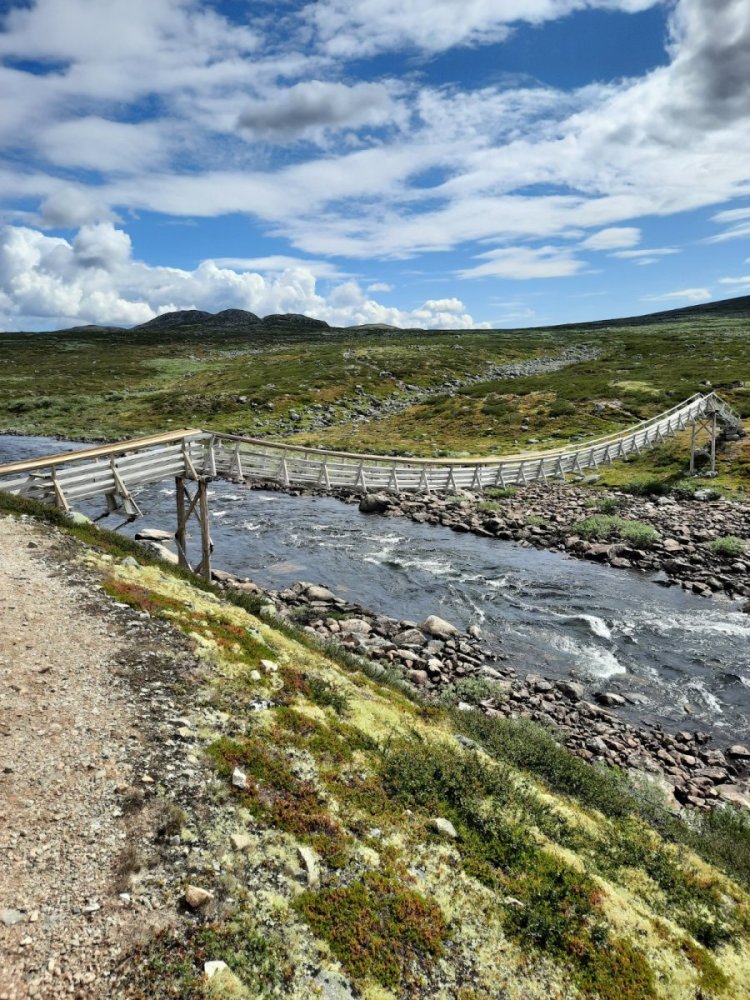 Turen over Europas største høyfjellsvidde med sitt bølgende landskap har jeg har gledet meg til lenge. De lange linjene gir nesten et blikk inn i evigheten. Det er langt å gå mellom hyttene, men likevel er det lettgått siden det er så flatt terreng. For meg som er vant til høye fjell og mye opp og ned, så var dette en ny og fin opplevelse. Jeg brukte 5 dager på turen. Dag 1: Fra Rjukan sentrum til Kalhovd Jeg haster avsted fra hotellet til Krossobanen for å rekke første tur opp med Krossobanen kl. 9. Dette var torsdag 27. juli 2023. Vel oppe etter “flyturen” fra Rjukan så blir jeg møtt av et skilt hvor det står at det er 31,2 km til Kalhovd. Været er bra, litt overskyet, men varmt og godt med vind. Litt gjørme var det noen steder, blant annet ved demningen på Strengen, men stort sett bra underlag. Denne første distansen er den lengste, turen fra Rjukan sentrum til Krossobanen var på ca. 2,5 km, så da gikk jeg ca. 33,7 km den første dagen. Overnatting på den ubetjente Helberghytta underveis er en mulighet for de som ønsker en kortere dagsetappe. Dag 2: Fra Kalhovd til Mårbu Lengden på denne turen var 22 km. Været var bra med sol og vind. Men deler av strekningen var en grisete affære med myr. På sydsiden, rett før Mårbu, så var det noen få kilometer med mye myr og gjørme. Foruten dette så var denne strekningen grei å gå. For de som ønsker å hvile føttene eller slippe myr så er det mulig å gå til Synken for å ta båt over innsjøen Mår til Mårbu. Dag 3: Fra Mårbu til Rauhelleren Dette var dagen med det fineste været. Termometeret viste 18 grader, nesten ikke en sky på himmelen og noe vind. Denne turen var på 22 km med godt tørt underlag. Turens høydepunkt grunnet været. Dag 4: Fra Rauhelleren til Krækkja Denne dagen startet med oppholdsvær. Men en time før innsjøen Halne så fikk jeg en skikkelig omgang med regn som varte resten av dagen. Lenge siden sist jeg var så våt og pjuskete. Rakk så vidt båten Halnekongen som går over innsjøen Halne. Vel på land på den andre siden etter ca. en times båttur så bar det avsted til Krækkja. Det var godt å komme fram til ei varm hytte, for dette var den eneste dagen med dårlig vær. Avstand fra Rauhelleren til innsjøen Halne var på ca. 9 km. Fra nordsiden av Halne til Krækkja så var det ca. 5,5 kilometer å gå. Dag 5: Krækkja til Haugastøl Dette var korteste dagstur, ca. 13 km. Været var bra, men den siste halvtimen før Haugastøl så kom regnet. Lettgått terreng med nedoverbakke rett før Haugastøl. Her sluttet jeg turen, jeg tok toget til Oslo. Mange går fra Krækkja til Finse. Jeg valgte Haugastøl siden det er mindre steinur her. Alle hytter som jeg overnattet på var DNT hytter. Takk til DNT for ypperlig mat og hyggelig betjening. Det var lite folk på hyttene. Jeg lå på fellesrom/sovesaler på alle steder, men var eneste person på sovesal. De andre turgåerne på hyttene bodde på “enerom”. At det var så få personer på tur kan vel skyldes at Yr meldte om dårlig vær. Ifølge Yr så skulle det regne 4 av de 5 dagene. Men det var bare en dag med mye regn og litt regn den siste dagen. Ellers var været strålende. Turen anbefales for de som liker å gå langt over flere dager. På tur opp med Blåbæret. Rjukan sentrum nede i dalen. Gaustatoppen i bakgrunnen: På tur innover vidda: Her tok nok Yr feil angående dårlig vær: Fra Mårbu: Hengebru rett før Rauhelleren: