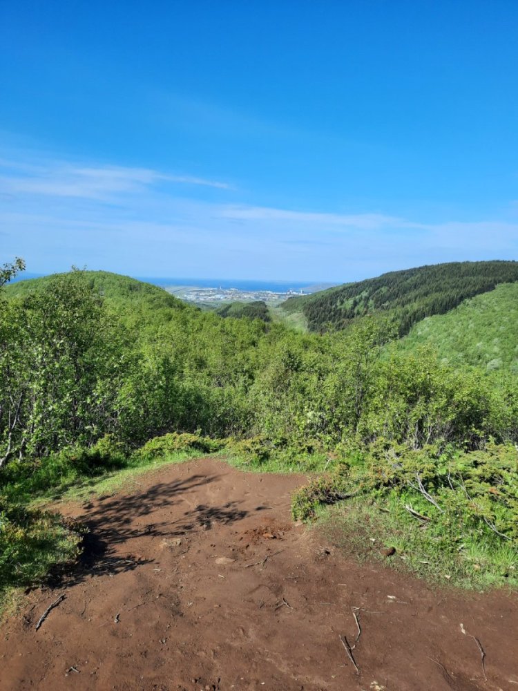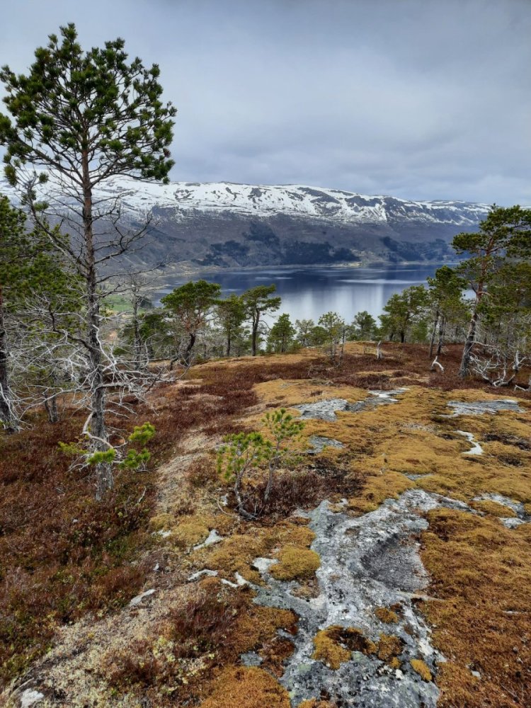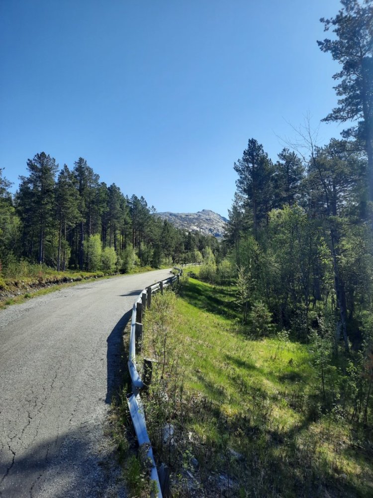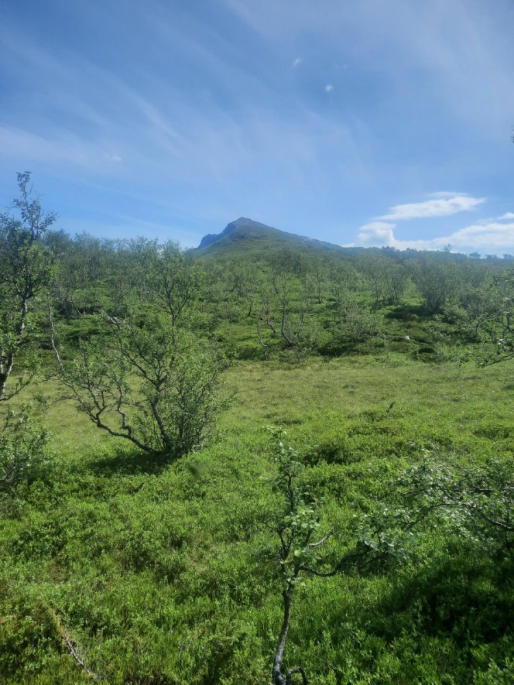 Dagens tur gikk til Blombakkfjellet 552 m.o.h. i Bodø kommune. Oppstart fra Heggmoen. Lengde ca. 8 km, tok 3 timer. Fantastisk vær uten en sky på himmelen. Men det er på tide med litt sol her oppe, for det har regnet konstant i nesten en måned. Når sola dukket opp på torsdag så undret jeg: "Hva er det der for slags UFO". Dagens turmål dukker opp mellom trærne: Fra toppen mot vest: Retning nord, melis på toppene: Mot sør, Mjønestindan: