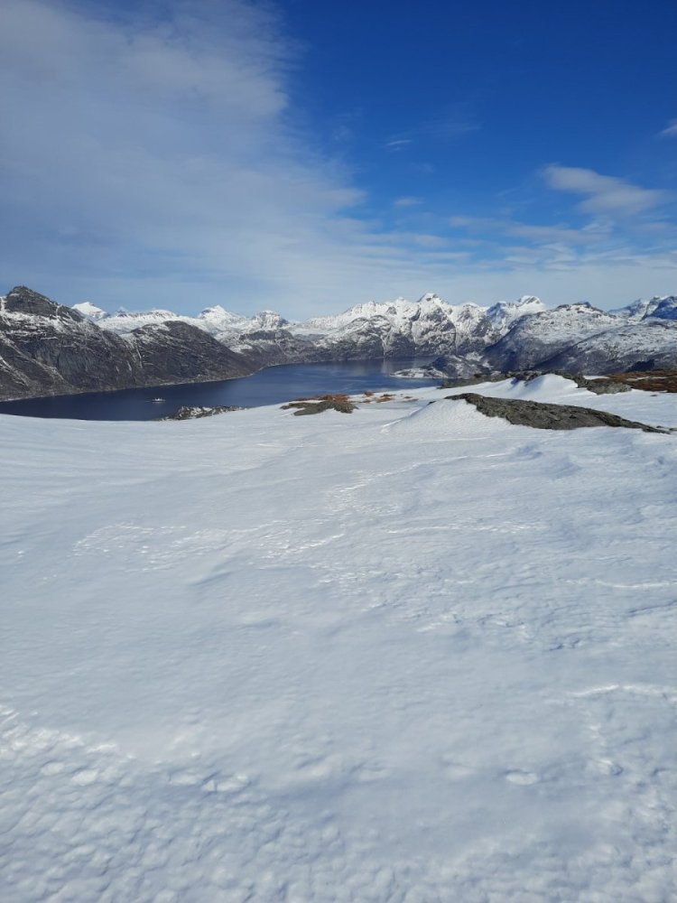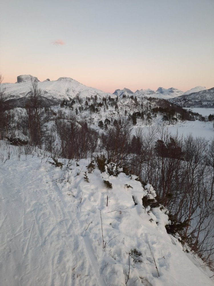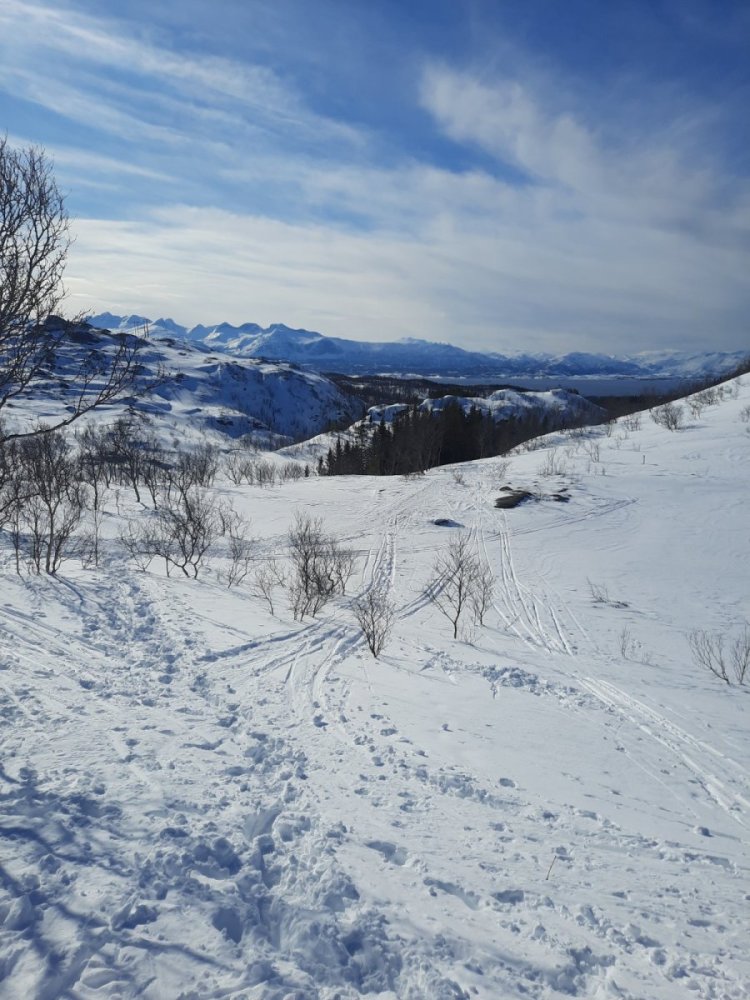 Skituren jeg hadde i dag var helt annerledes enn den i går. I dag så var det skikkelig bra vær. I går så var det overskyet, regn og vind. Rart hvor det kan skifte på en dag. Gikk tur nord for Mjeldetindene i Bodø. Mistfjorden mot Kjerringøy: Steigtinden:
