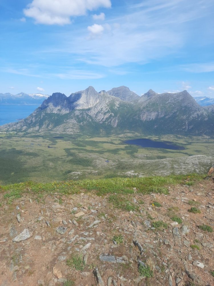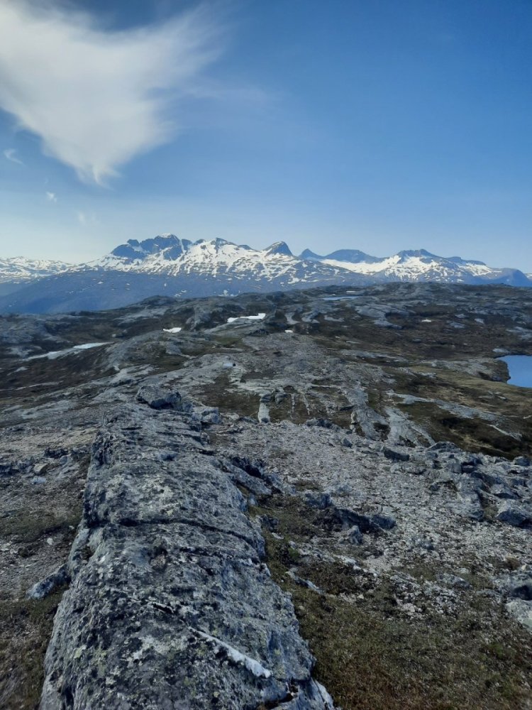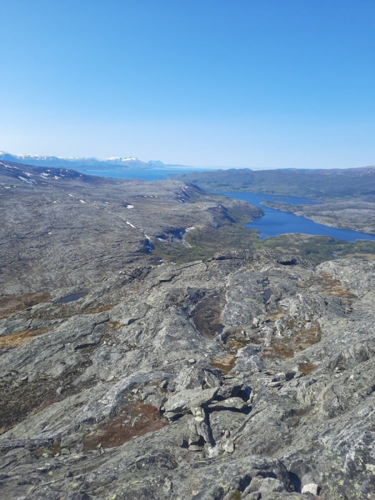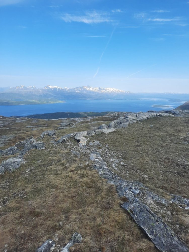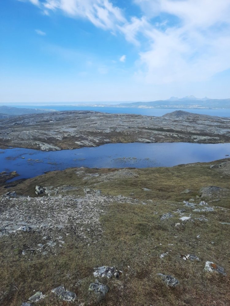 I dag så har jeg gått fra Heggmoen til øverst i Mjønesskaret. Dette er litt over to mil øst for Bodø sentrum. Været var upåklagelig, for en gangs skyld. Den siste tida så har vi vært belemret med mye regn og vind. Turen tok 3 timer og 10 minutter og distansen tur retur er på 10,4 km. Jeg er med på Ti på Topp. Dette var min 11 topp av totalt 16. Retning øst mot Fauske. Helt bake til venstre skimtes Suliskongen og Dronninga: Mot vest. Her ser vi Steigtind og Multinder midt i bildet. Til høyre Heggmotinden: