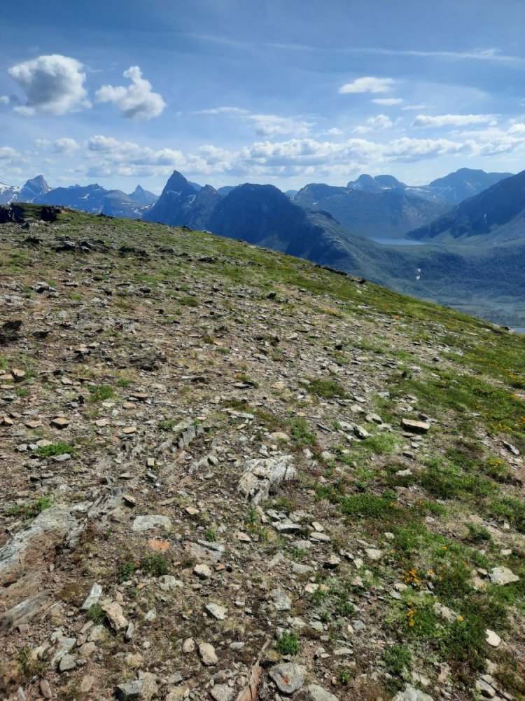 Ørfjellet (eller Ølfjellet) med sine 1751 moh. er det høyeste fjellet i nasjonalparken på Saltfjellet. I følge Wikipedia så er primærfaktoren på 1071 m. Toppens sekundærfaktor på 47 kilometer er blant de 40 lengste i Skandinavia. Ørfjellet ruver virkelig der det ligger i Saltdal. Når jeg kjørte E6 sørover forbi Rognan så var det dominerende i horisonten, flere mil unna. Dette var den 12. juli 2022. Ikke en sky på himmelen og knallsol. Svingte av E6 ved Storjord og fulgte en smal kjerrevei til Kjemåforsen hvor jeg parkerte bilen på 384 moh. Vegen opp fra E6 var ikke så mye å skryte av, så kjør sakte. Temperaturen klokken halv ti var på 18 grader. Terrenget var ulendt og litt kupert i starten. Når jeg kom opp på det første platået så gikk det litt lettere. Ved enden av platået så var det ei ny stigning til neste platå. Da nærmet jeg meg siste oppstigning til toppunktet. Her er det mye steinur med store faste blokker. Det gikk helt fint å komme seg opp på toppen, litt enkel klyving helt på slutten. På toppen så var det flott utsikt i alle retninger. Herfra så var mange tinder synlige, blant annet: Børvasstindene, Landegode, Eidetinden på Kjerringøy, Sulitjelmakongen og dronningen, lofotveggen var også mulig å se. Når jeg kom tilbake til bilen så var temperaturen 26 grader. Hele turen så var det mye vind som holdt insektene unna. Et mer perfekt turvær kan man knapt få. Turen opp tok 4 -5 timer, ned nesten 3 timer. Lengde tur retur ca. 16 km. Ørfjellet midt i bildet: Utsikt nordover mot Saltdal: Mot nord, her ser vi Børvasstindene, Landegode og lofotveggen: Kjemåforsen: