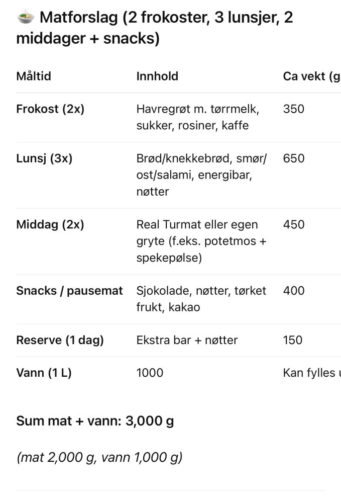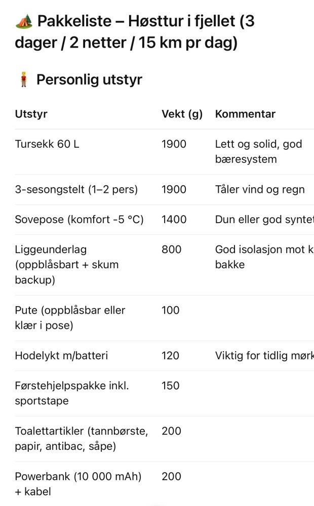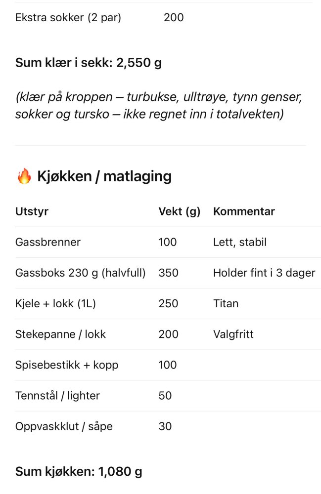 21. Jeg «går turen» i hode, og tenker gjennom hva jeg trenger. Men noen ting er nesten ferdig pakket. Har dog greid å glemme teltplugger heldigvis på en mc- 3 ukers tur. Ble å gå i resepsjon og låne div gjenglemte plugger, kjøpte ei pakke store Torx-skruer som ble brukt resten av turen. Ei pakkliste kan jo være lurt, men bør også innholde: Passer og virker gassboksen med valgte brenner. Er powerbanken oppladet Funker hodelykt og er ladet Har du med rett sett med teltstenger Passer ski og skisko sammen! Er Inreach ladet og aktivert for turen. Funker evnt vannfilter Er kniven skarp Men jeg skal teste det og gi litt innspill. @Ivan Lé Hjelmeland fikk jo masse input på Topokart appen sin, og den er ekstremt god.