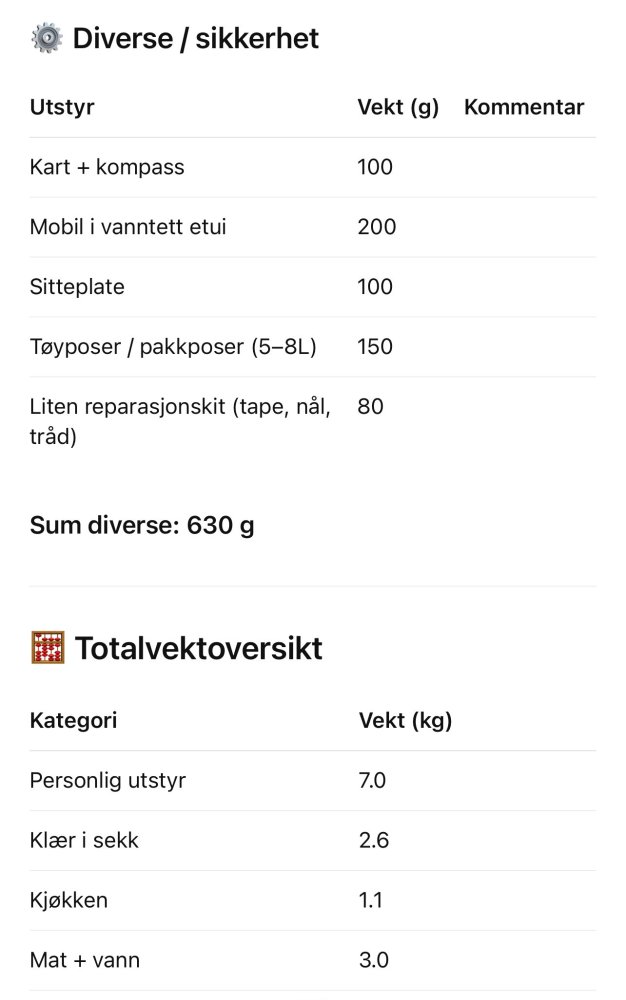 22. Jeg tenker nok motsatt 🙈, prøver å ta med minst mulig, og som regel er det slik at om pakkevolum er lite, så er vekta ok. @haakon86 - du må ta med volum, og om volumet er «fast eller formbart» Så putter jeg i sekken det jeg trenger for turen, og veier den av og til. Bruker nok mer tid på å tenke ut hvordan jeg skal ha resupply punkter på lengre turer. Men har tidligere veid mye, men med litt erfaring blir vekta ok. På dagsturer putter jeg gjerne litt ekstra i sekken, så jeg får omtrent det jeg har på en flerdagstur, litt for å styrke helsa. Støtter @sneakyowl ang at det ser ut som en betalt tjeneste! Men apper som kan hjelpe andre er flott 🤩, Burde vært en eget varsel- trenger du virkelig denne😂. Lettest du har i sekken er det som blir igjen hjemme.