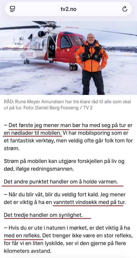 Brukte isskolen til NVE - kortversjon, la til litt og fikk ChatGPT til å lage det passe kort, og Konemor til å se over. Så det ikke blir for nerdete..🫣 Den korteste var: Nesten alle vann har farlige steder på isen. Den litt lengre kortversjonen: Nesten alle vann har farlige partier på isen. Isen er aldri lik overalt, og forholdene kan endre seg raskt. Derfor er det mer riktig å snakke om farbar is enn å spørre om isen er trygg – ved fornuftig veivalg og god vurdering kan isen være sikker å ferdes på. Den endelige versjonen som forberedelse ble: Nesten alle innsjøer har farlige partier, selv når isen ellers ser bra ut. Hver vinter havner rundt 50 personer i alvorlige situasjoner etter å ha gått gjennom isen, og noen omkommer. Derfor er kunnskap helt avgjørende for trygg ferdsel på is. Folk spør ofte: «Er isen trygg?» Det uttrykket har egentlig gått ut på dato. Det blir litt som å spørre om det er trygt å gå over veien. Det riktige spørsmålet er heller om isen er farbar. Med fornuftig veivalg, gode vurderinger og riktig utstyr kan isen være sikker å ferdes på – selv om det finnes farlige partier. Mange av disse farlige stedene kan finnes allerede på kartet. Innløp og utløp har alltid svakere is, særlig der det er strøm under isen. Trange sund, mellom øyer eller der vann presses gjennom smale partier, er også utsatt. Regulerte vann kan ha svake områder på overraskende steder, og bør studeres nøye før turen. Før du går ut på isen bør du alltid innhente oppdatert informasjon. https://www.varsom.no/is/isvarsling gir regionale isvarsler, mens https://iskart.no samler ferske observasjoner og kjente problemområder. Snakk også med lokalkjente – de vet ofte hvor isen er svak. Og husk: at du ser andre på isen betyr ikke nødvendigvis at den er farbar for deg. Brøyta baner: Dikemark og Harestua (Steinsfjorden har ikke lagt seg enda) Det finnes ulike istyper. Klar stålis er den sterkeste, mens sørpeis er betydelig svakere. Mørk is er som regel bedre enn lys. Isen kan vokse raskt i streng kulde, men snø og overvann kan stoppe veksten helt, selv etter flere kalde dager. Vær ekstra oppmerksom på skillelinjer i isen – synlige overganger i farge, struktur eller snødekke. Her kan bæreevnen endre seg brått, og istykkelsen må alltid sjekkes på nytt. Til slutt: riktig sikkerhetsutstyr redder liv. Isstavfor å sjekke isen, ispigger rundt halsen, kasteline og varmt tøy i vanntett pose er helt grunnleggende. Gå gjerne flere sammen, men stol alltid på egne vurderinger. Is er aldri «trygg» overalt – men den kan være farbar dersom du tar riktige valg.- 4 svar