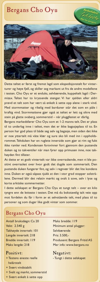 Ja, det er en mulighet. Men kan ikke se så mye de kan forbedre. Det er barduner - som jeg har skiftet. Plugger som er det enkleste. DAC teltstenger er jo alltid et pluss. Resten av teltet er slik jeg ser det veldig bra laget. Faktisk forbausende bra. Ikke mye å hente på vekta heller, siden det er pustene. Funker ikke så bra med sideåpning på et telt som skal stå i vind. Har du ikke noe som støtter veggen, blir det bare en blafrepakke. Hadde jeg ikke vært så lang hadde det garantert blitt med videre. -