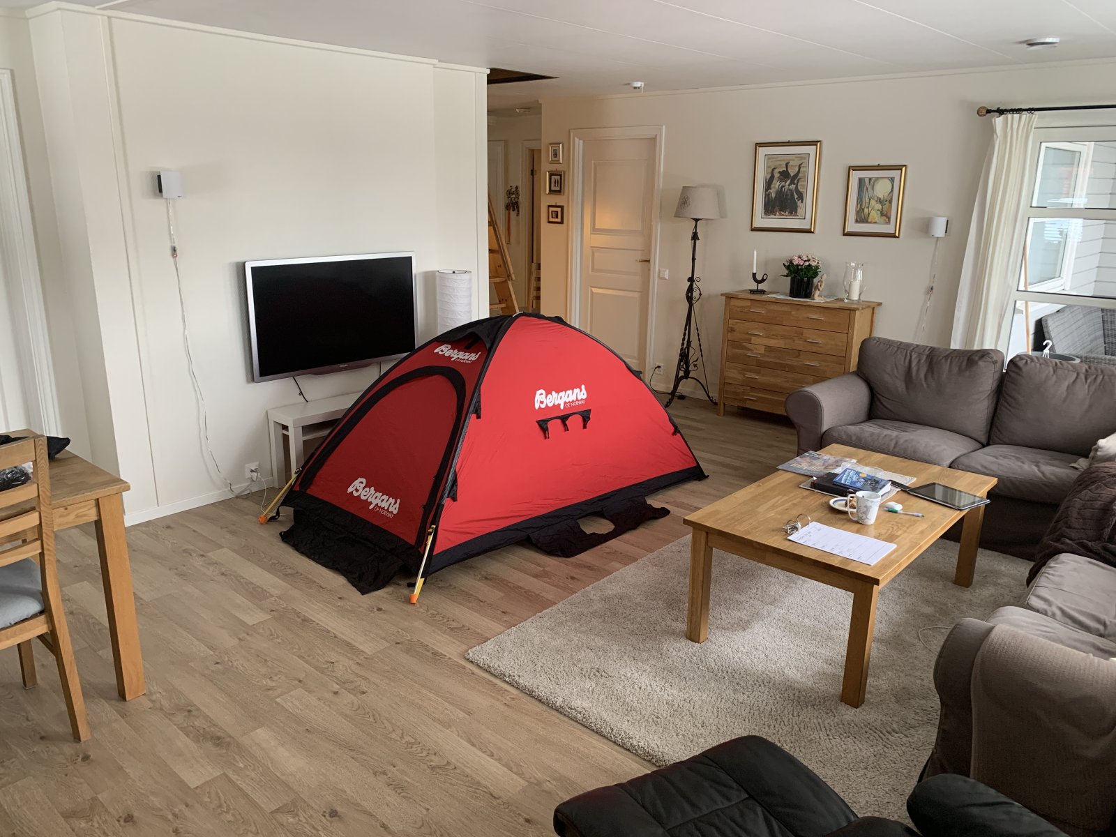 Det er vel Obligatorisk med å legge ut bilde av telt i stua, og værtfall når du har 2 samtidig. Fikk besøk i dag, skulle bytte et telt mot et annet. Jeg hadde slått opp et par av mine så han skulle få testet litt annet samtidig, som seg hør og bør når to telt nerder møtes. Trolltind blir høyt og stort i forhold. Bare Mil 1. Han fikk også en titt på Duplex og Zpacks tarpen😀- 9 svar