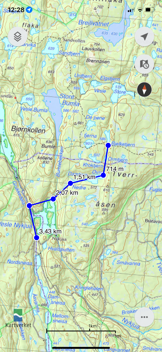 Gode tips, spesielt dette med å sjekke hyppig i etterkant av usikre stivalg/ stikryss. Dette er jo en svært vanlig problemstilling dersom man går Finnemarka på langs over Pene Tjerna - Nykua. Det finnes ikke stivalg for strekningen jeg nevnte så jeg valgte å følge gammelt bondevett, aka: jeg fulgte vannet nedover (med høydeforskjell er det relativt enkelt…). Det er ofte vellykket navigasjonsmessig, men ulendt og tråkete rent fysisk. Endte ned et litt ekkelt juv hvor sikkerhetsmarginene ble litt små etter min smak. For de som måtte være interessert kan man heller krysse marka over Hovlandsfjell. Det er mye enklere på alle mulige måter. Har selvsagt gått feil også der, men da ender man ute på myra heller enn i ekle juv… i nøden spiser selv fanden fluer… Finnemarka Nord er nydelig, men navigasjon og gjengroddhet forblir åpenbare utfordringer der inne. Sverger til kart og kompass så jeg forsøker å la være å ty til mobile løsninger på tur, men har selvsagt med i tilfelle ulykker og nødsfall. Legger ved strekningen jeg finner for slitsom for min smak (røffelig gjengivelse):- 108 svar