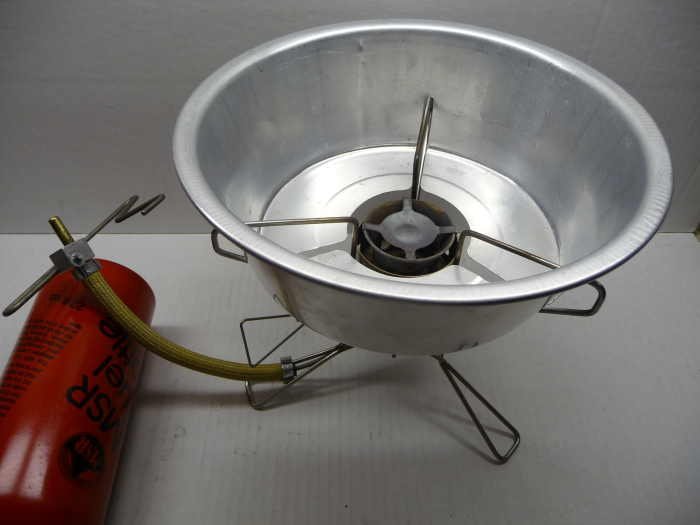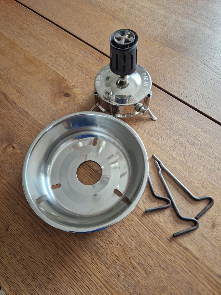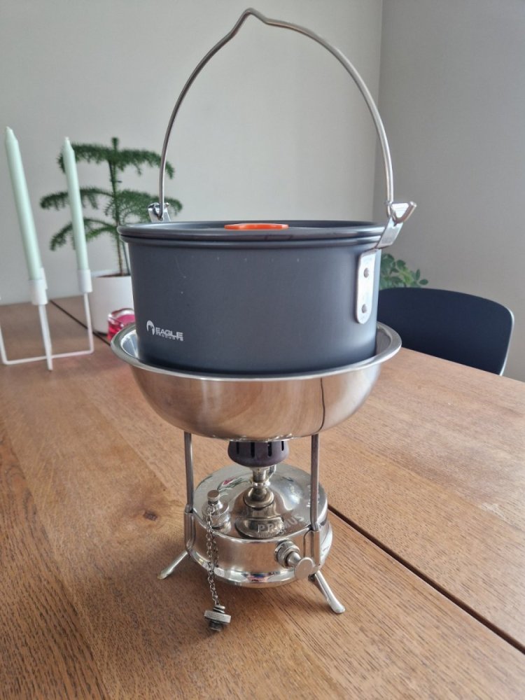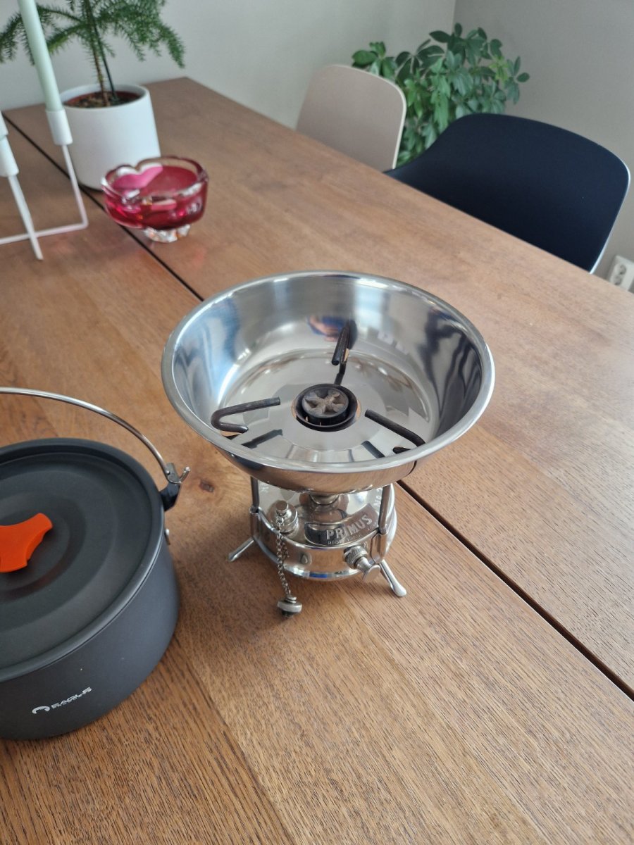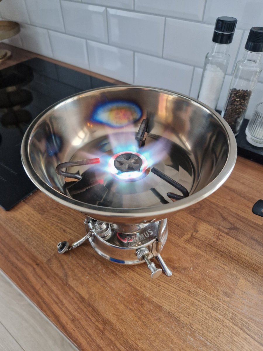 Det funket overraskende bra 😆 1L vann @ 11c, romtemp ca 22c. Uten vindskjerm; 4min40sek Med vindskjerm; 3min27sek Samme flatbunnet kjele ved begge forsøk, full rullende kok. kjelestøttene er av svartstål så de er neppe happy med den økte temperaturen. Spørs om en må bøye til et sett i ASI304. Nå konkurere den med dagens multifuels og tåler vind bedre 😂