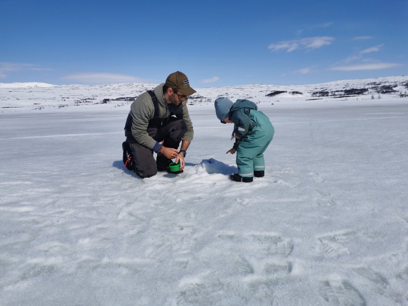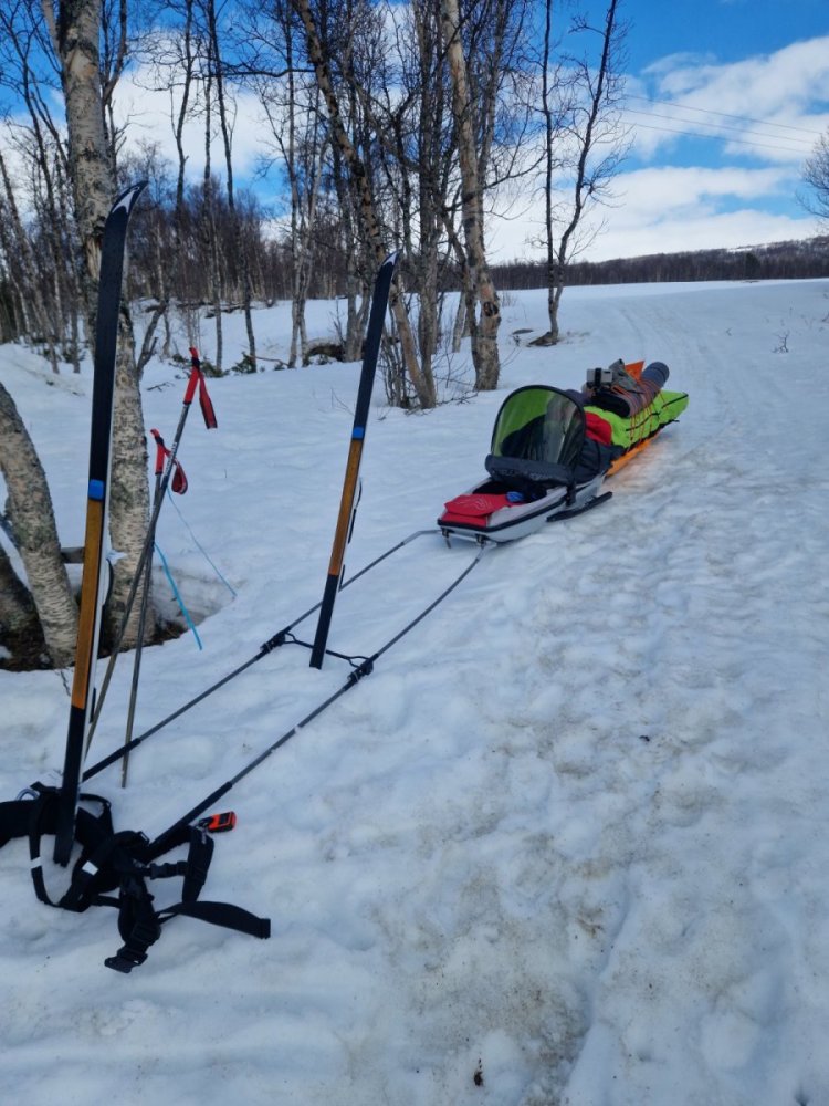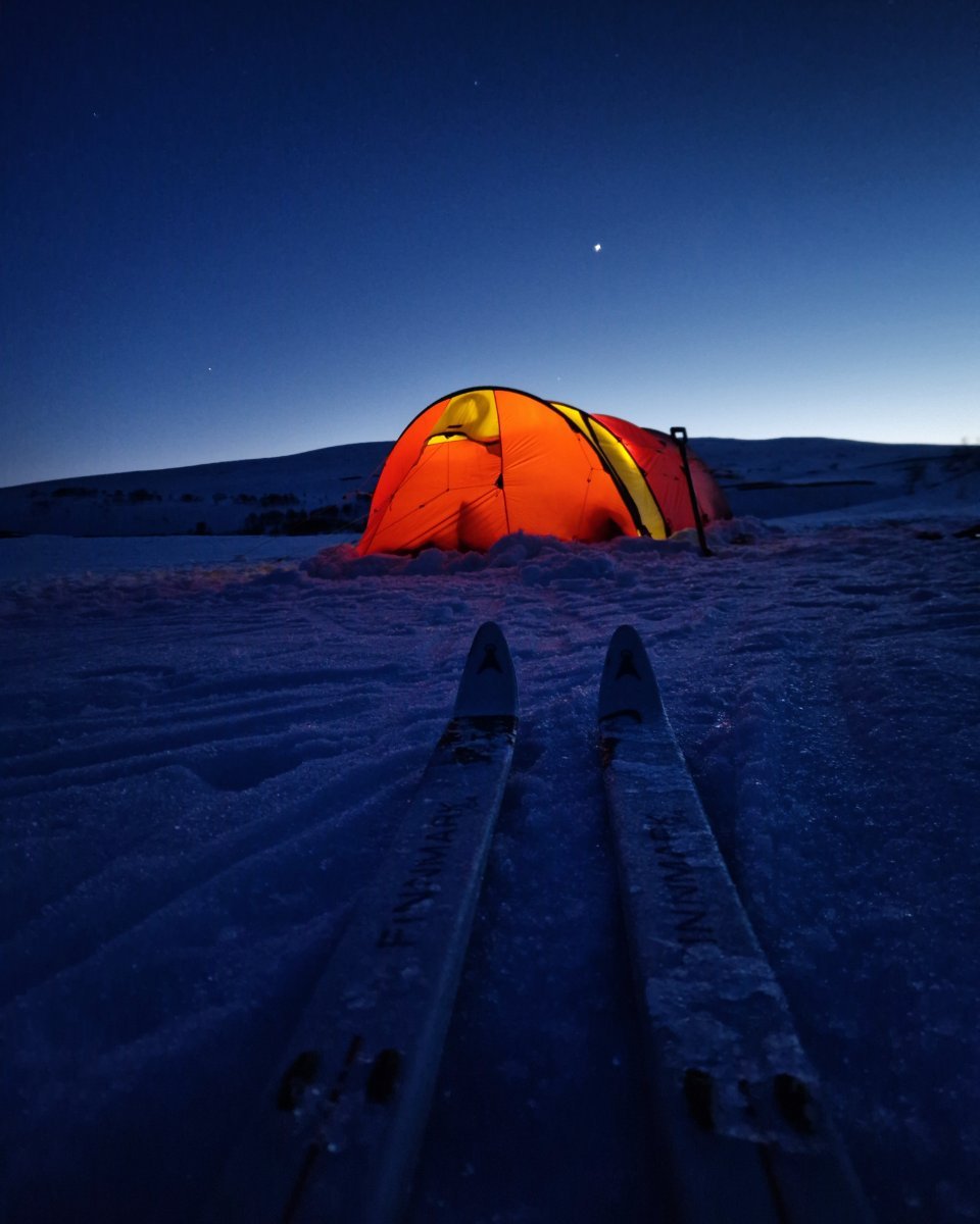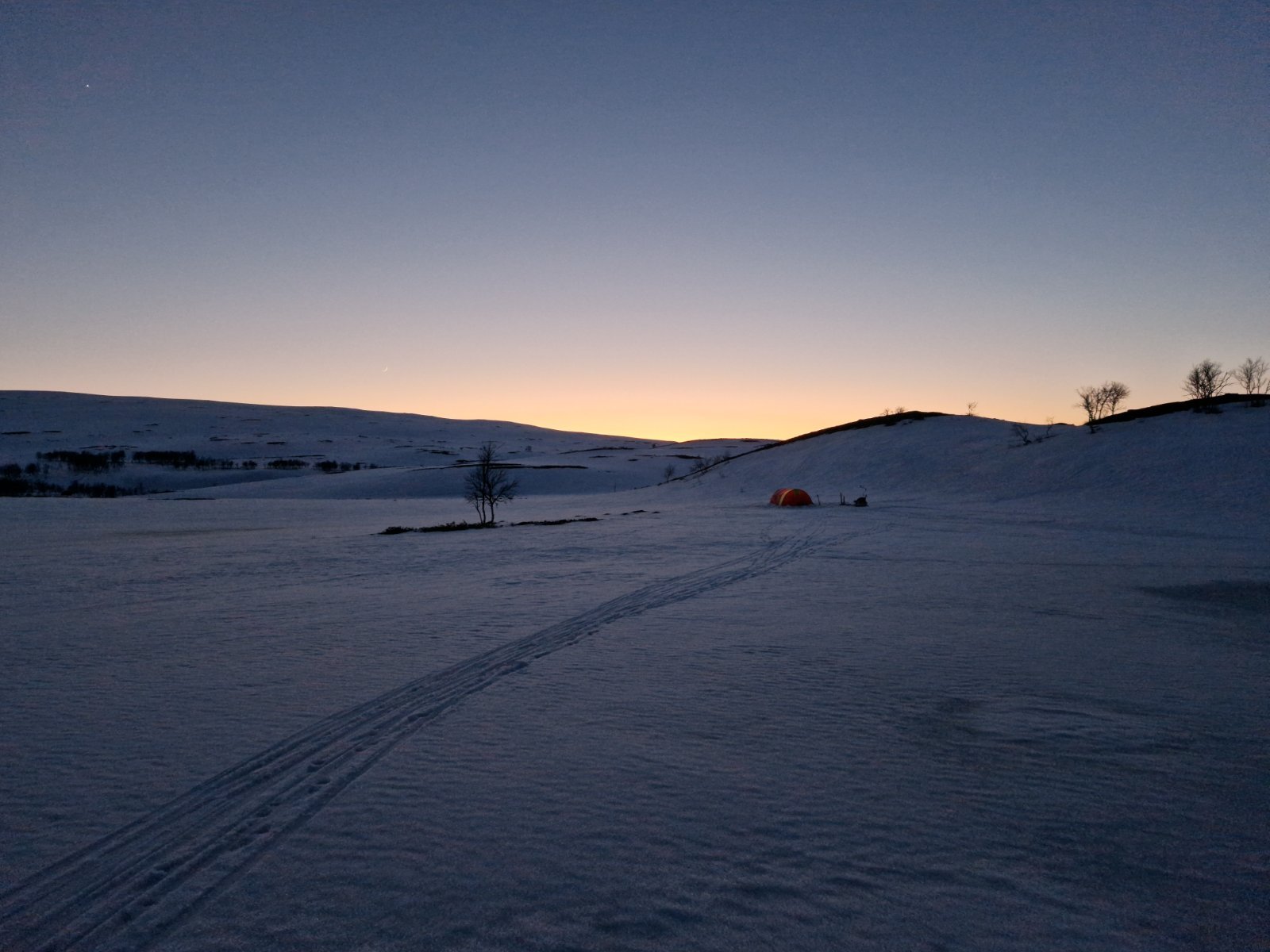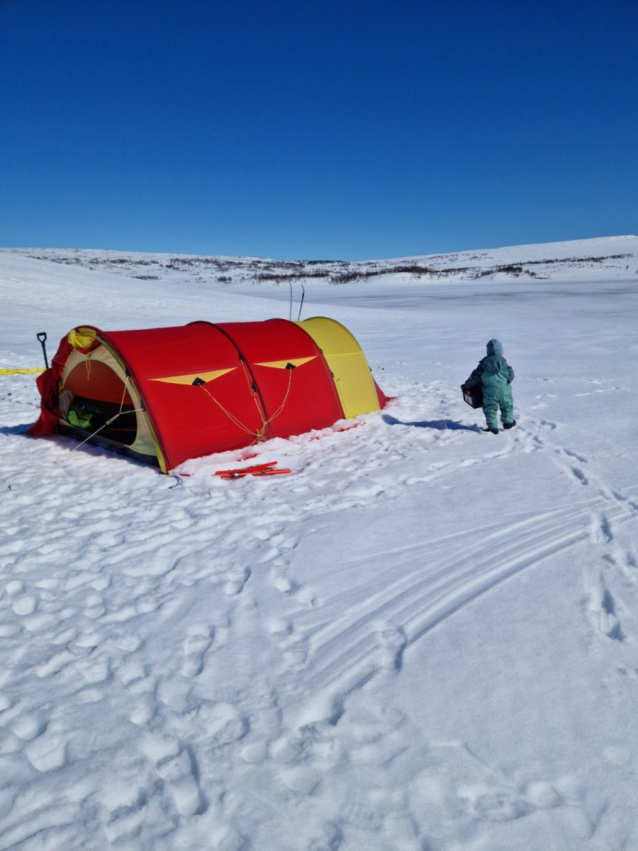 Liten helgatur i Rørosfjellan med junior. Hunden ble hjemme denne gangen, han hadde allerede vært ute 4 dager på rappen så han hadde fått nok dose sollys(ikke snøblind, men litt øyeverk). En litt kul samt unødvendig funksjon på spitsbergen, men veldig kurrant når det er fint vær. Bare hive inn bedding og diverse uten å måtte dra det inn døra. Klart for isfiske!Det går mot kveld. Ut å sjekker nattkroker. Synger godnattsanger å drikker solbærtoddy.Kvelden bydde på en vakker himmel, når mørket kom ble det helt stjærneklart. Mine fotokunskaper eller mobil klarte ikke å fange det.Dag 2, avslapping i teltet. Ungen ligger til tørk😅Litt av målet med turen var at jr. skulle få fisk, å det lykkes vi med. En fin ørret på 300-400gram gikk på en av nattkrokene. Ellers var det ikke mye liv å spore.Vel nede igjen til bilen, pulken sikres så den ikke sklir ned på grusveien. Alt i alt en vellykket tur, som ikke var av den lengre sorten. Vi fikk sett ryper og fjær, lekt med steiner på barflekkene, laget karamell-løype(vi benyttet marsmallows), isfisket og generelt kost oss.