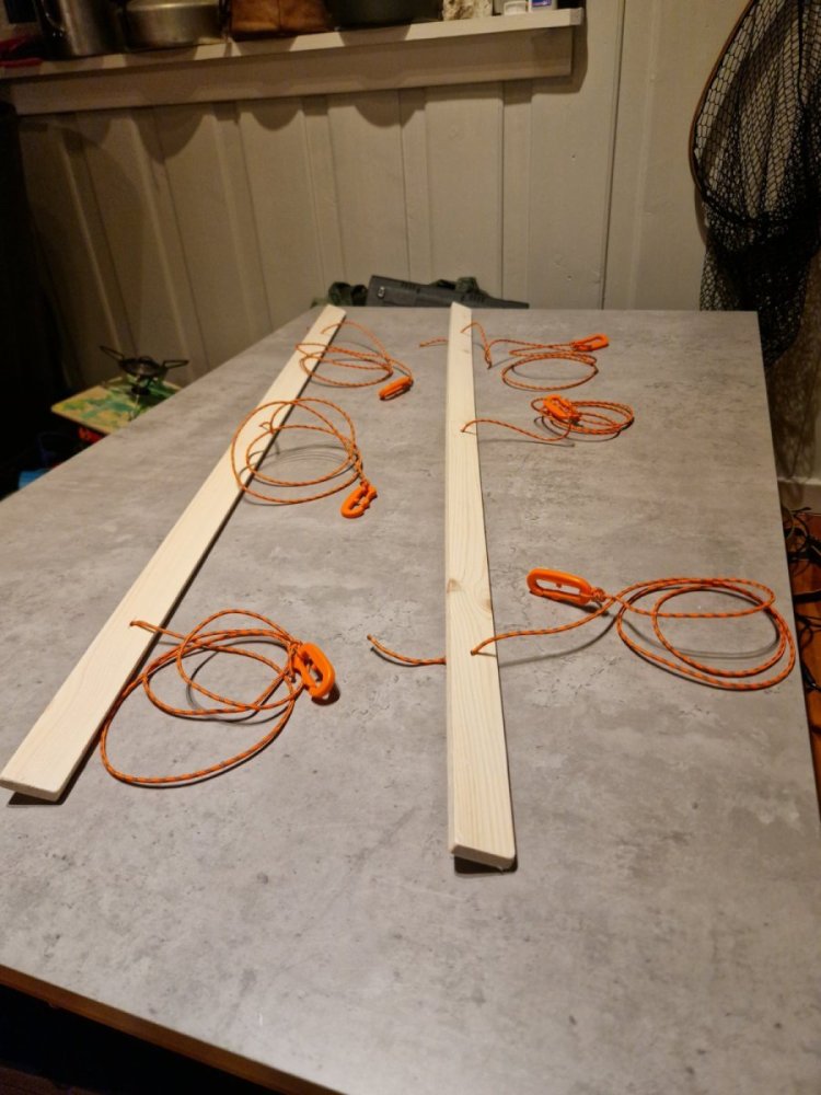 17. Er som regel på tur alene med hund eller guttungen på snart 3. Ingen av de er spesielt nevenyttige når teltet skal opp. Bruker et spitsbergen 3, som har del jobb på langsidene. Det er her det går mest tid. Liker å benytte meg av alle bardunene så jeg slipper å stå opp midt på natta for å sikre teltet ytterligere eller løse barduner som henger å slenger. Satt å tenkte litt hvordan kan jeg få dette til å gå kjappere enn vanlig (ski og staver liker jeg å ha tilgjengelig, brukes bare hvis de må). Fikk taki et par strø på litt over meteren, borret opp hull for 3mm paracord, fikk en runde med treolje for å hindre fukt, kuldebestandige plastkroker som er lett å smette bardunløkka inni og ca 1.30 med paracord. Tanken er å bare hekte innpå 3-4 barduner på langsiden, strekke ut å grave ned å dekke med snø. Jeg har I allefall trua, de vil ta betraktelig mindre plass enn feks 6 plugger.